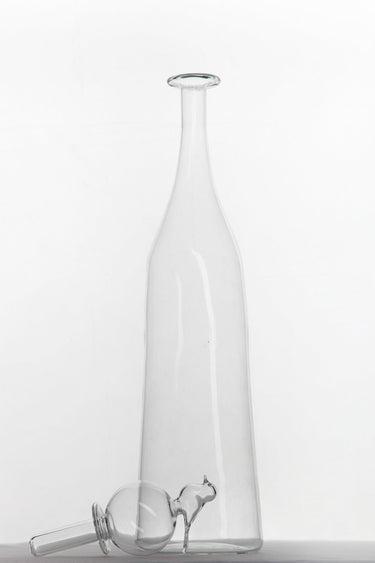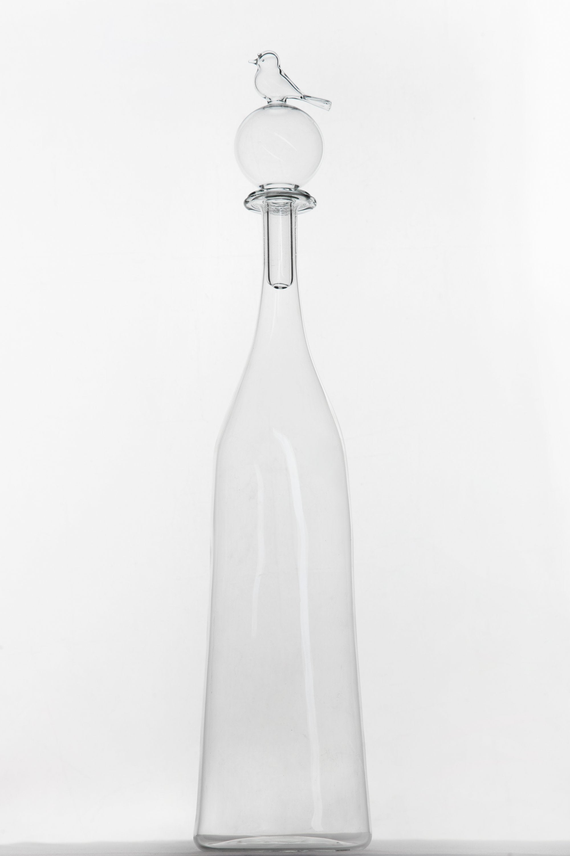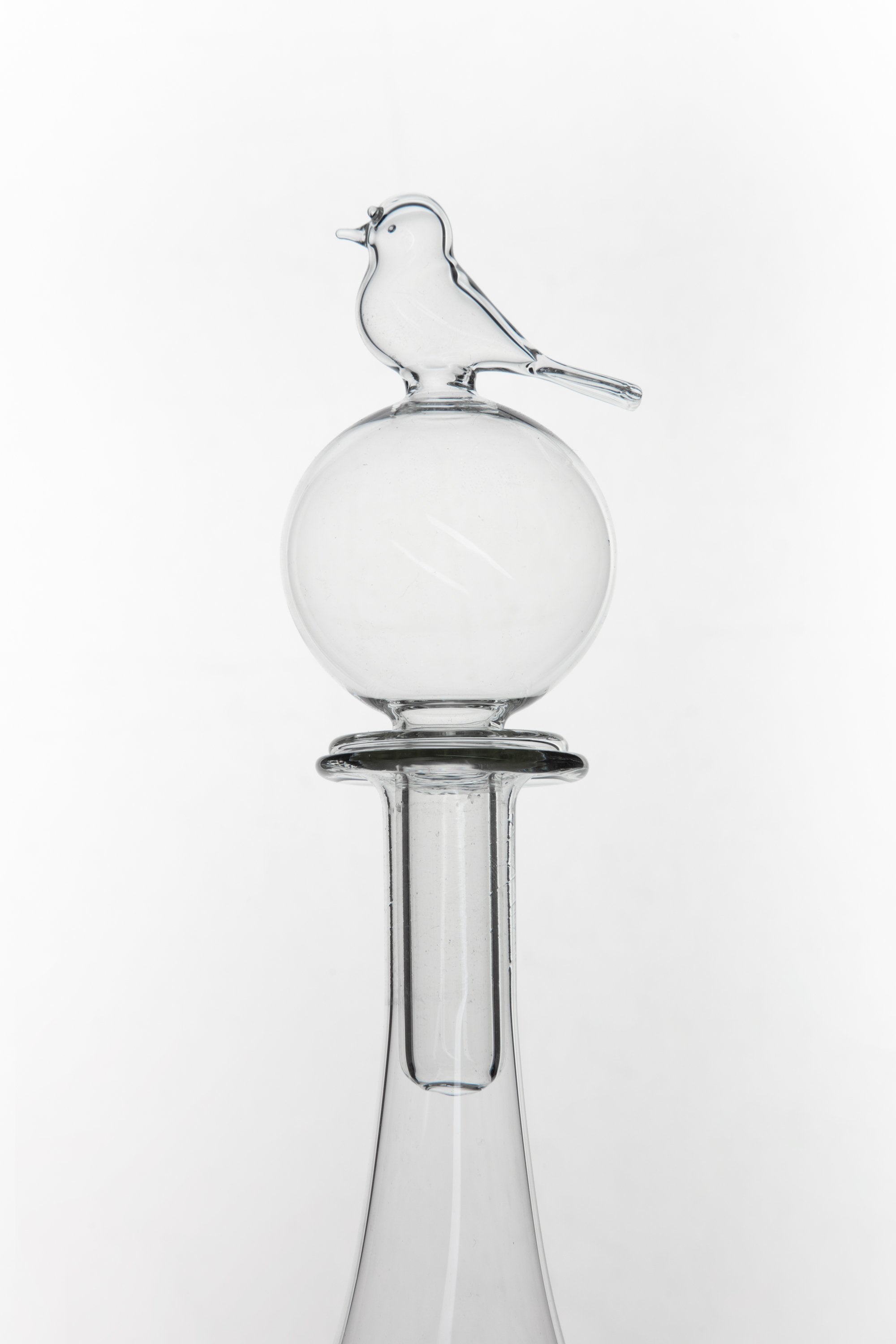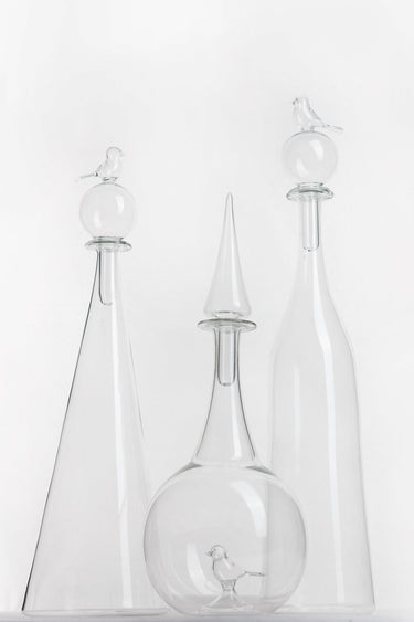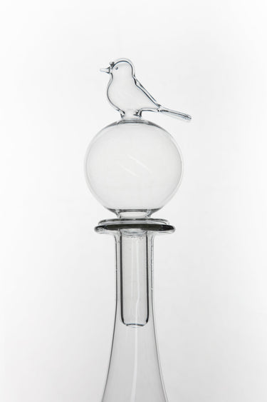 Handmade in crystal-clear glass featuring a captivating bird sitting on top of a round glass stopper. A beautiful presence when filled or simply on display.