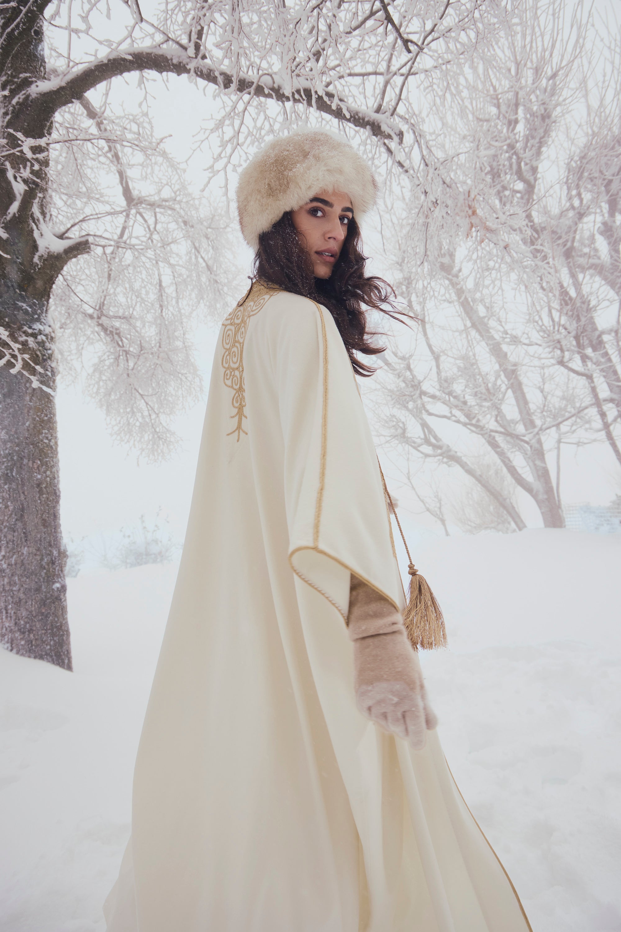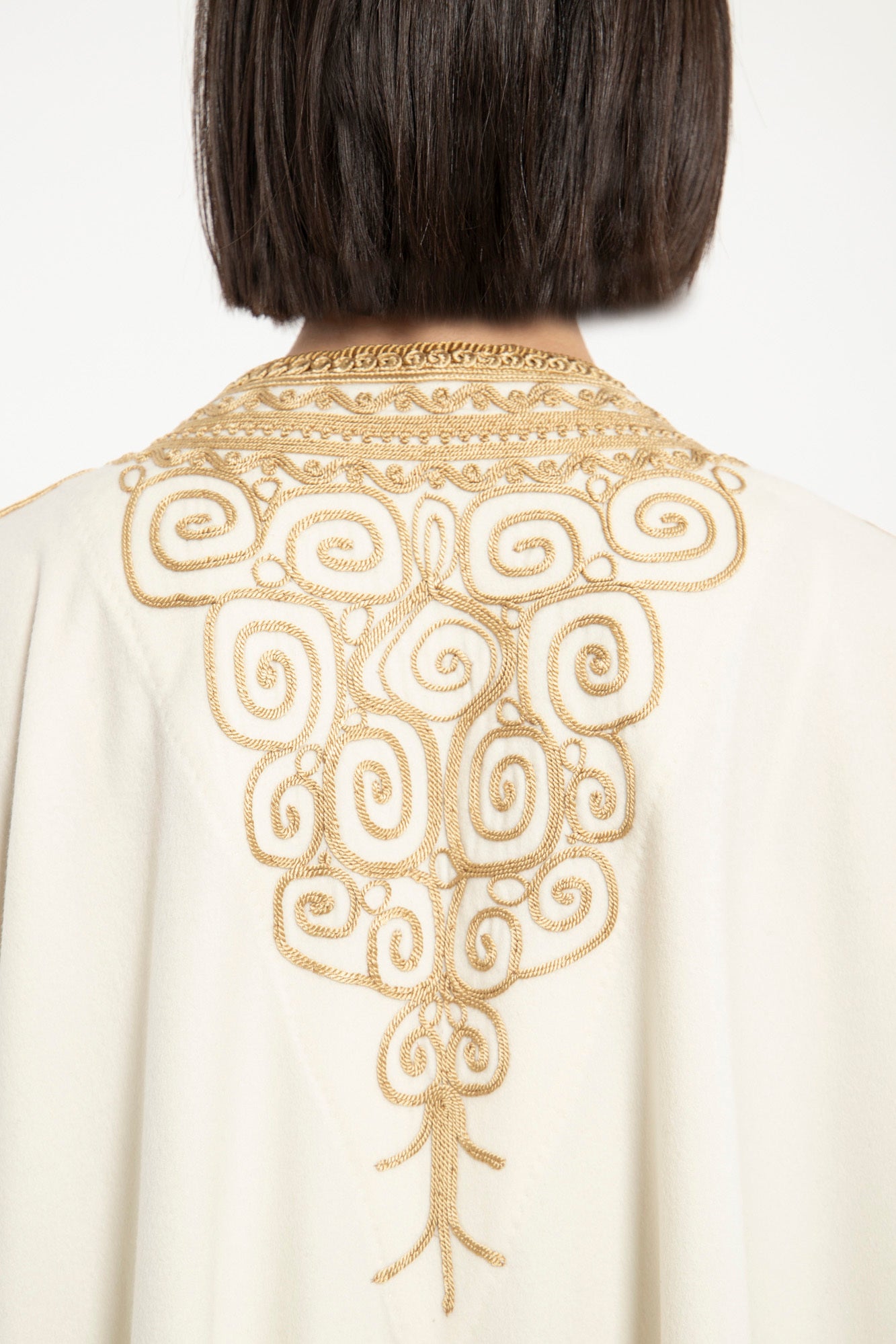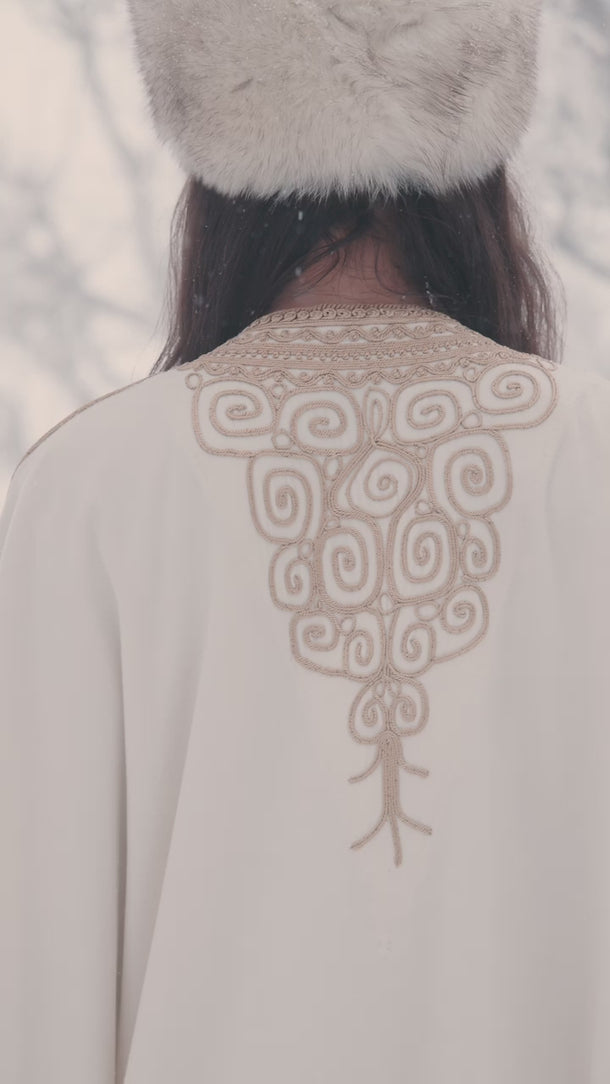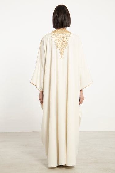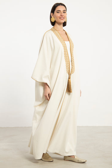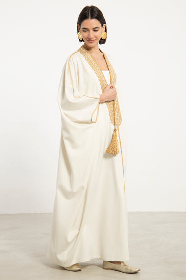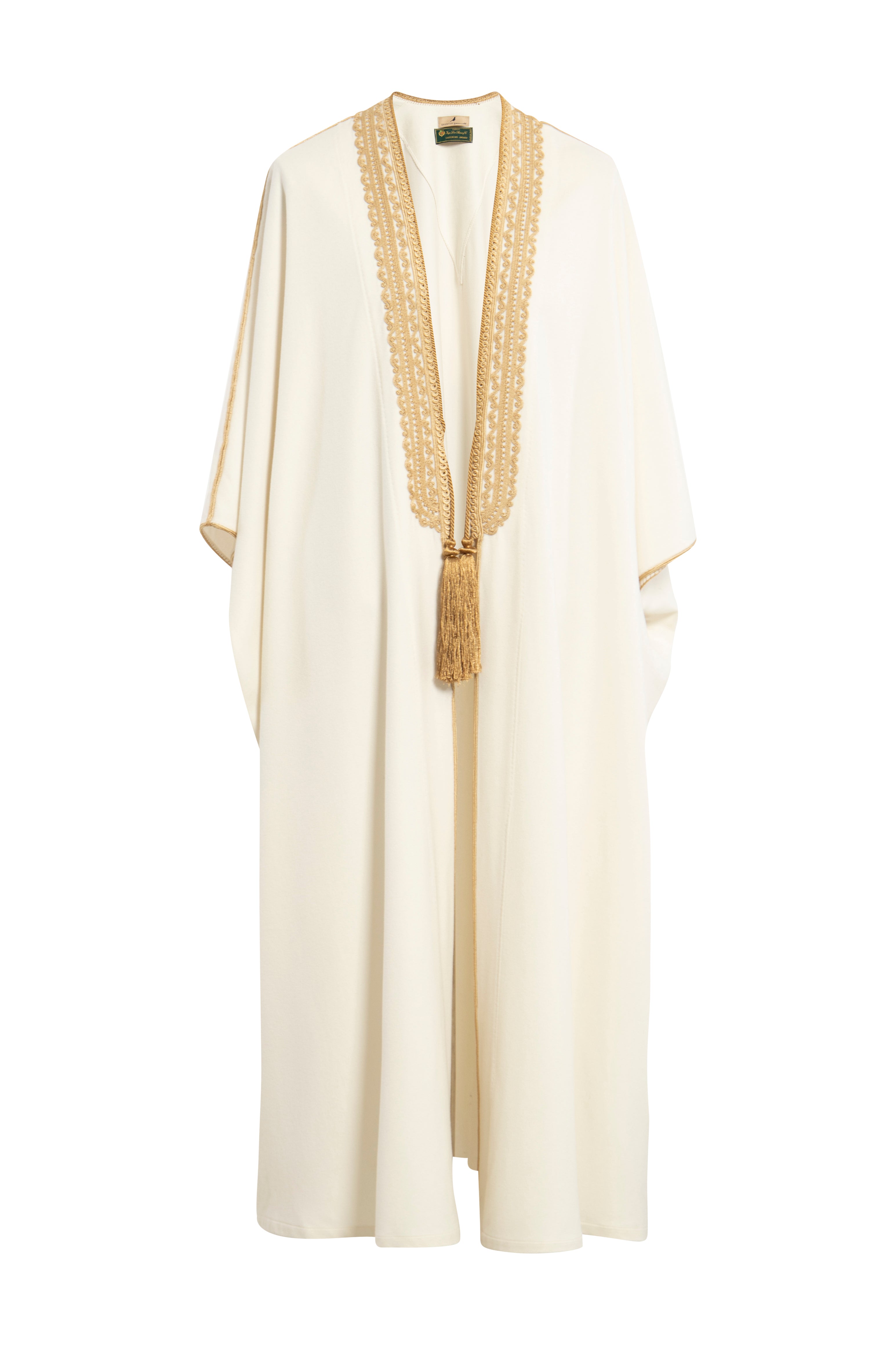 The abaya is cut in a refined ivory color, elevated with embroidered borders and tassels. Designed with wide sleeves and a flowing silhouette, it combines timeless elegance with modern detailing.