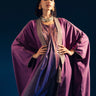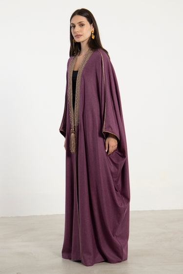 This garment is crafted with cashmere fabric made in Italy by Loro Piana. It features a soft drape and a refined purple hue. Embroidered trim and tassels lend a grounded elegance to its fluid silhouette.