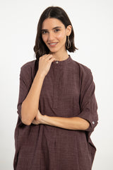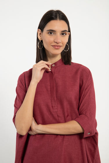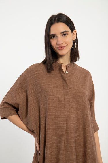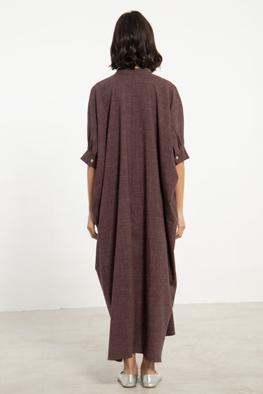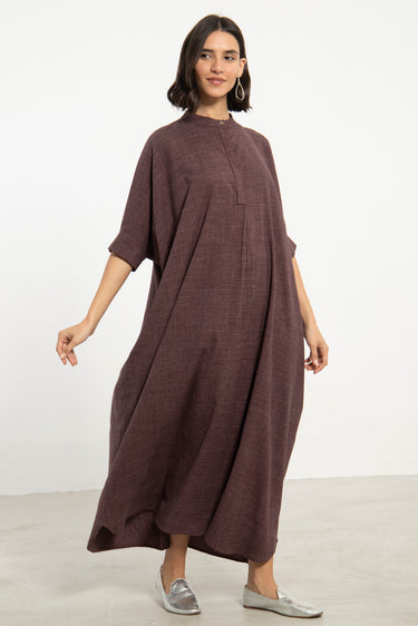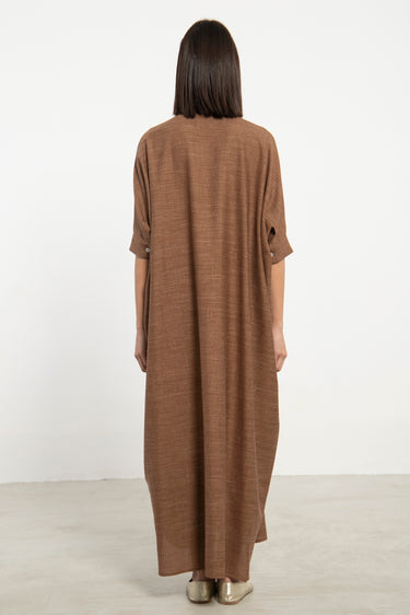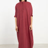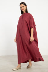 Details: Relaxed ankle-length dress with mandarin collar, front placket, and side buttoned sleeves
