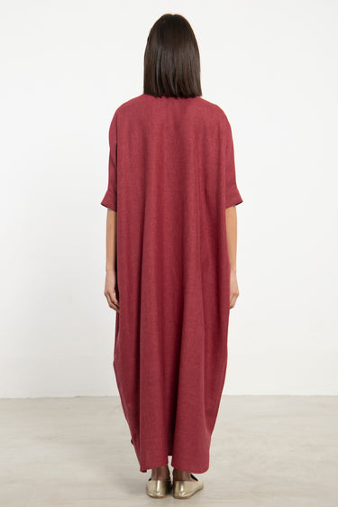 This garment is crafted with fabric made in Italy by Loro Piana. Lightweight yet luxurious, the Helen dress is cut from a refined blend of wool, silk, and linen. With its fluid silhouette, mandarin collar, and subtle side draping, this timeless piece is designed for elevated everyday wear.