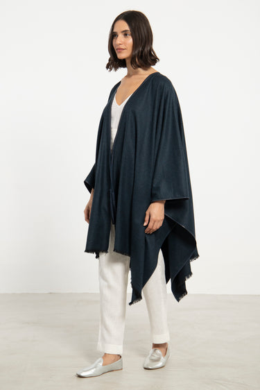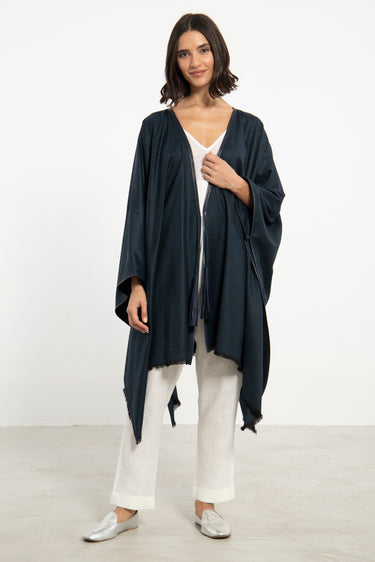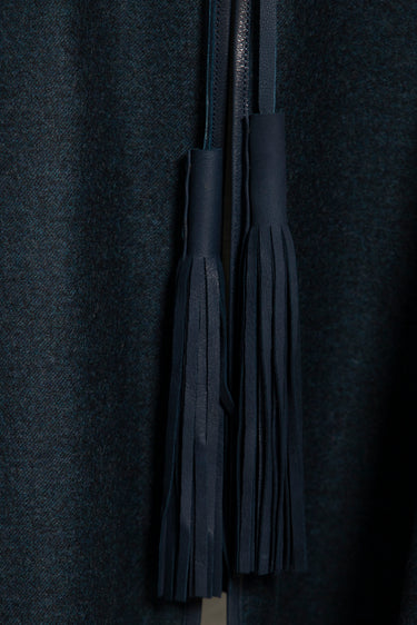 This garment is crafted with wool and cashmere fabric made in Italy by Loro Piana. It features a soft drape. Leather trim and tassels lend a grounded elegance to its fluid silhouette.