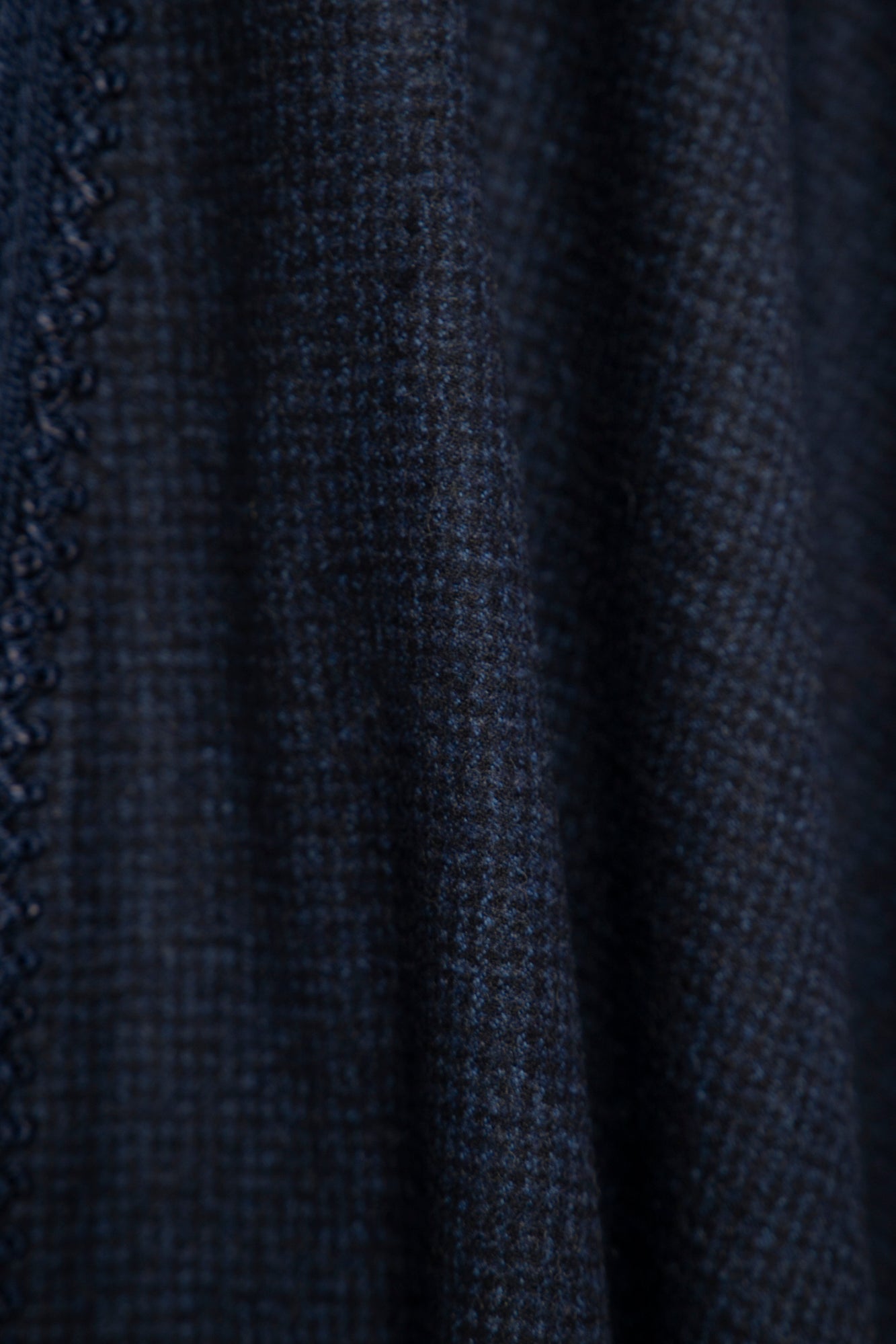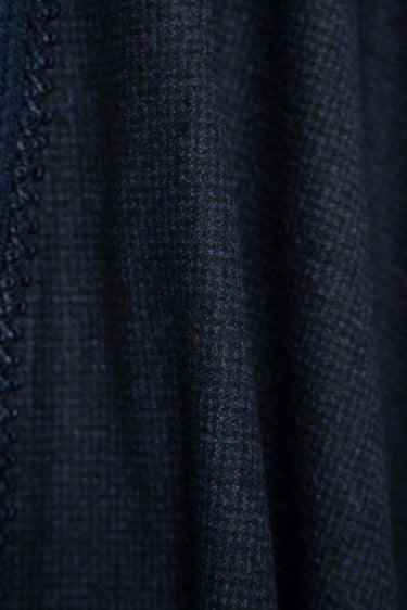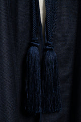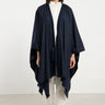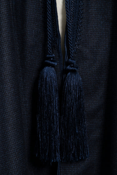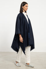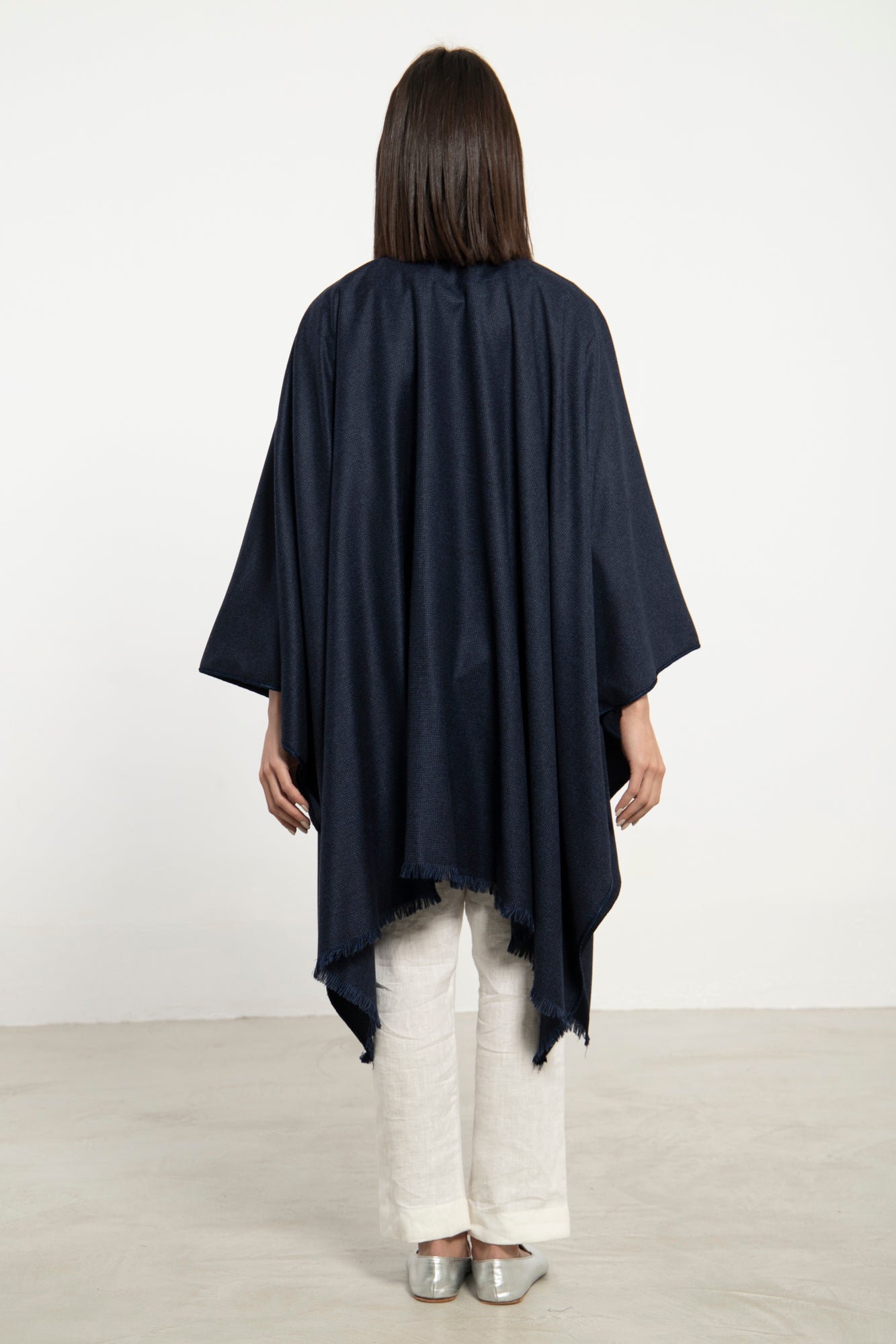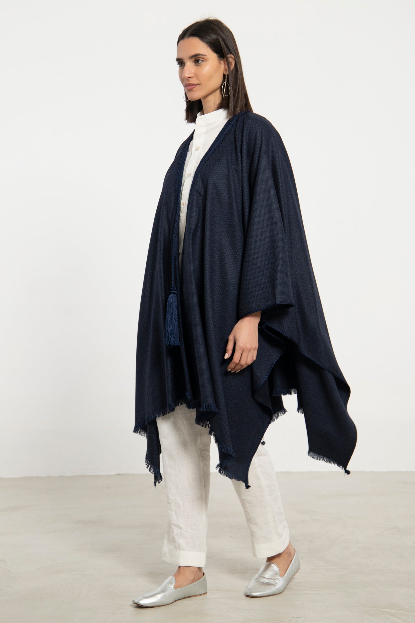 This blue poncho drapes effortlessly with a soft, structured fall. Finished with delicate fringe trim and a tonal tassel tie, it blends timeless elegance with refined comfort.