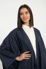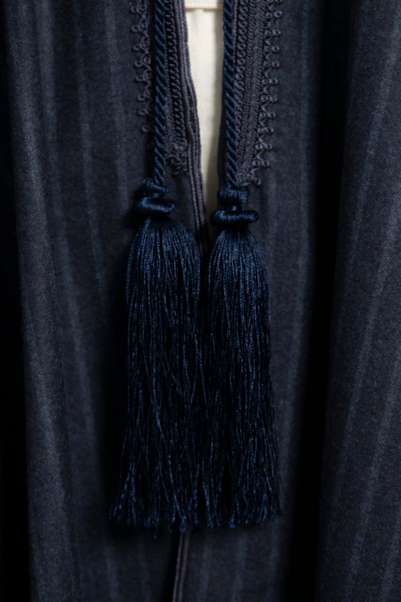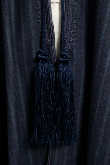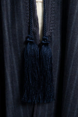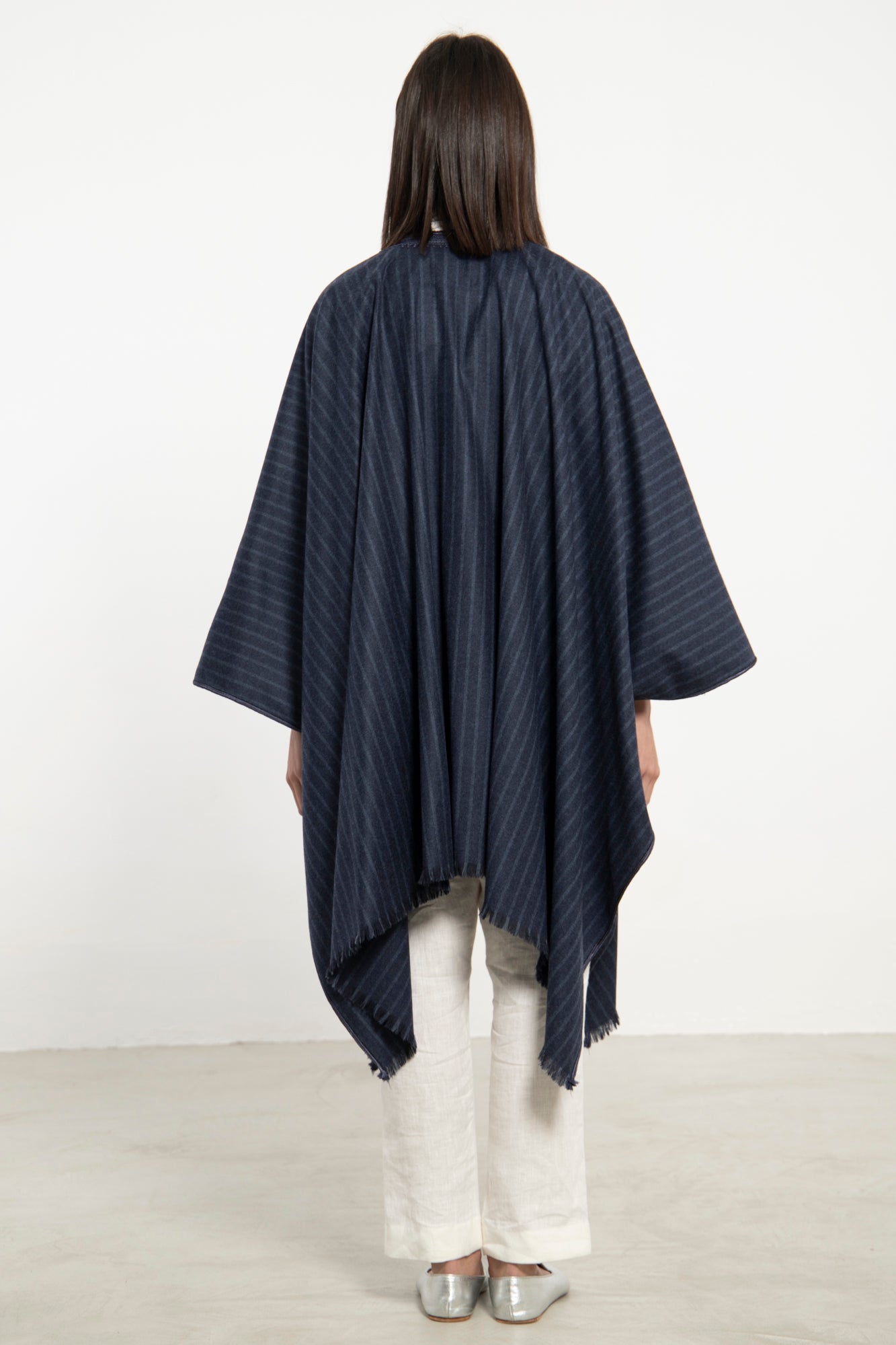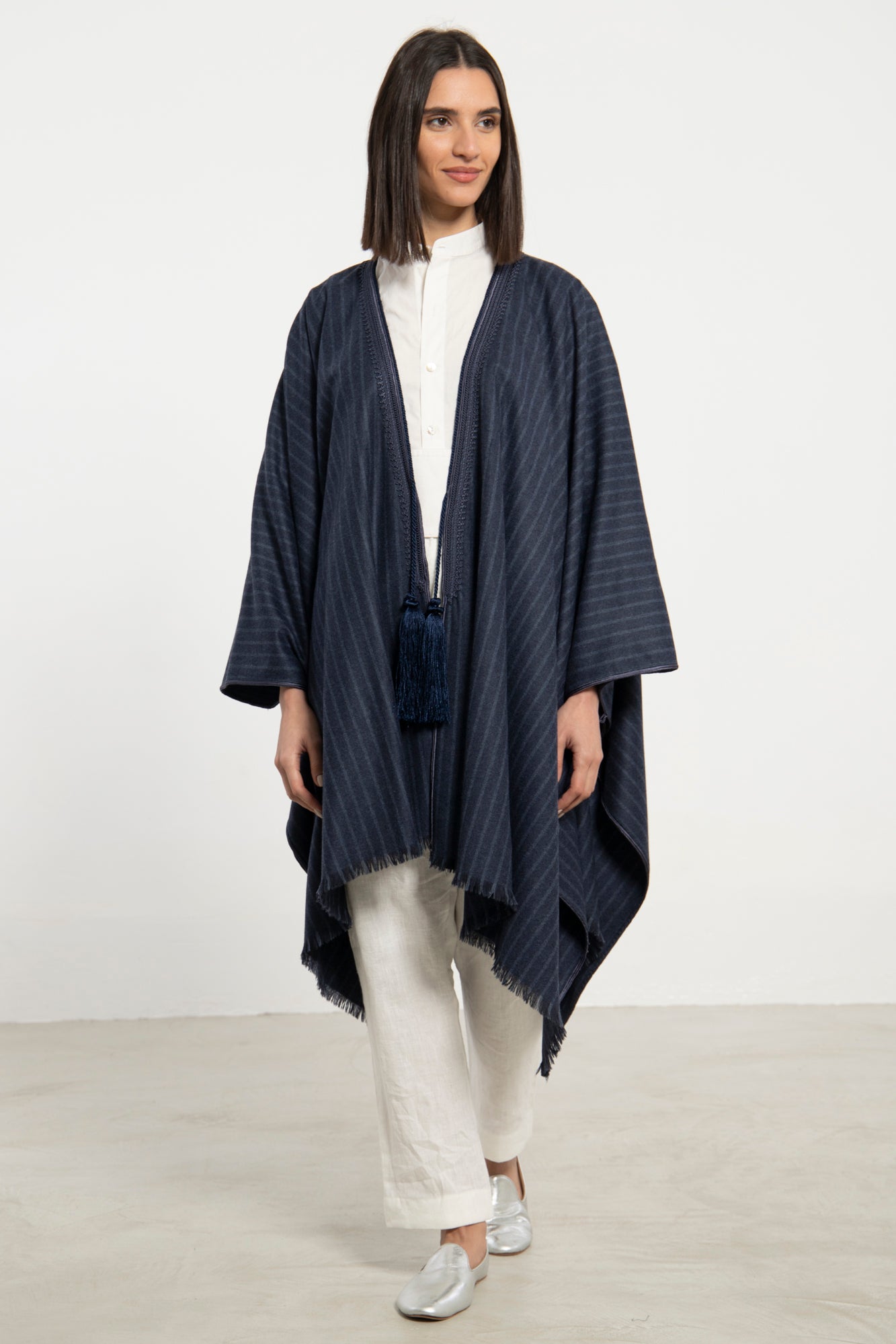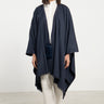 This blue poncho drapes effortlessly with a soft, structured fall. Finished with delicate fringe trim and a tonal tassel tie, it blends timeless elegance with refined comfort.