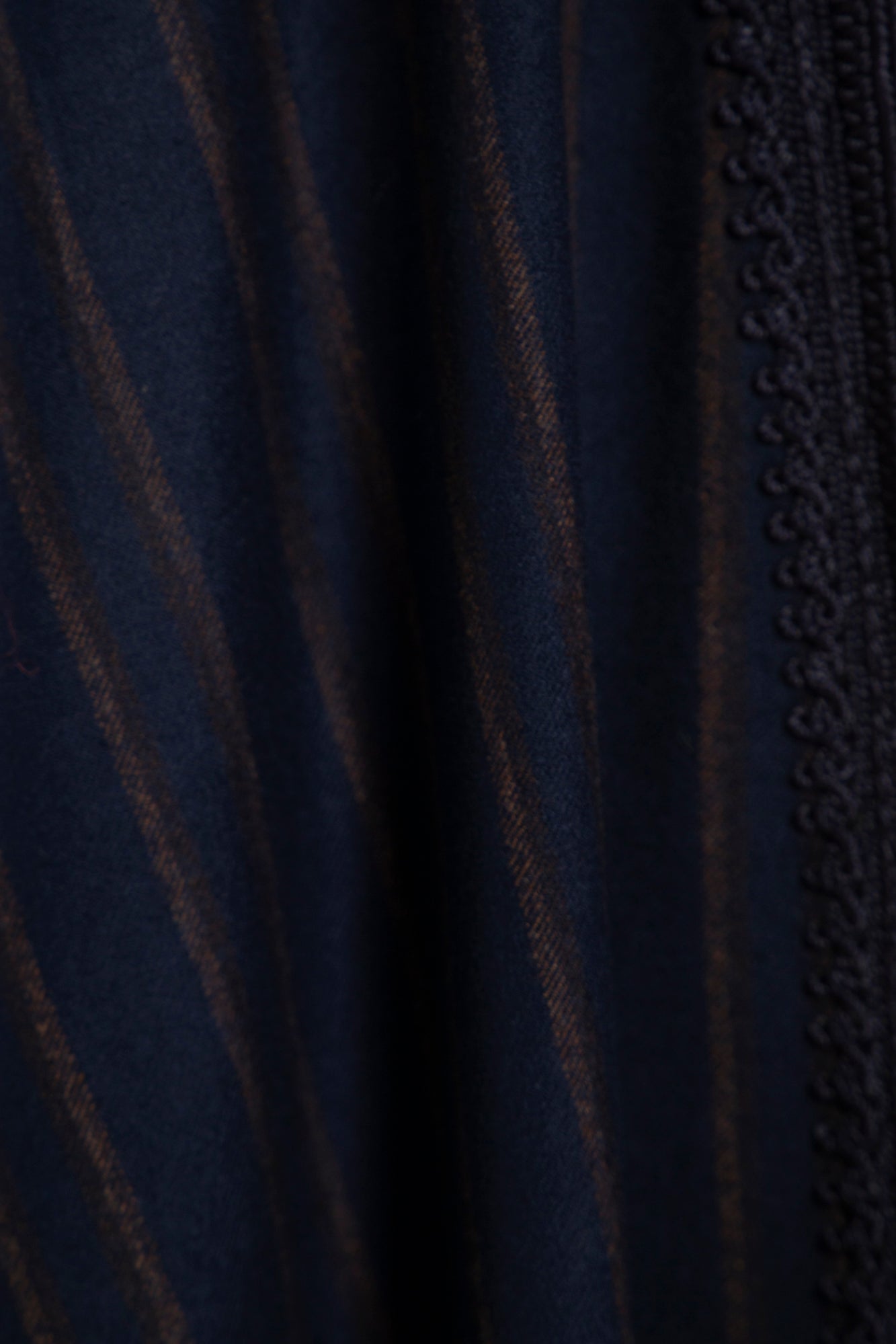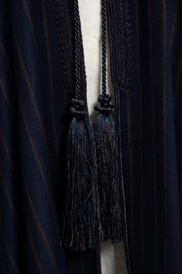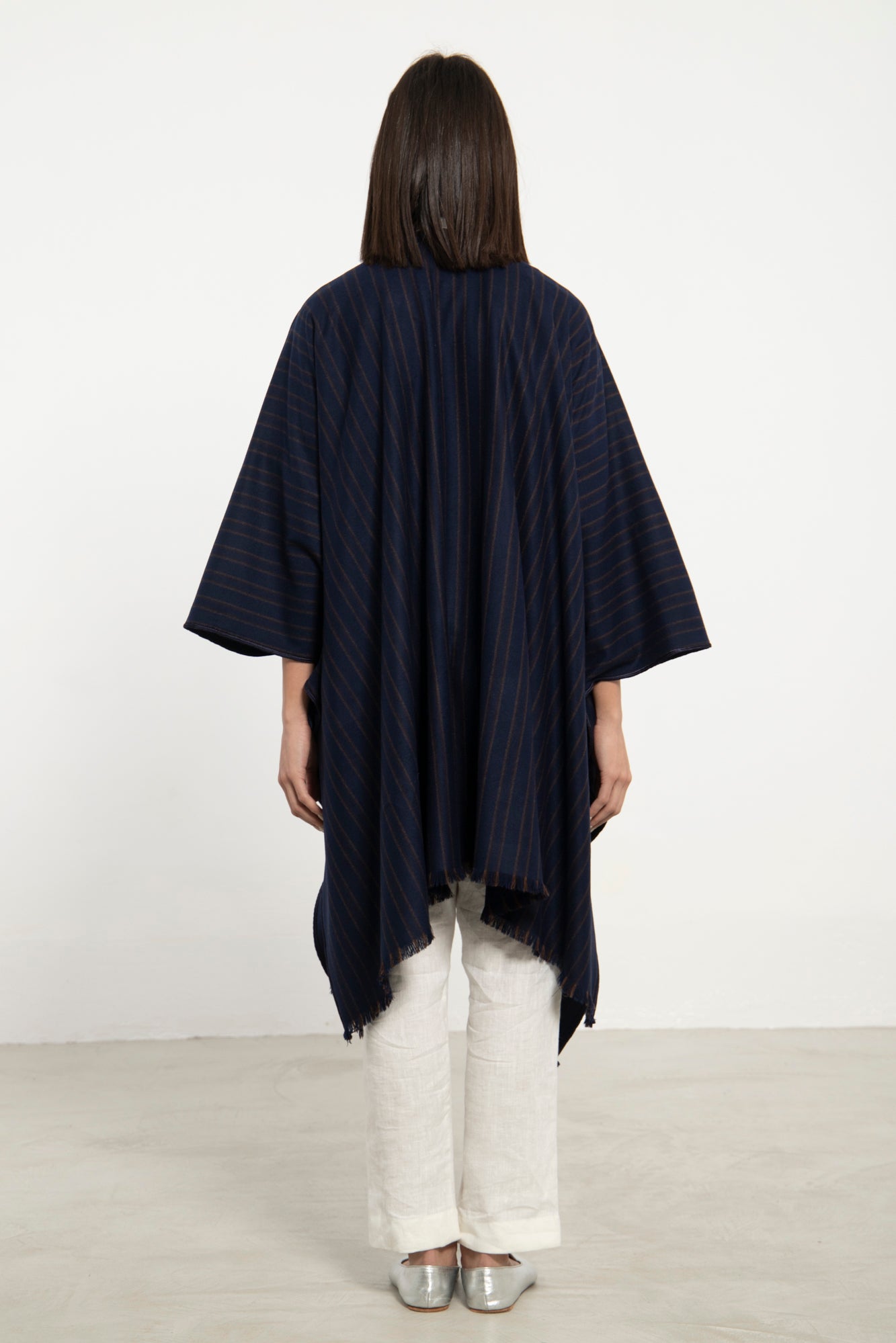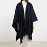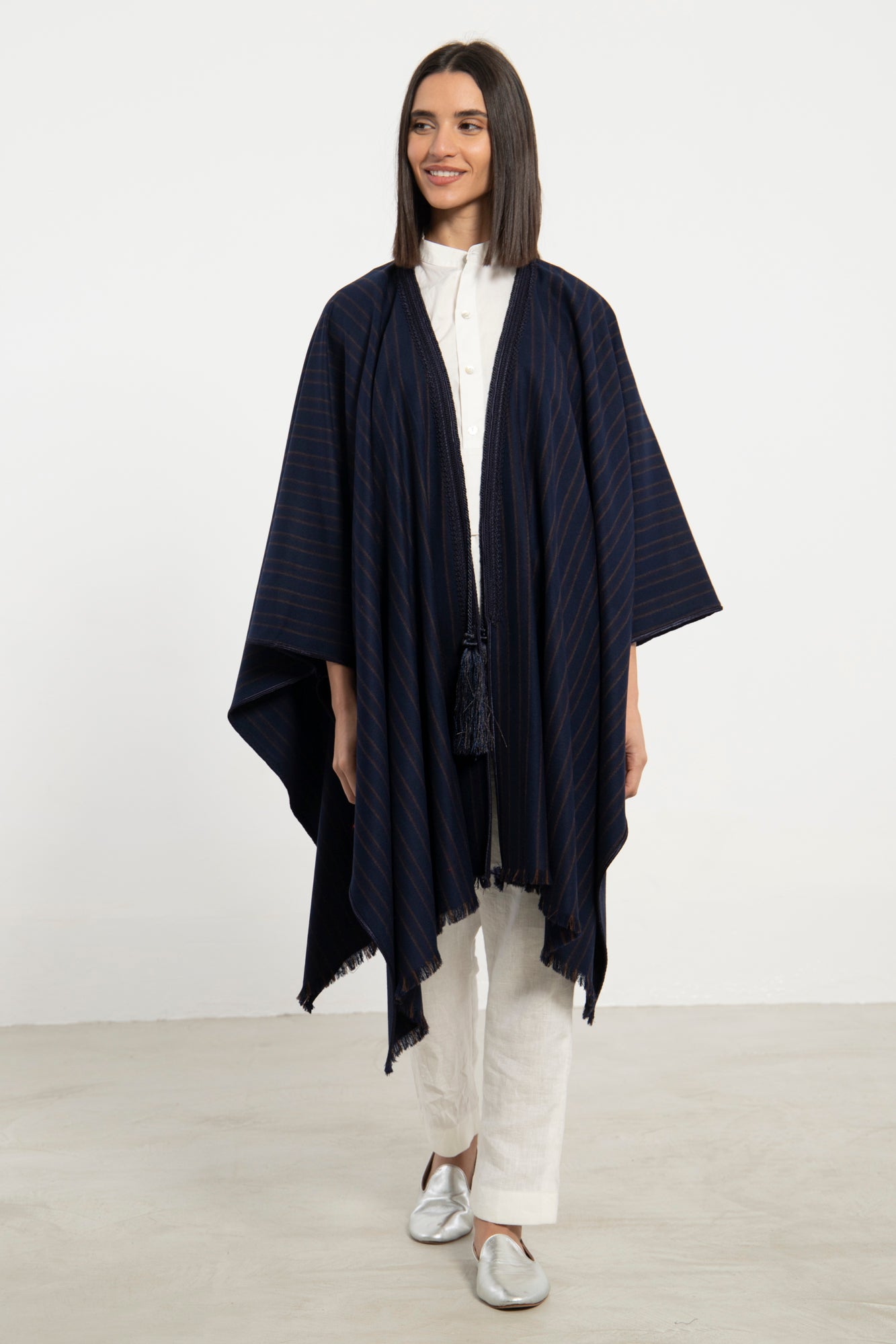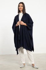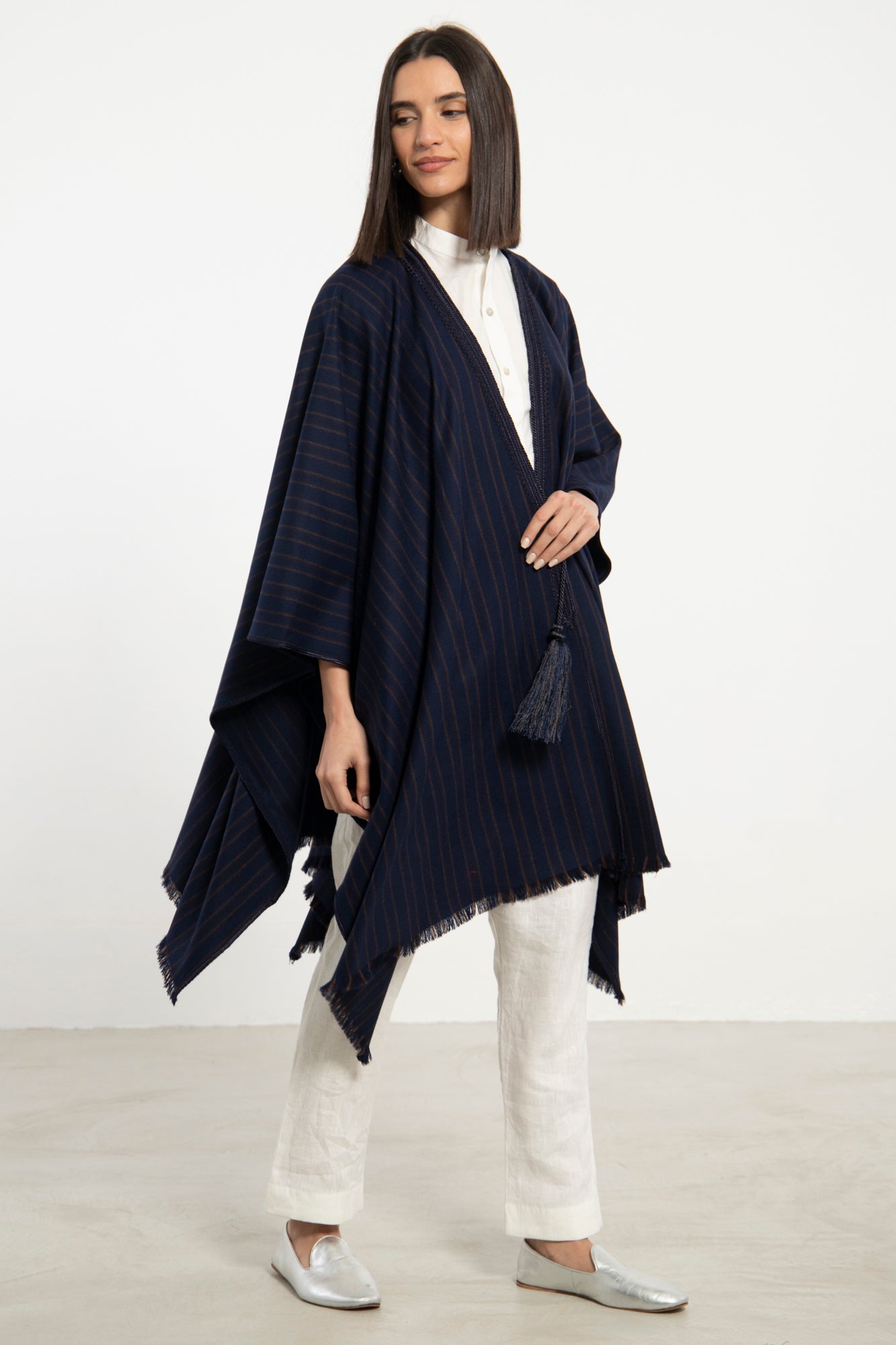 This blue poncho drapes effortlessly with a soft, structured fall. Finished with delicate fringe trim and a tonal tassel tie, it blends timeless elegance with refined comfort.