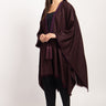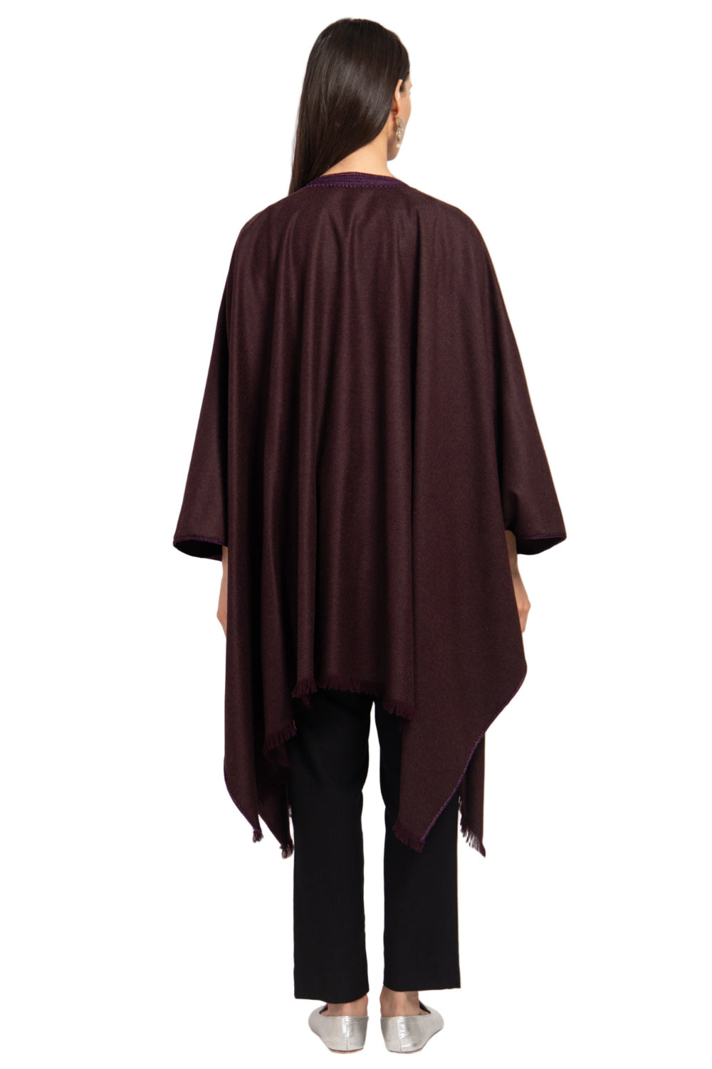 This burgundy poncho drapes effortlessly with a soft, structured fall. Finished with delicate fringe trim and a tonal tassel tie, it blends timeless elegance with refined comfort.