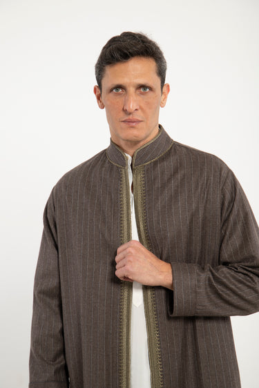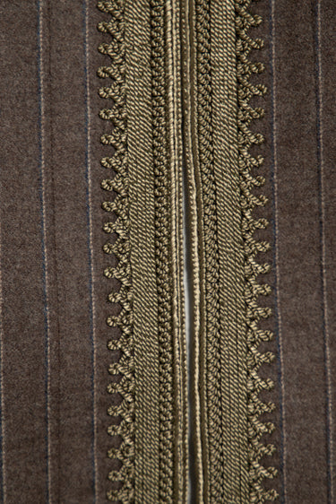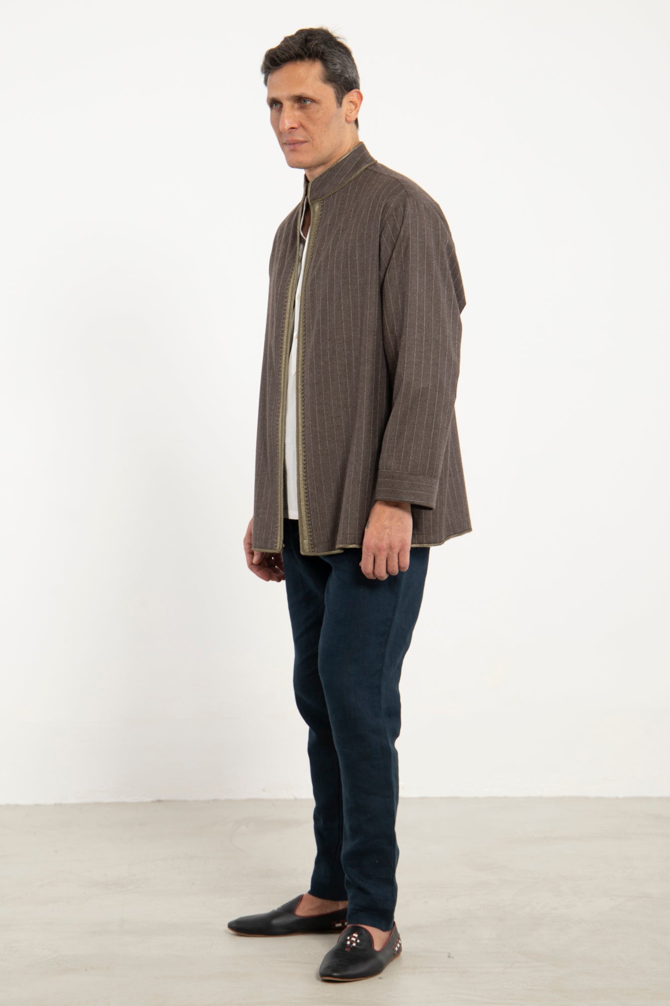 Details: Mocha pinstriped jacket with front embroidery and standing collar