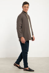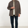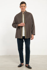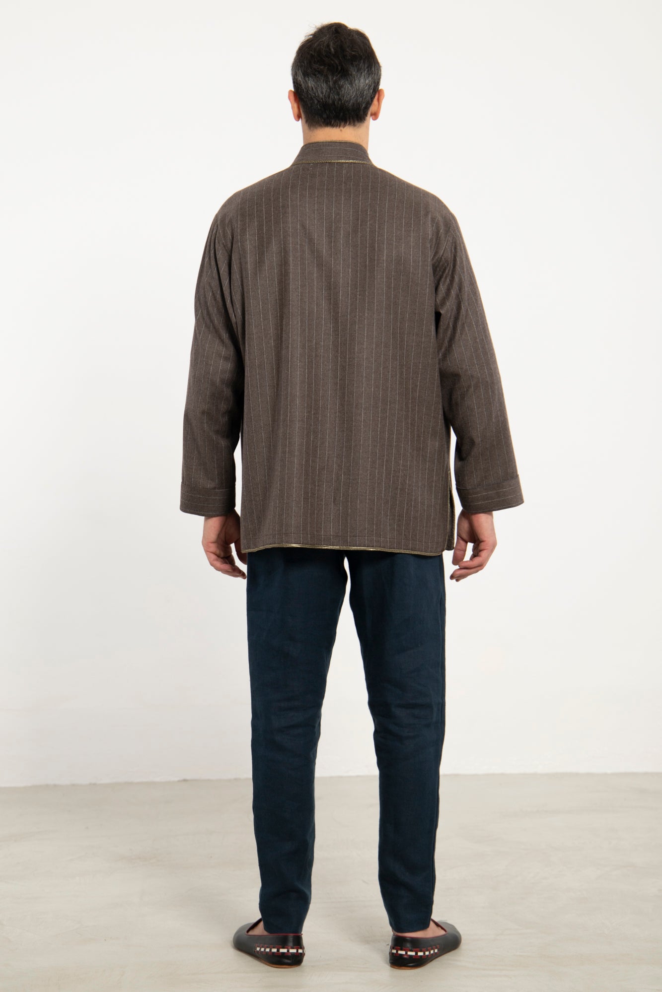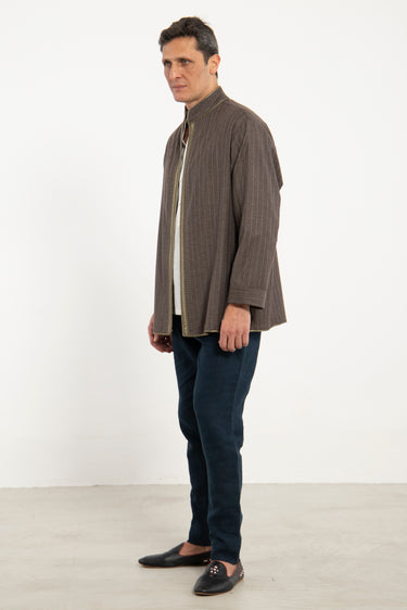 This mocha-toned Abu Jacket is tailored from a soft wool-cashmere blend with subtle vertical pinstripes and tonal embroidery framing the front. Its refined simplicity and relaxed cut make it a versatile staple for cooler seasons.