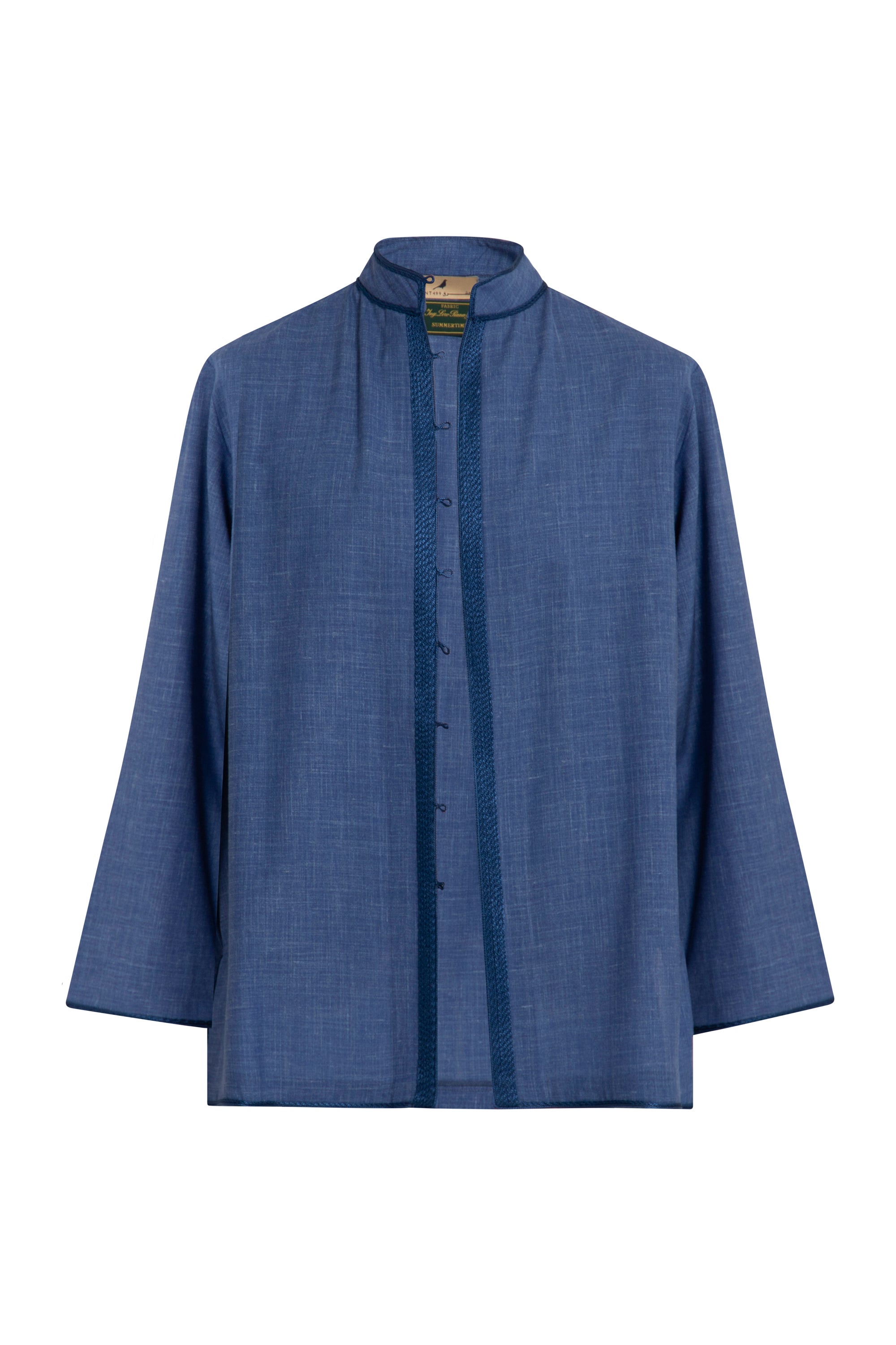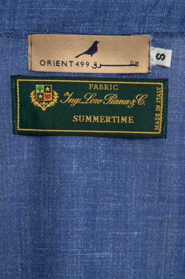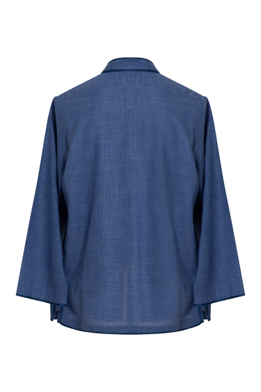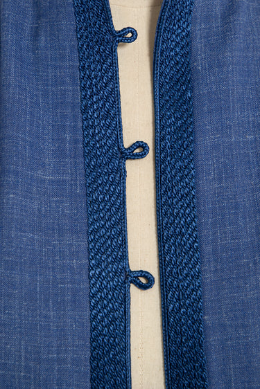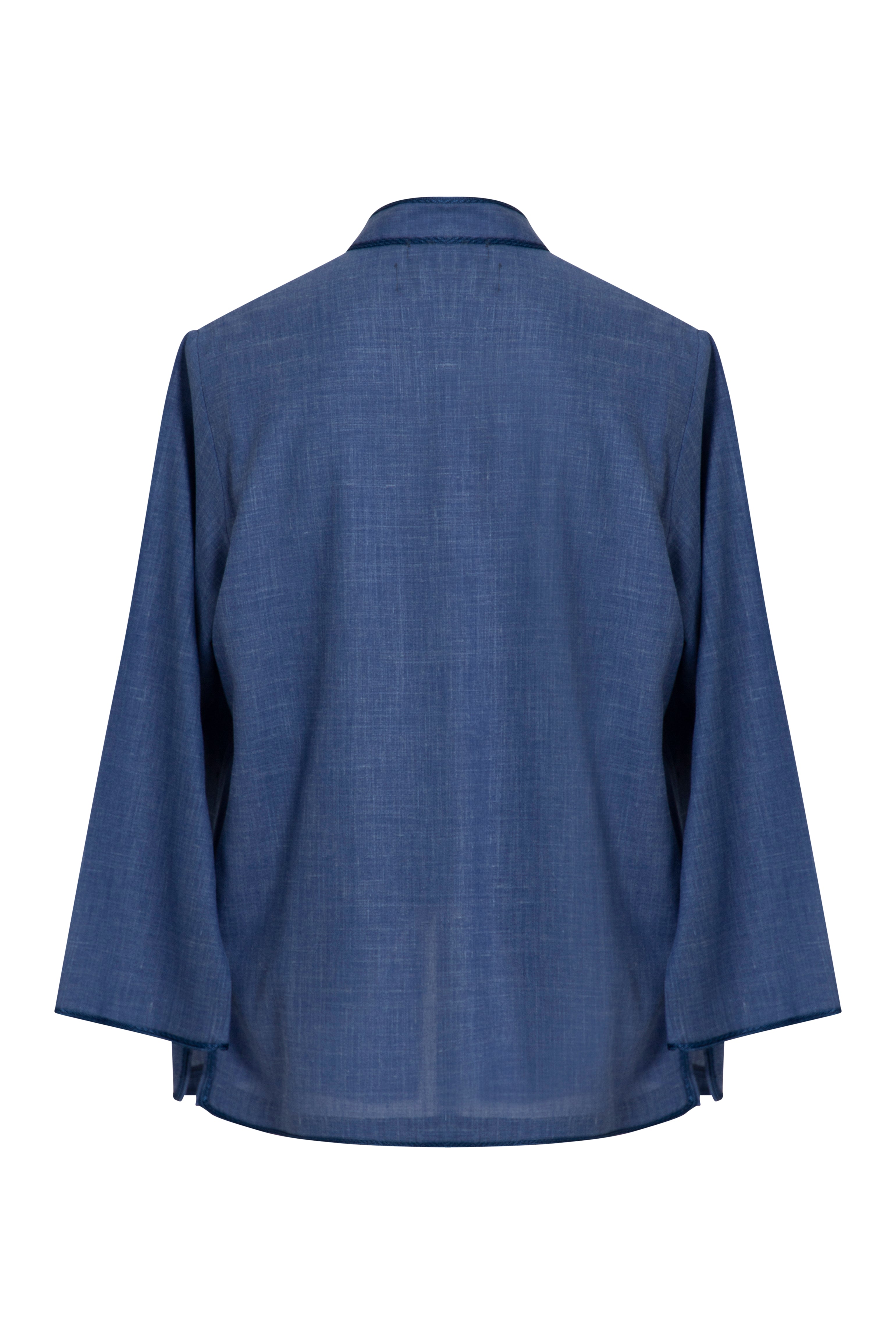 This garment is crafted with lightweight summer wool made in Italy by Loro Piana. The Frank jacket is a refined essential with a relaxed structure. It features tonal blue embroidery along the placket and a clean collarless neckline for a modern finish.