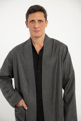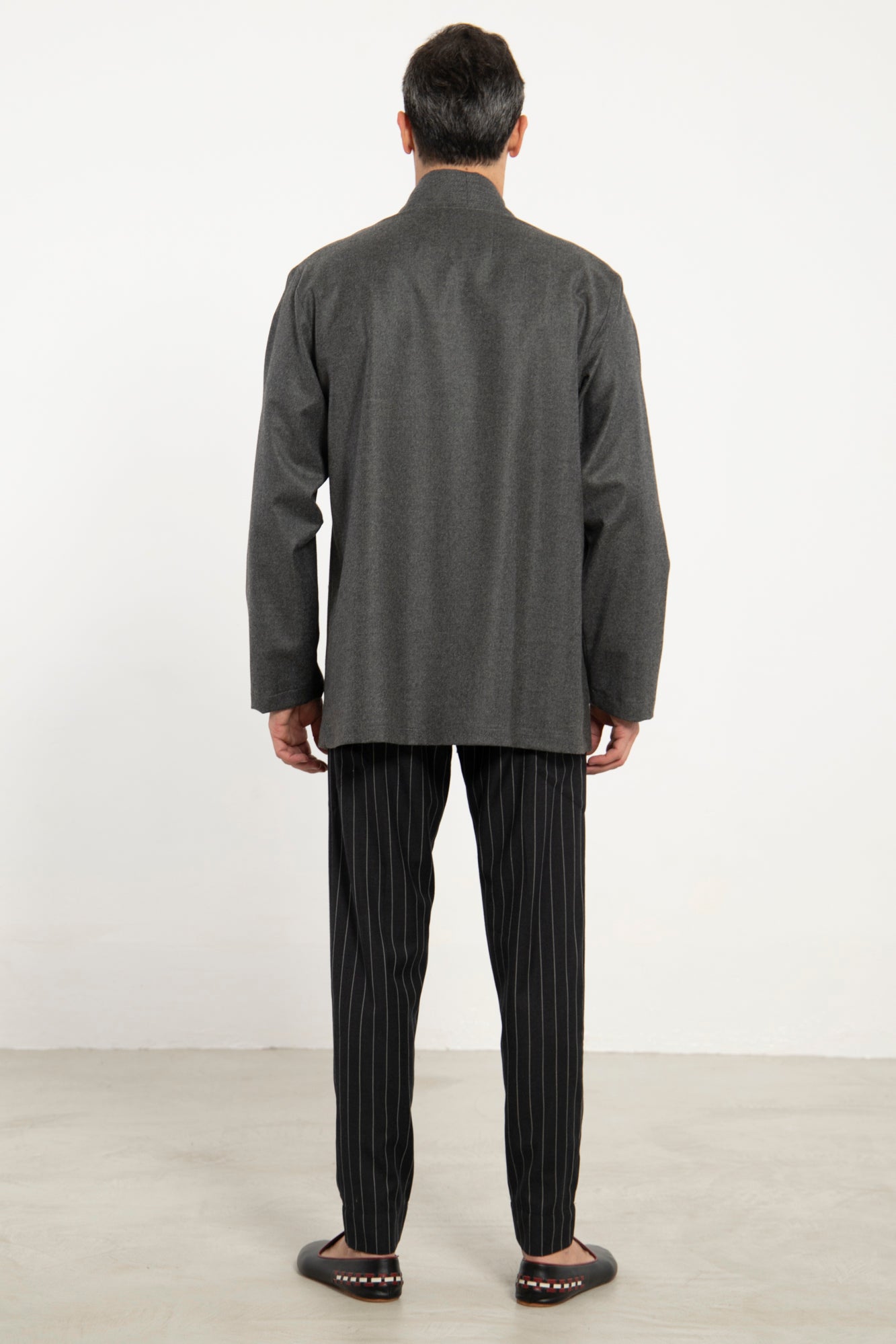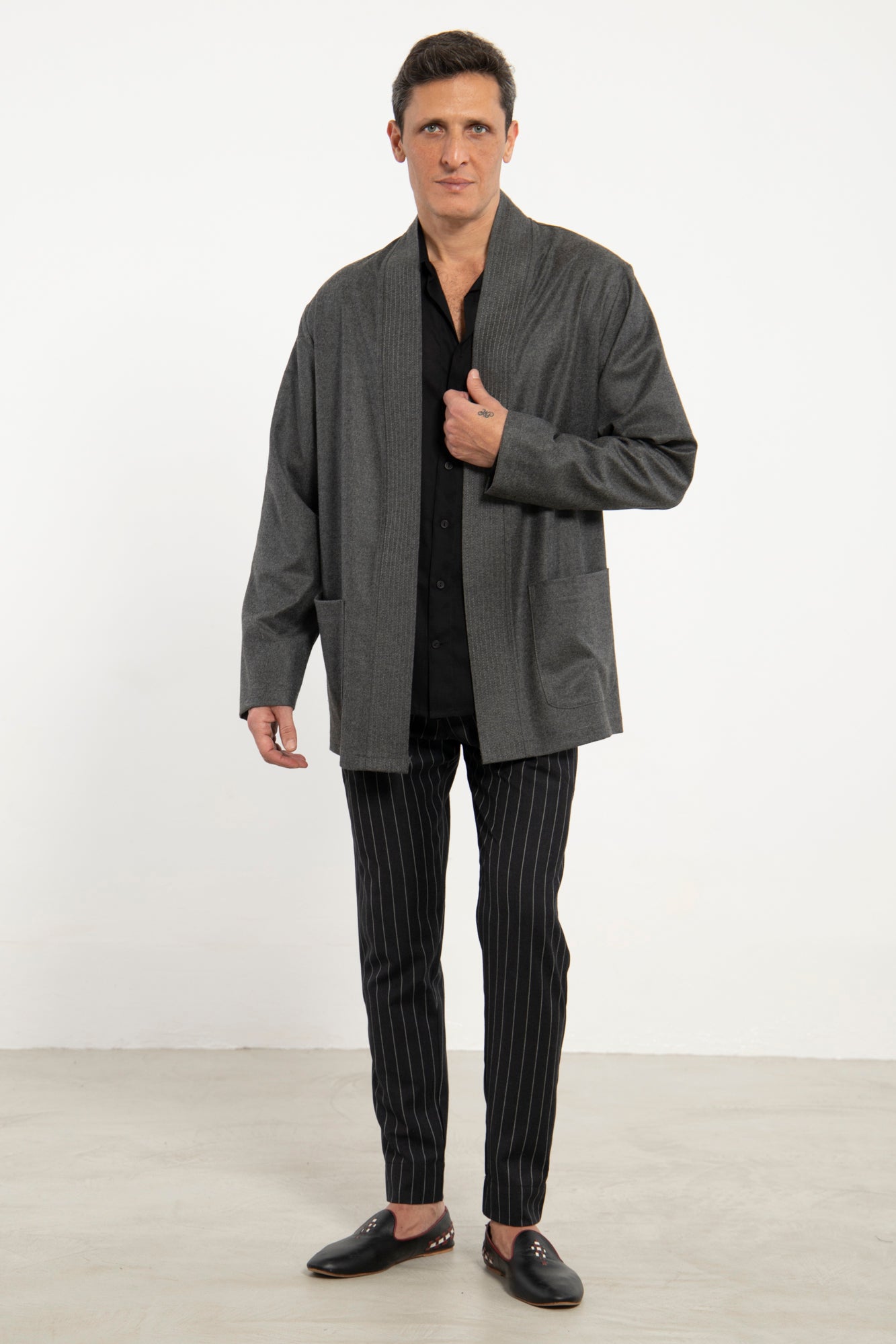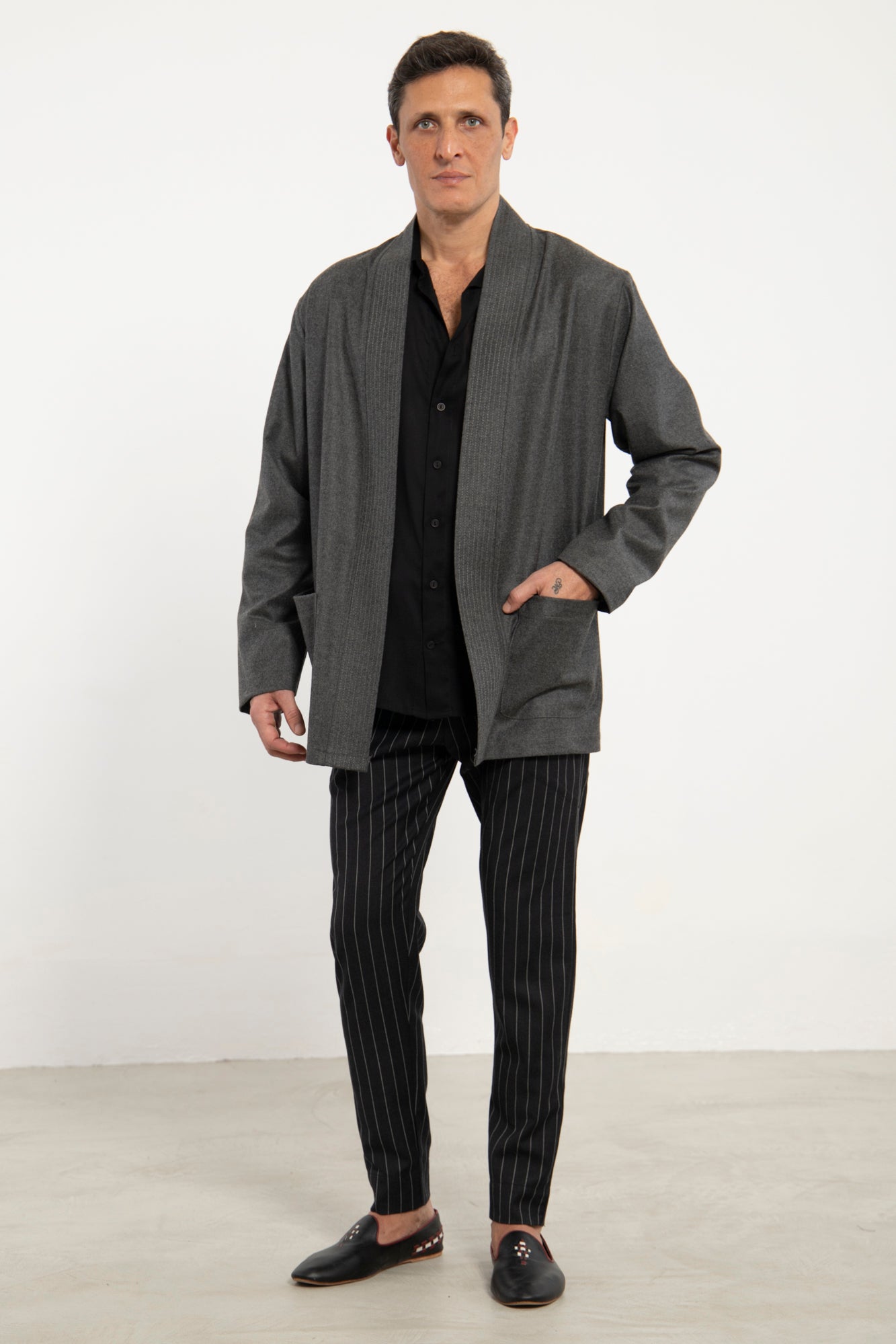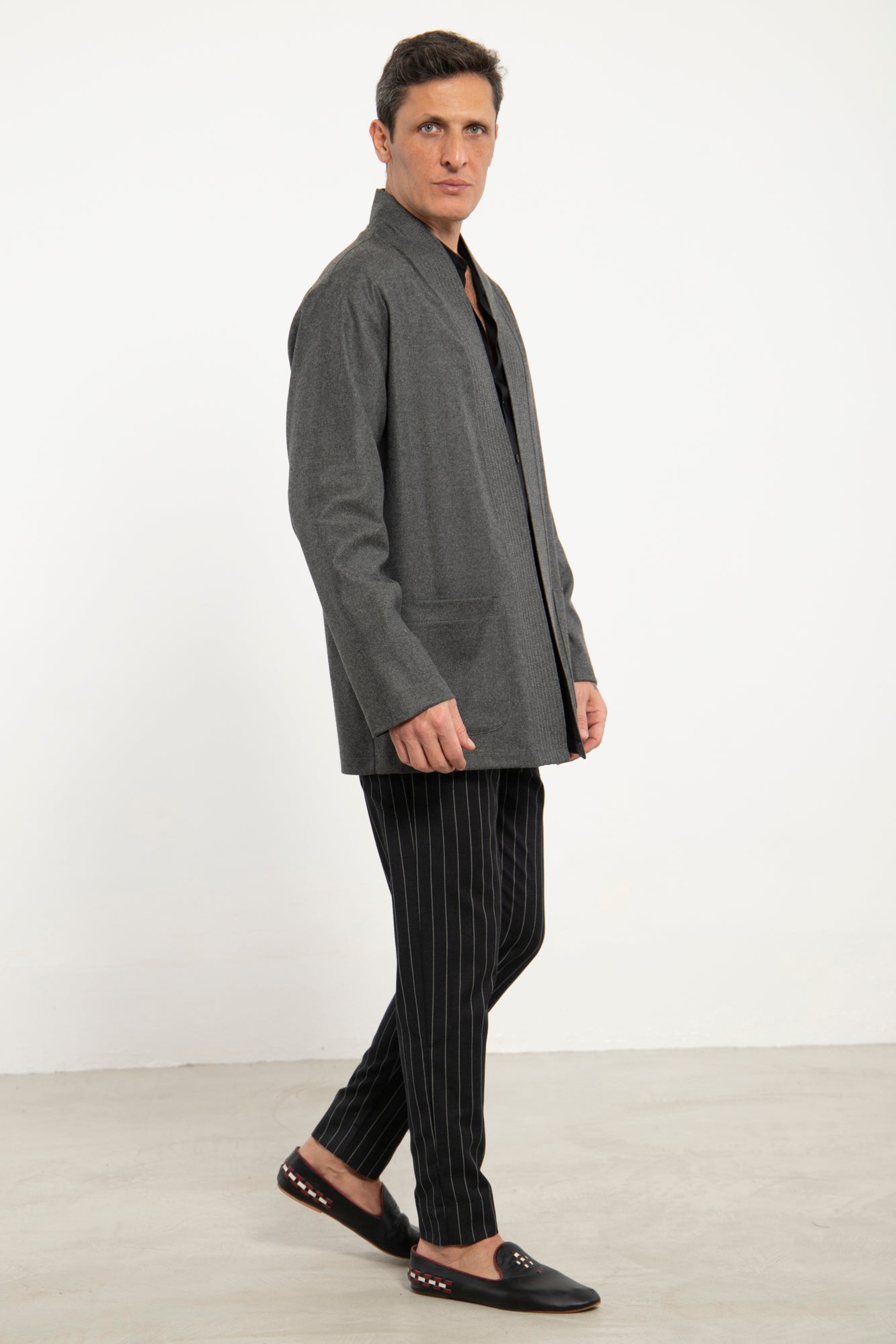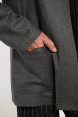 The Khaled Jacket offers a relaxed yet refined silhouette in a chic grey tone. Made from a soft wool-cashmere blend, it features a shawl collar and two front patch pockets for a subtle utilitarian touch.