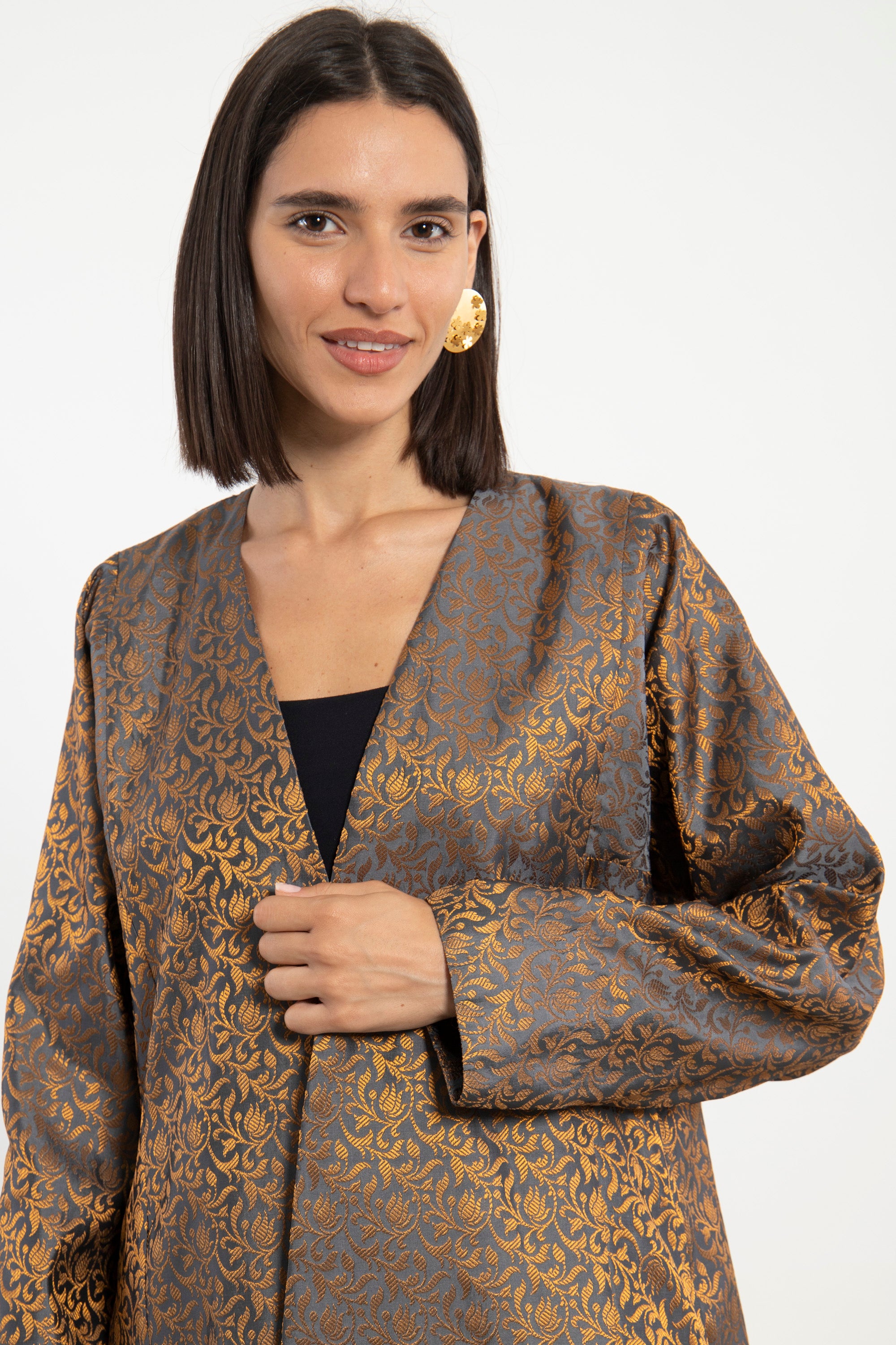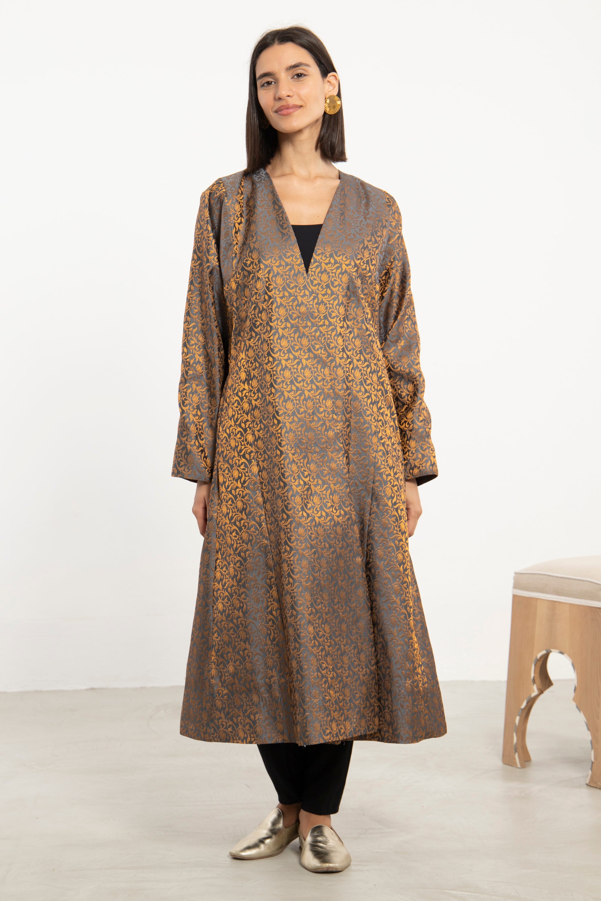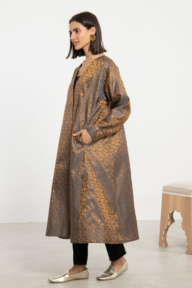A statement piece in rich gold-and-grey brocade, the Malaki Coat blends regal charm with everyday ease. Its open front and fluid A-line cut offer timeless elegance with contemporary versatility.