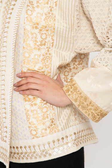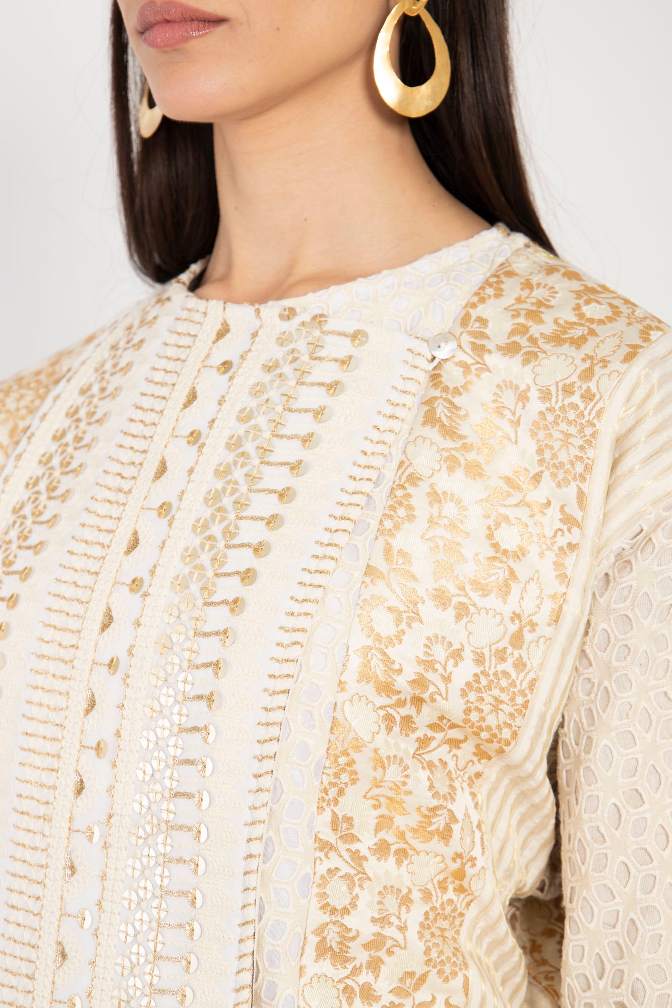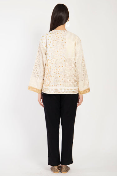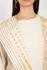 Experience the opulence of our Hanadi Jacket. Elevate your style with this luxurious and exclusive piece, crafted with the finest cotton patchwork and silk brocade in gold.