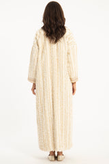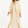 The Fida coat combines plush texture with artisanal detail, crafted in soft cotton with fringe detailing and accented by silk brocade pockets and lining. A refined outer layer with timeless character.