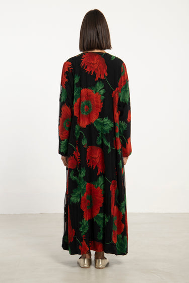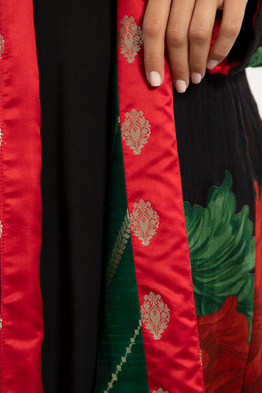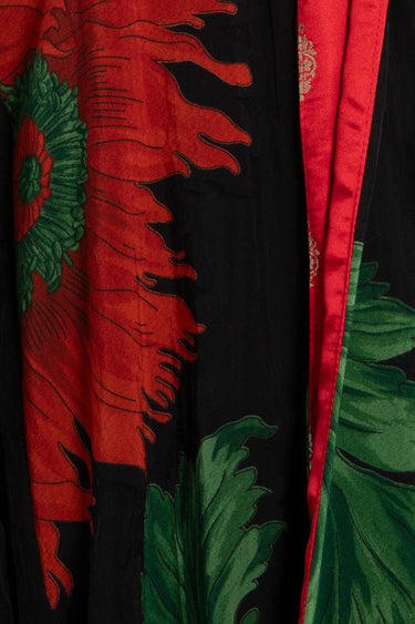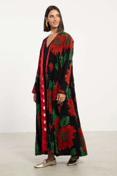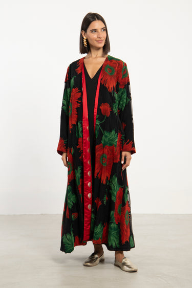 A statement long coat in bold floral cotton, accented with rich silk brocade bands in red and green. Its open-front design and fluid drape make it a versatile outer layer for both day and evening wear.