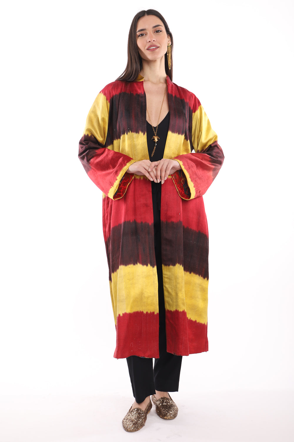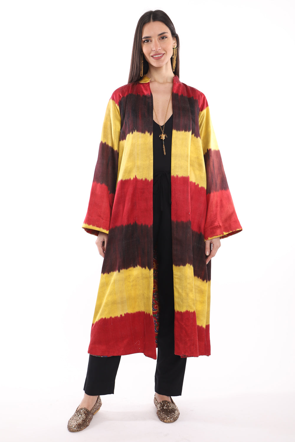 Experience the luxurious beauty and quality of 100% Silk Ikat in vibrant shades of red and yellow stripes. Feel the excitement and passion of this one-of-a-kind coat as you make a powerful statement with your fashion choices.