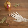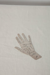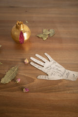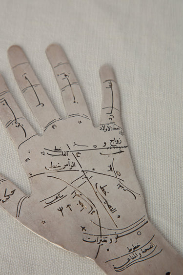 Decorative silver tinned palm reader with engraved lines with the signification of each of them in Arabic. This item can be put on a coffee table for a poetic effect.