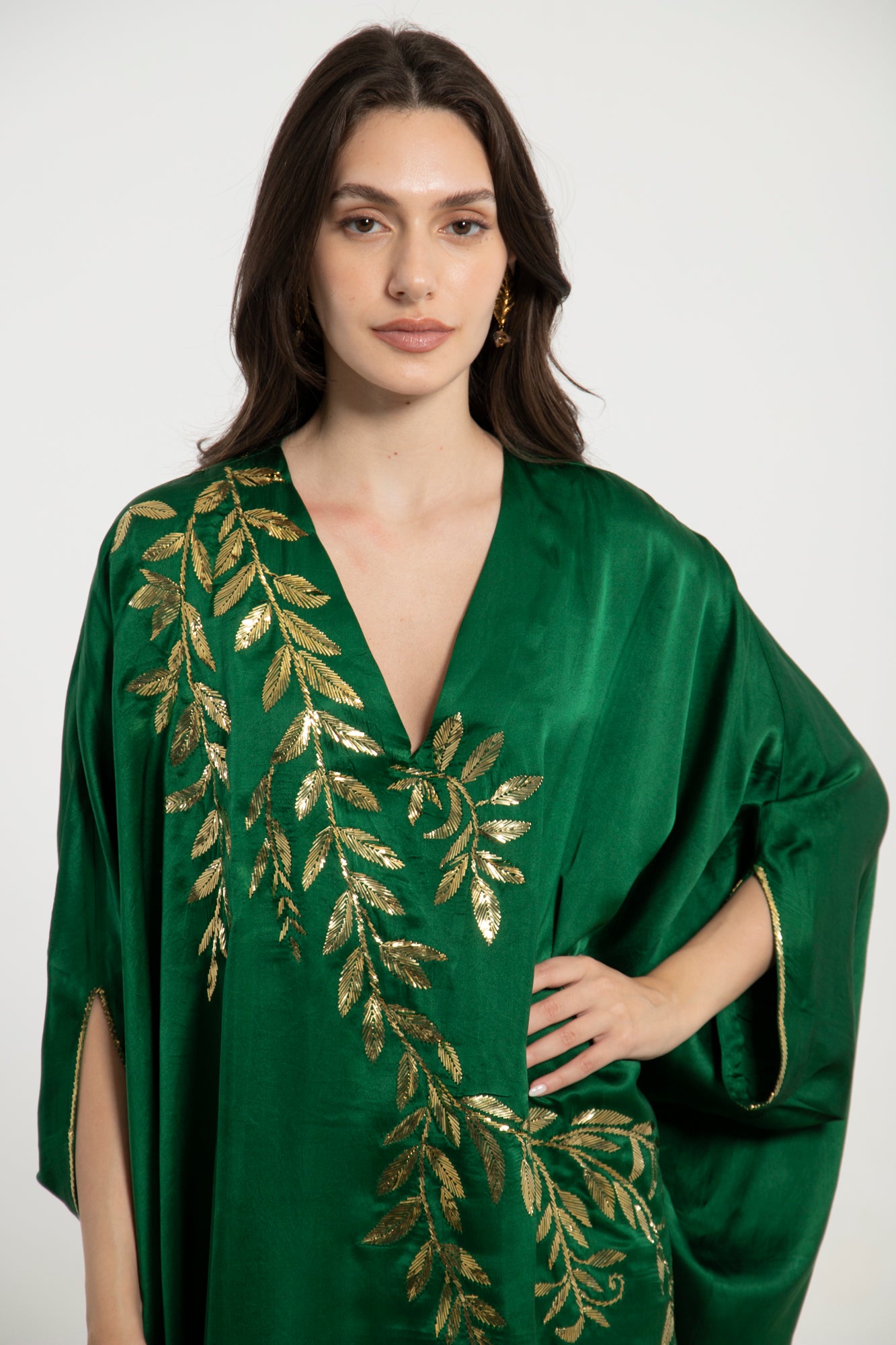 A flowing silk gown in rich green, the Darine dress features intricate hand embroidery using the Tareq technique native from the Baalbeck region on Lebanon. Draped effortlessly for elegance and ease, it celebrates artisanal heritage through a modern silhouette.