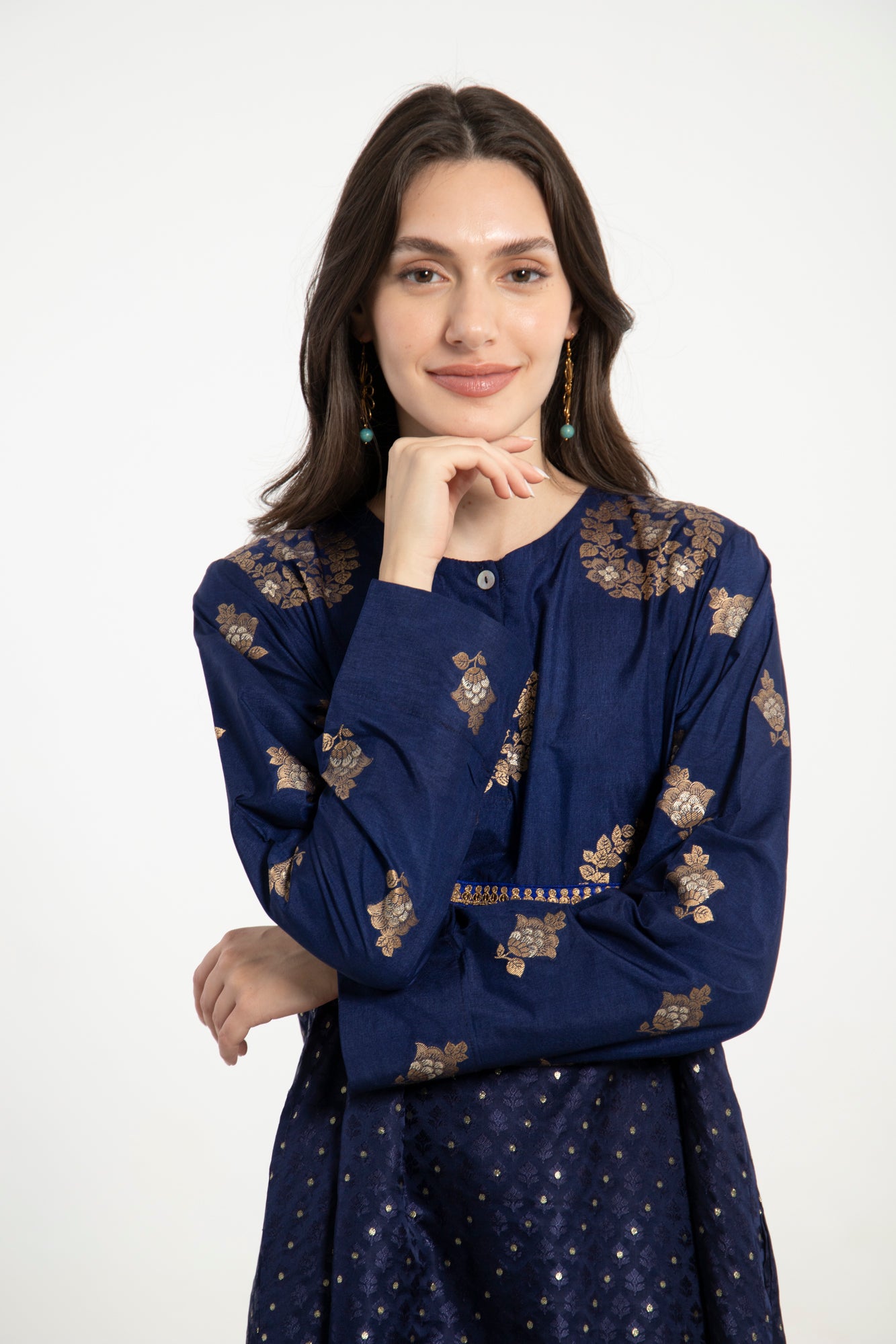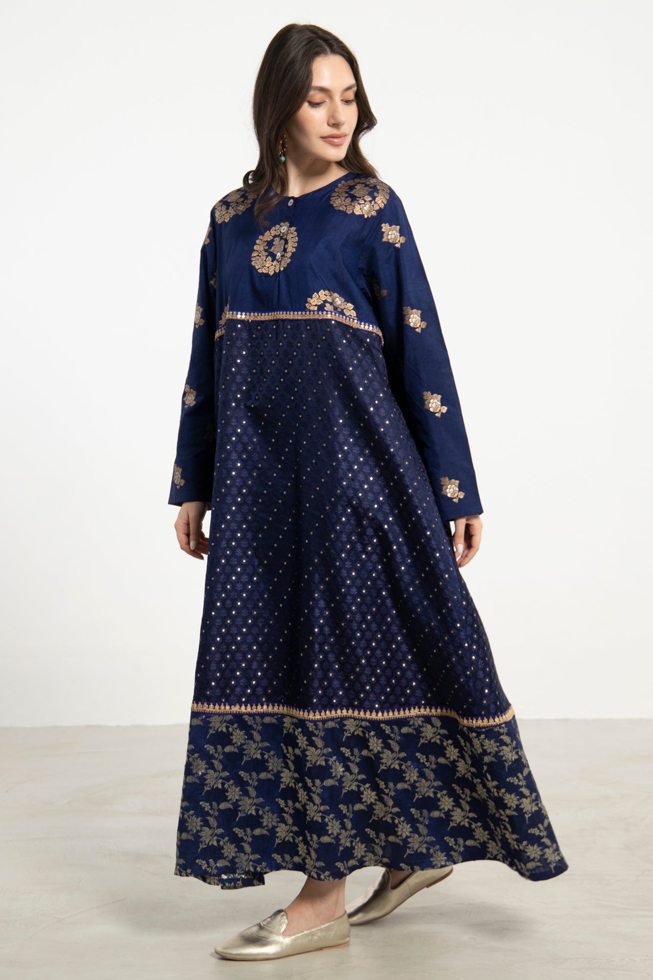 The Layalina Dress features a rich navy silk base adorned with golden motifs and golden dots details. With a flared silhouette and layered fabric textures, it embodies elegance and artisanal charm.