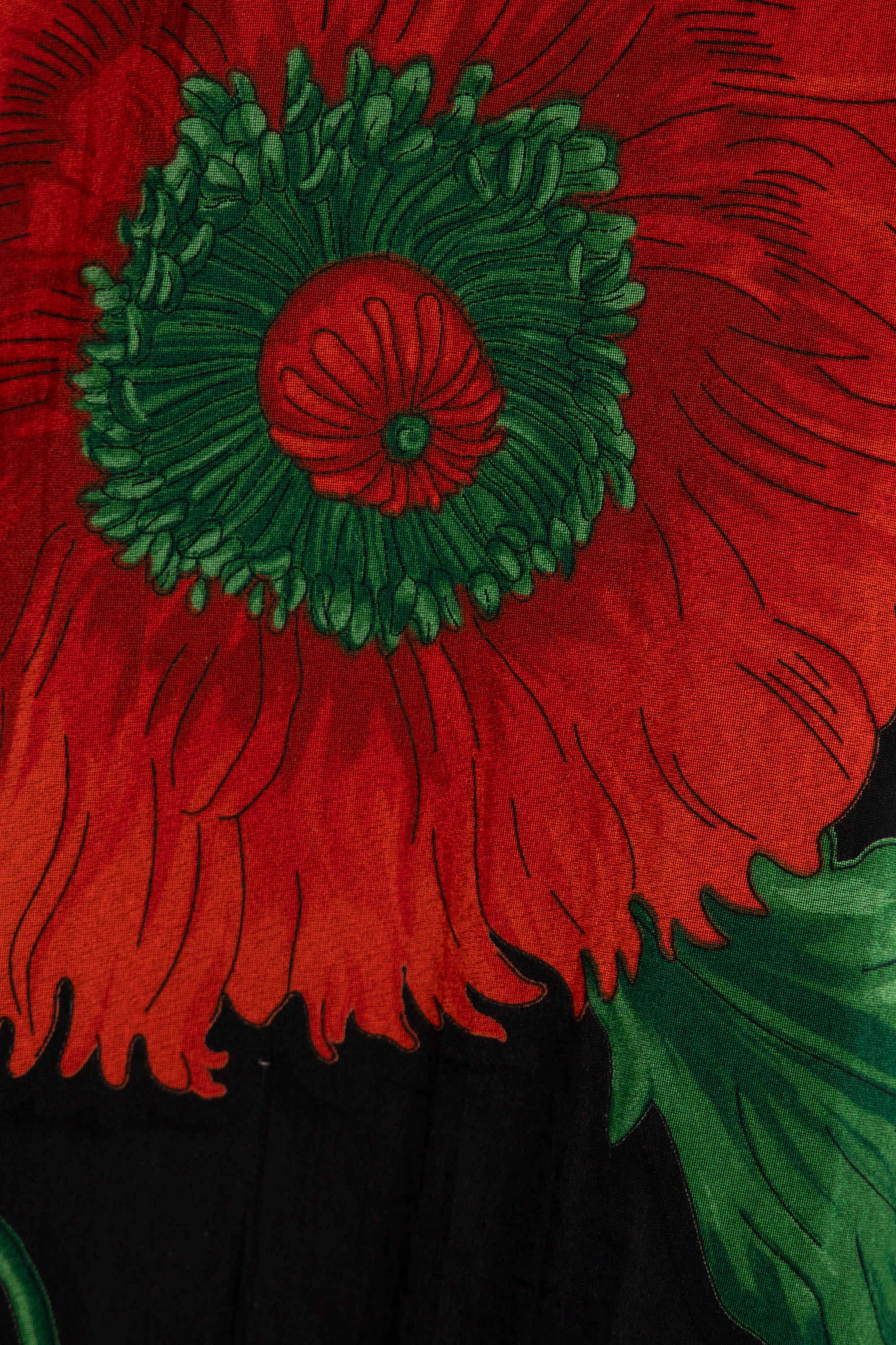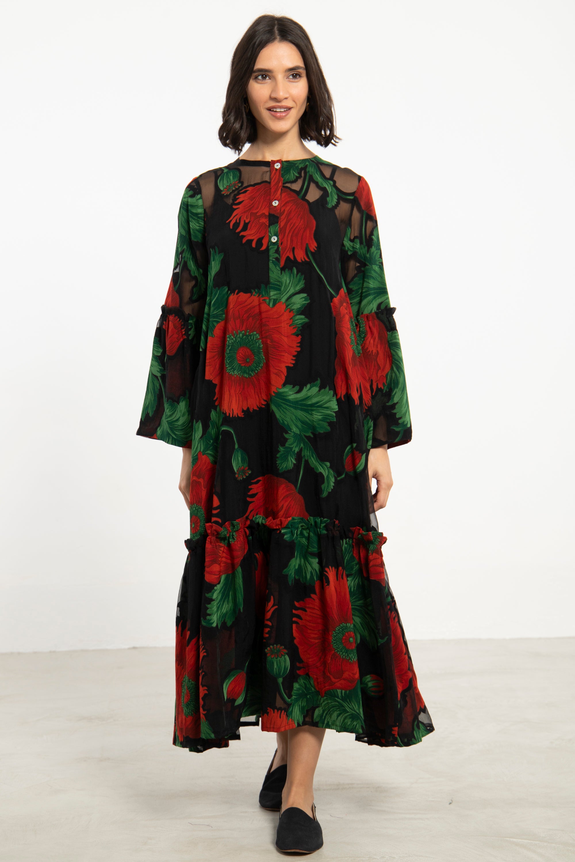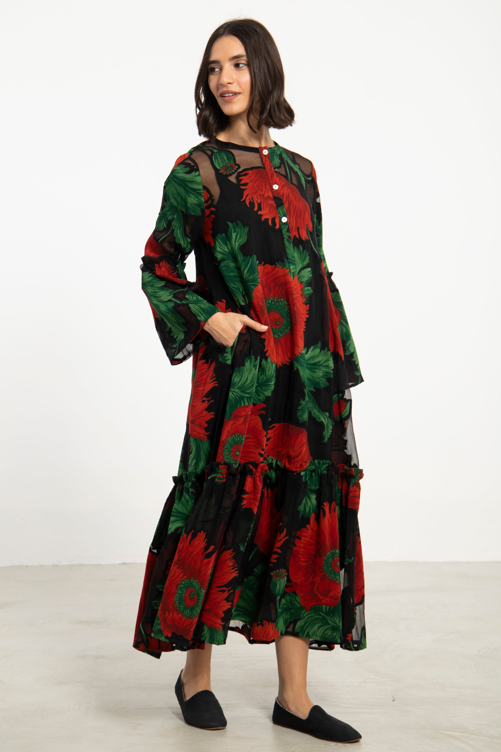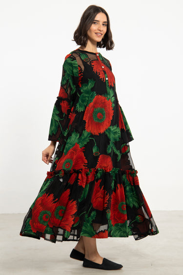 Light and expressive, the May dress is crafted from sheer black cotton adorned with bold red poppies and leafy green accents. The tiered silhouette and gathered seams add gentle movement, and it comes with a matching undergarment for coverage.