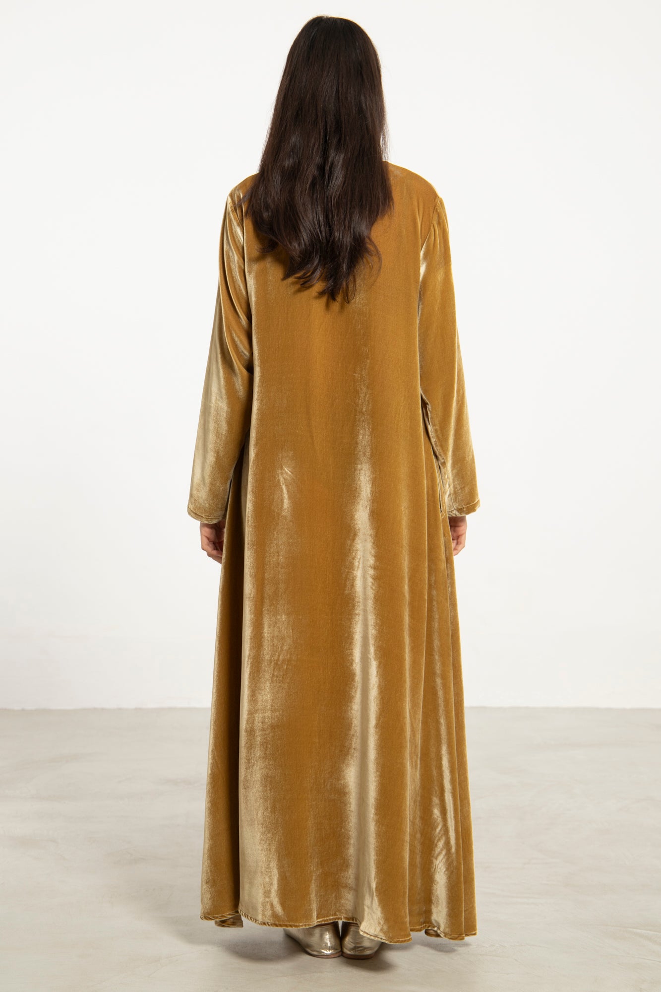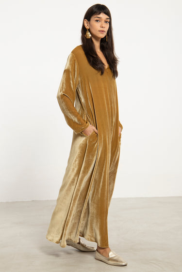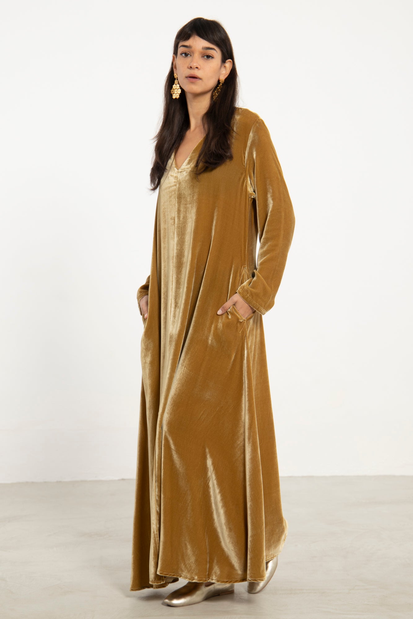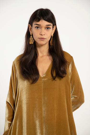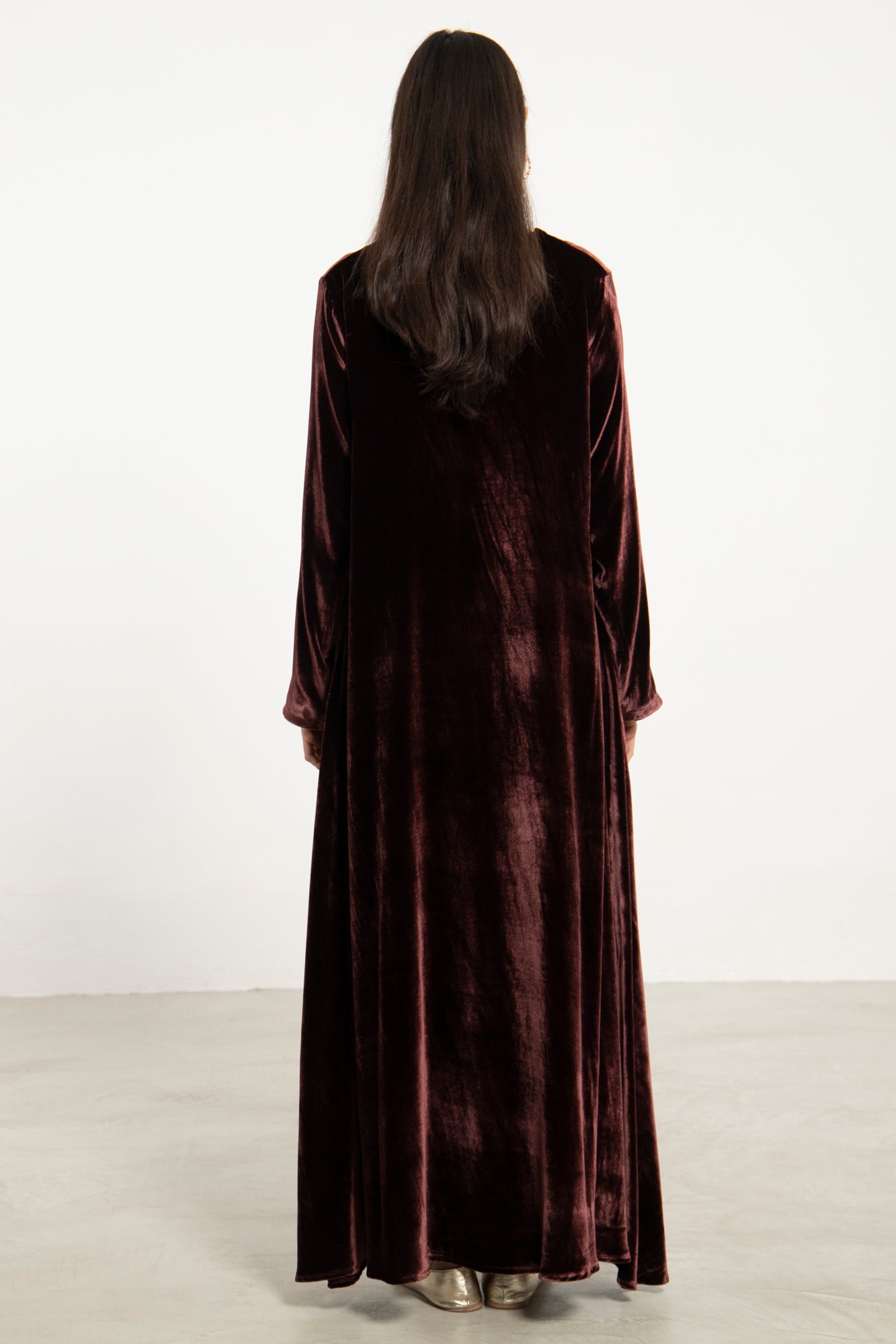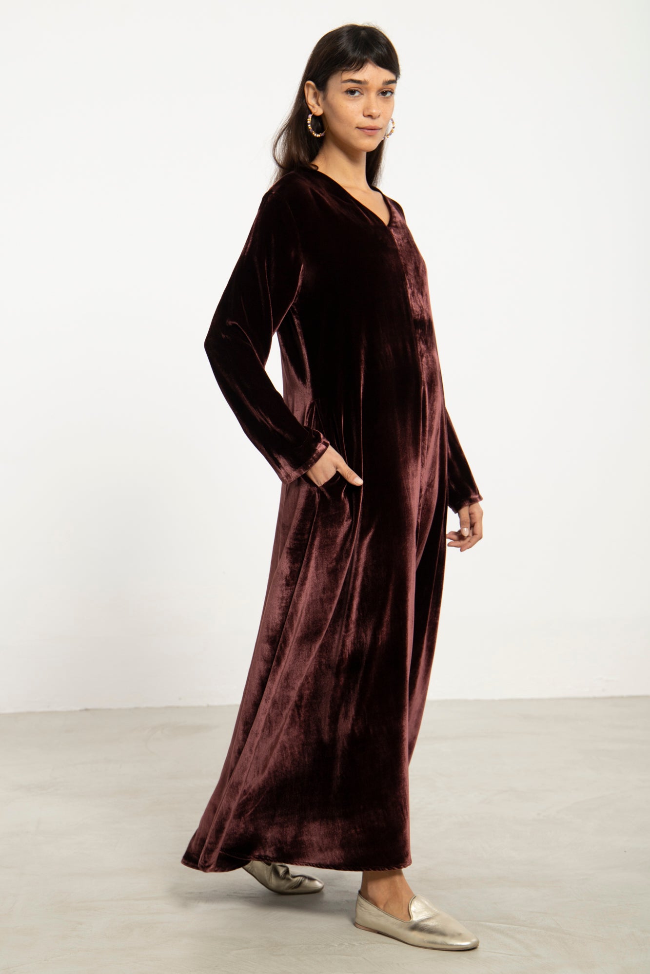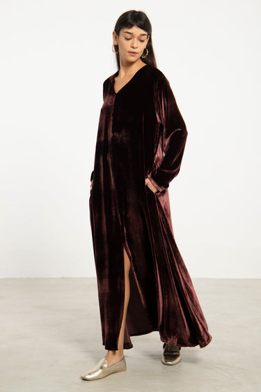 The Nina dress in silk velvet brings effortless elegance to cooler seasons. Its fluid silhouette and subtle front slit create graceful movement, while the plush texture adds depth and richness.