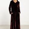 Details: Long-sleeved v-neck dress with a soft front slit and full-length drape