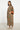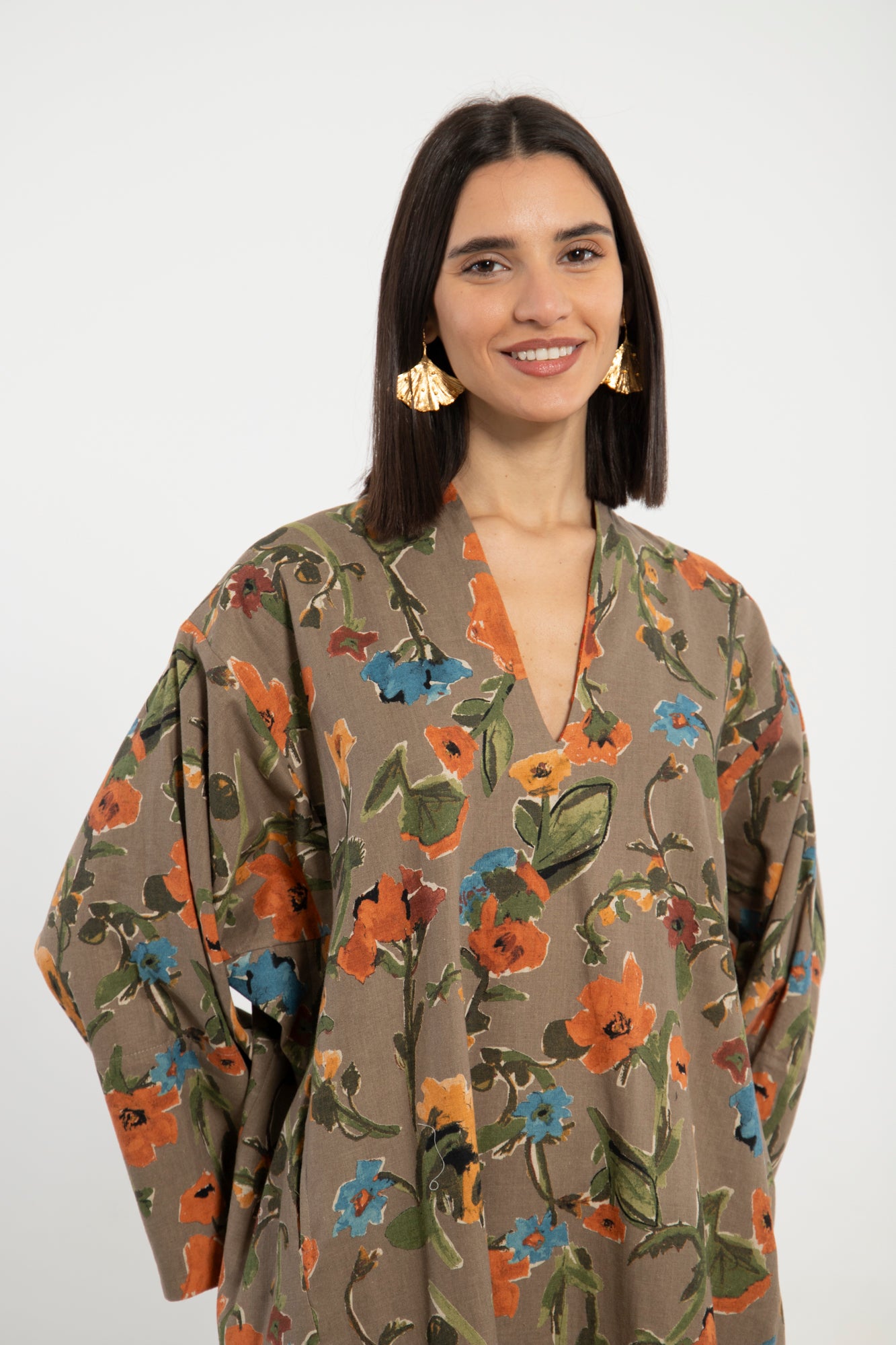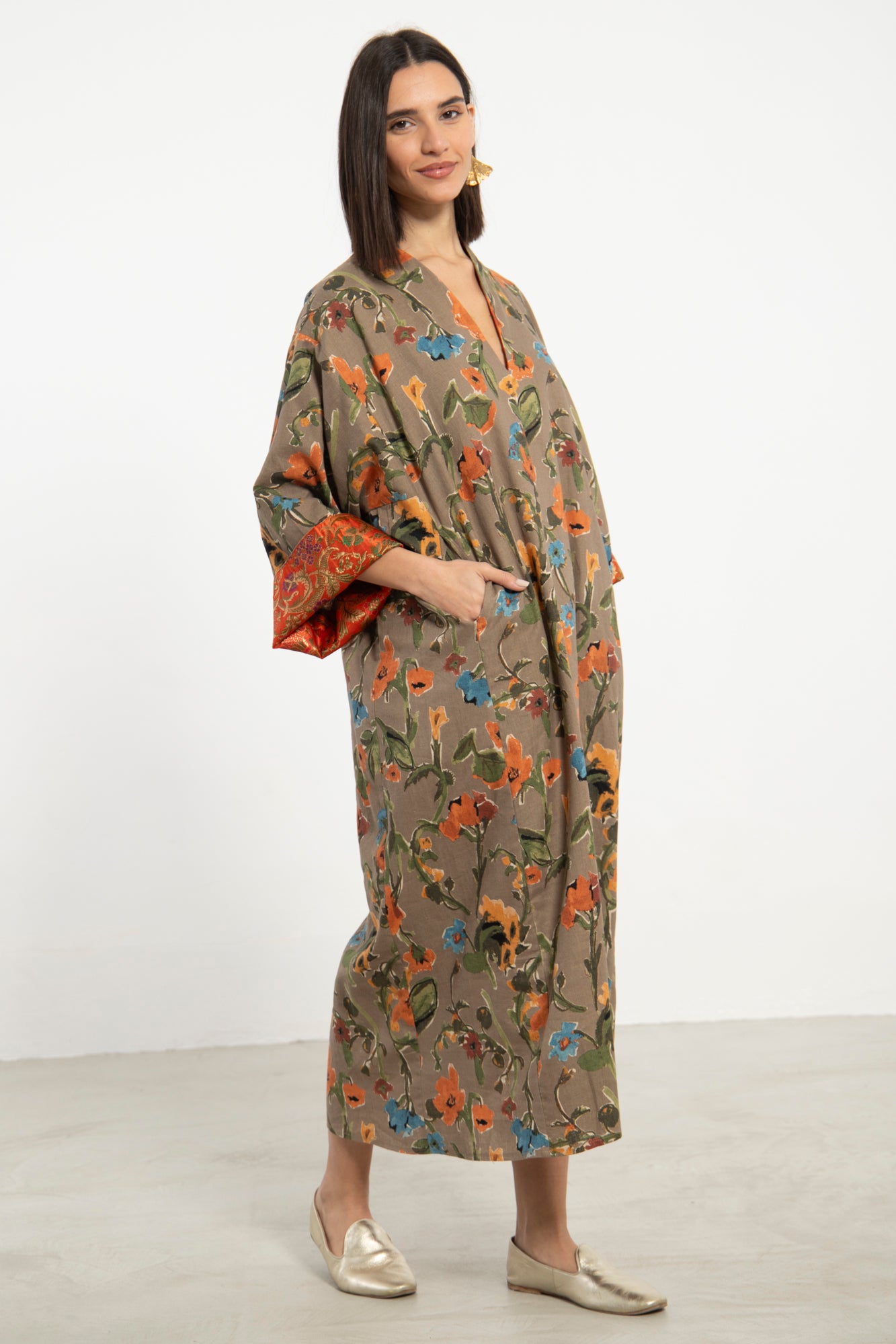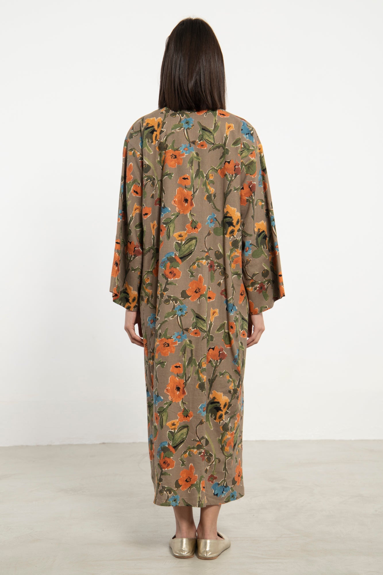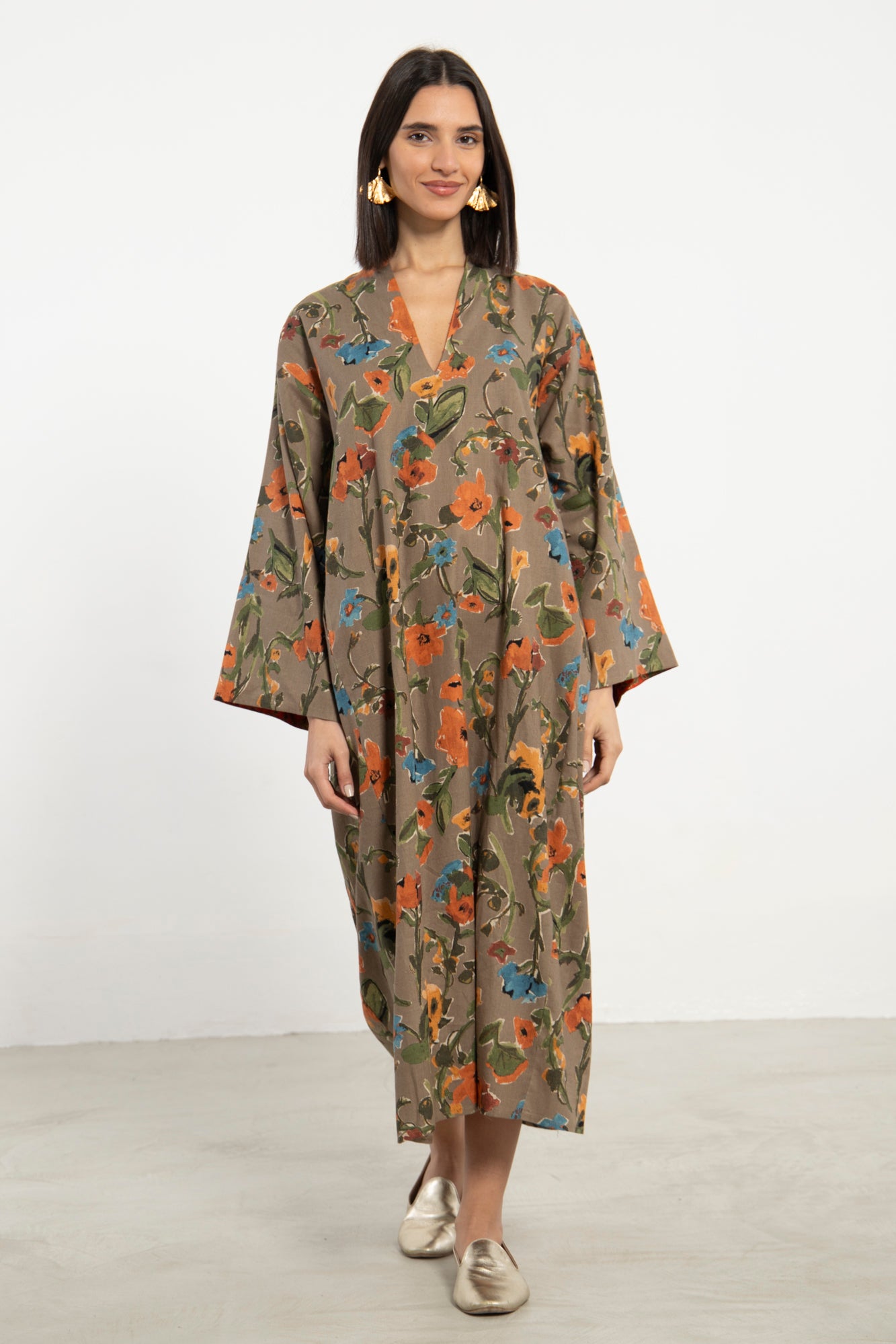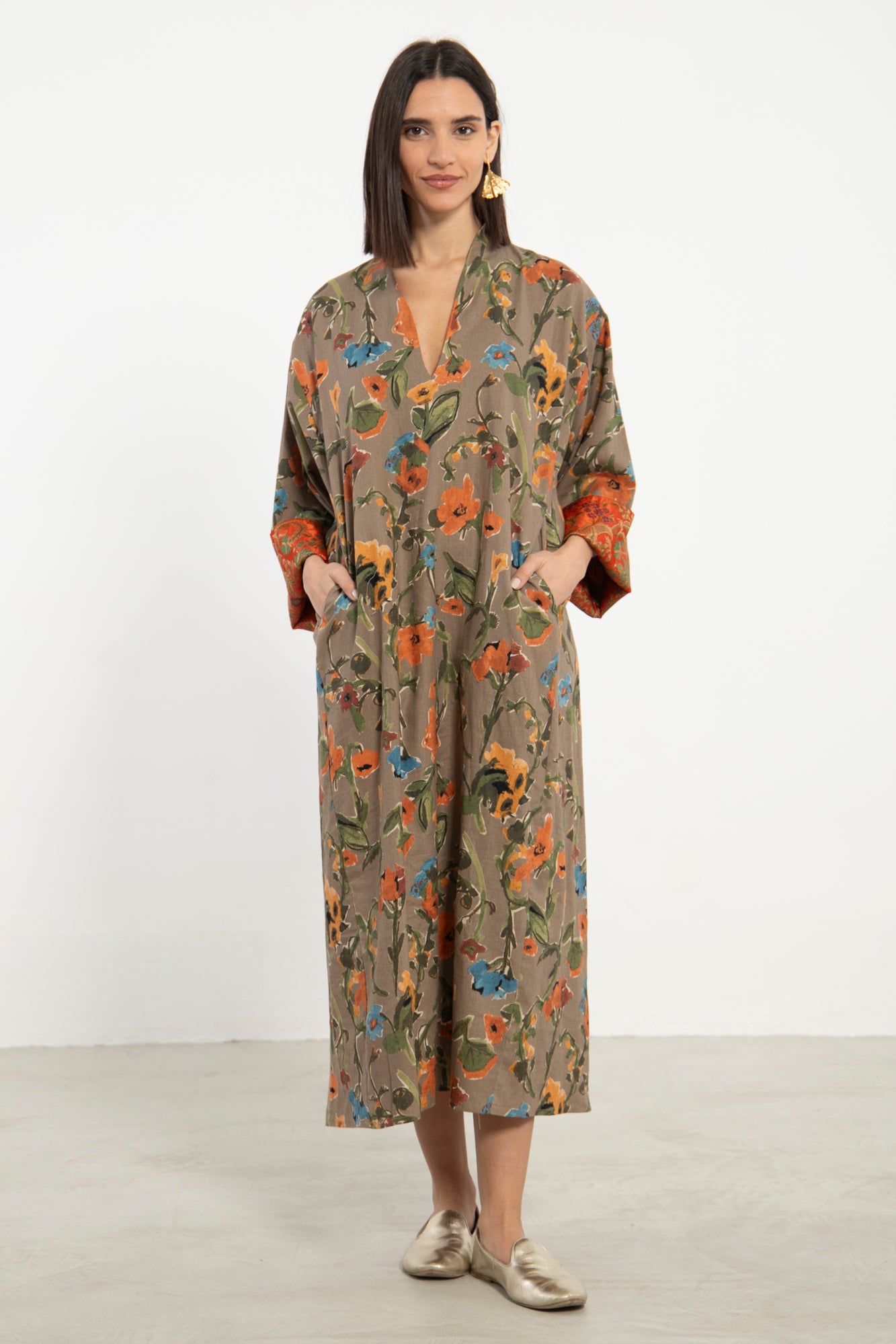 The Nisrine Dress is cut from pure cotton, featuring a deep beige base with delicate floral motifs. Designed with a V-neckline and wide sleeves with silk brocade, it offers both structure and ease in a relaxed silhouette.