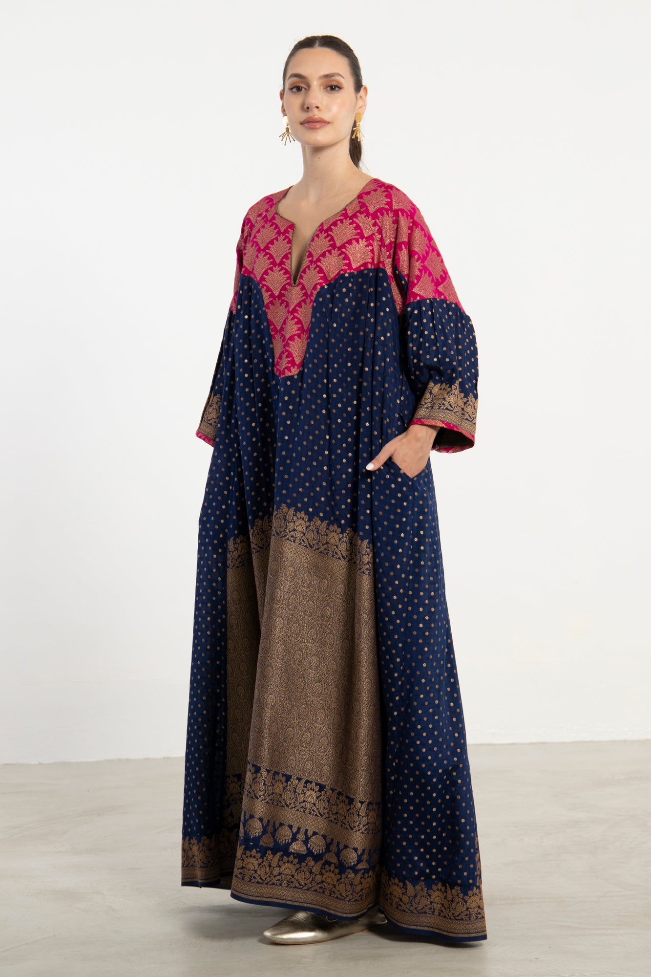 A one-of-a-kind dress in navy & fuchsia silk brocade, the Rania Dress is defined by its intricate metallic patterns and flowing silhouette, offering a refined statement for any occasion.