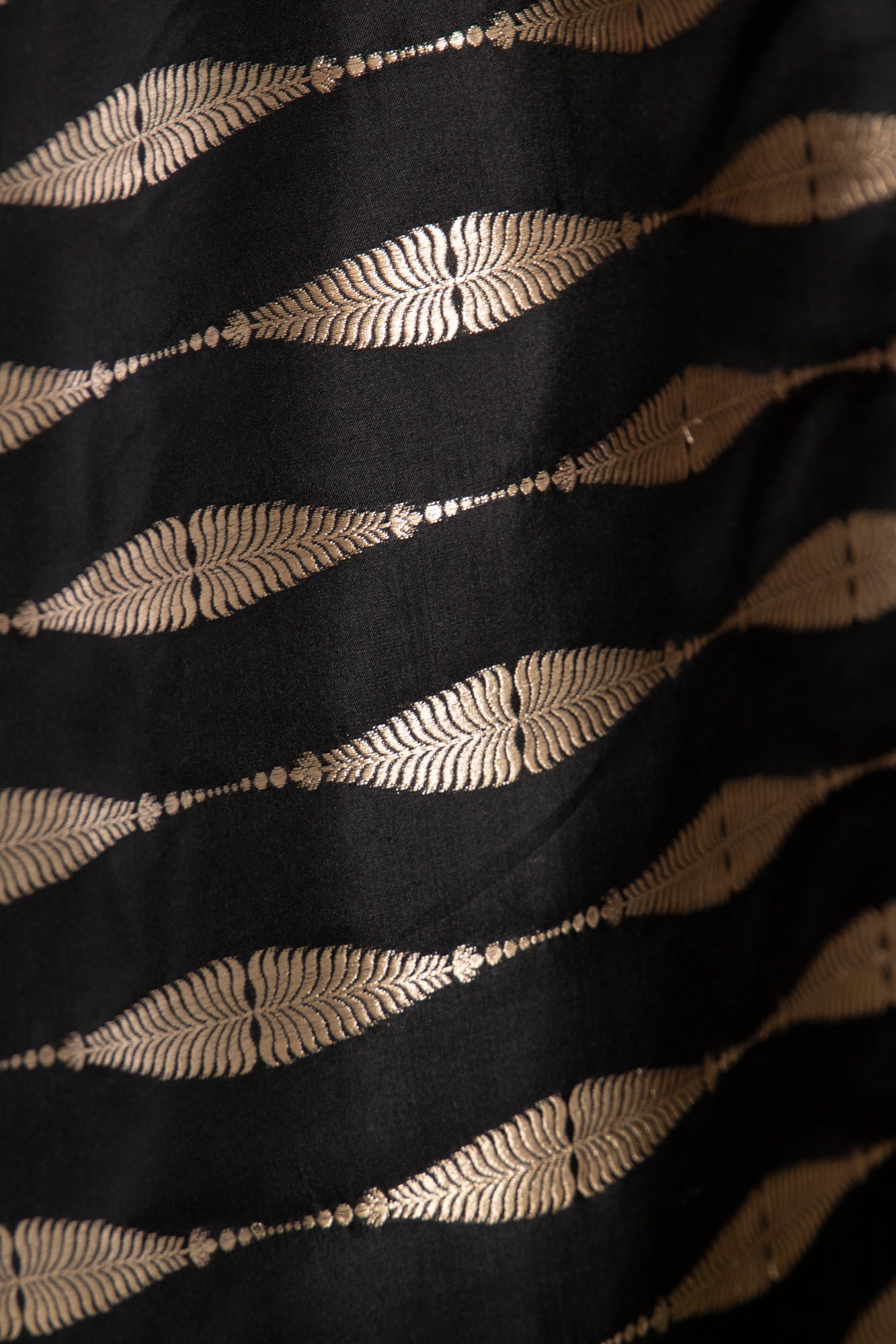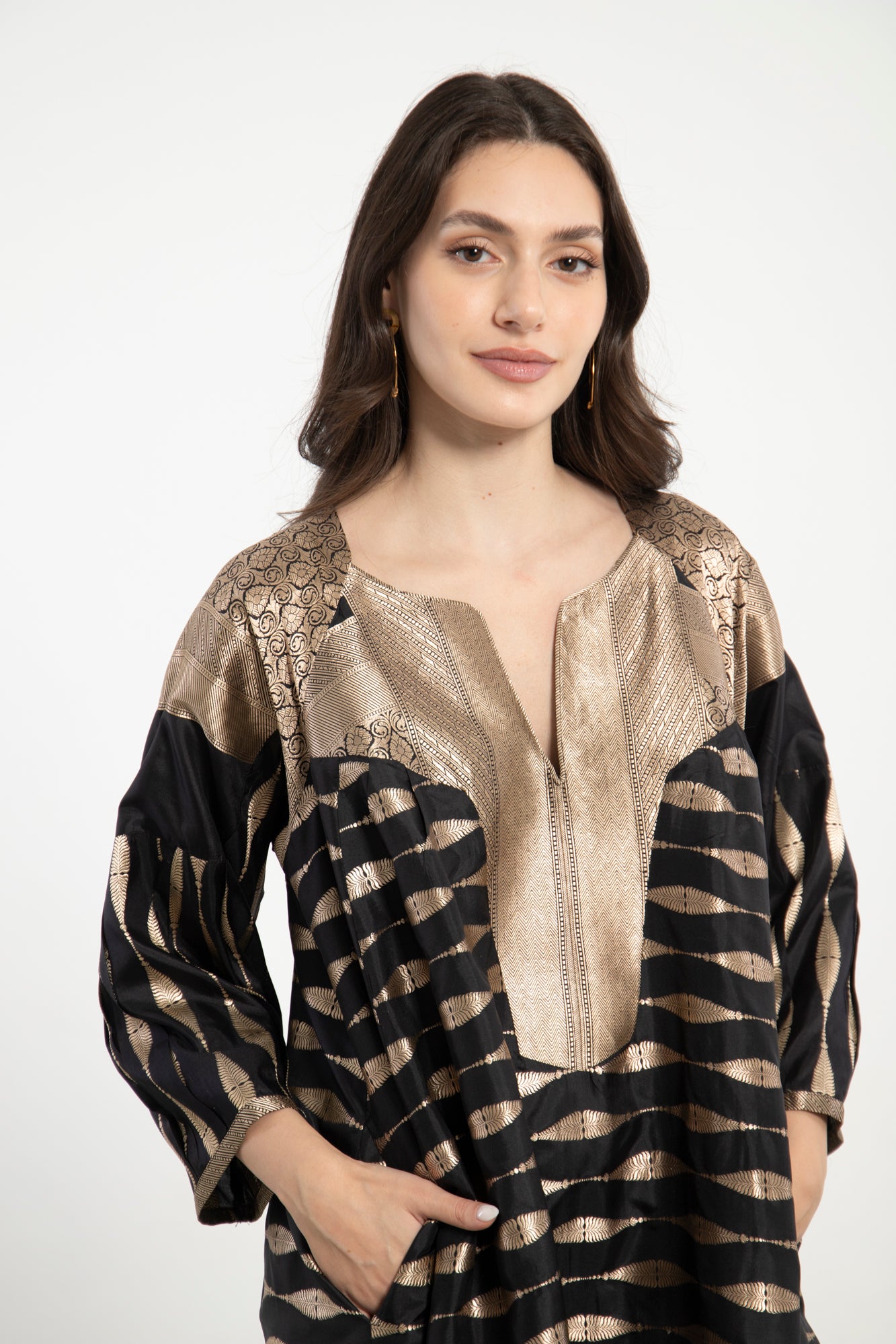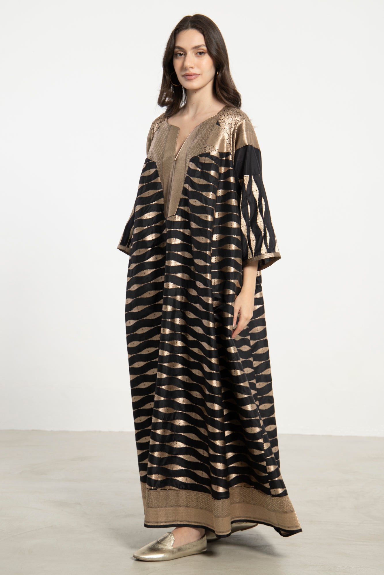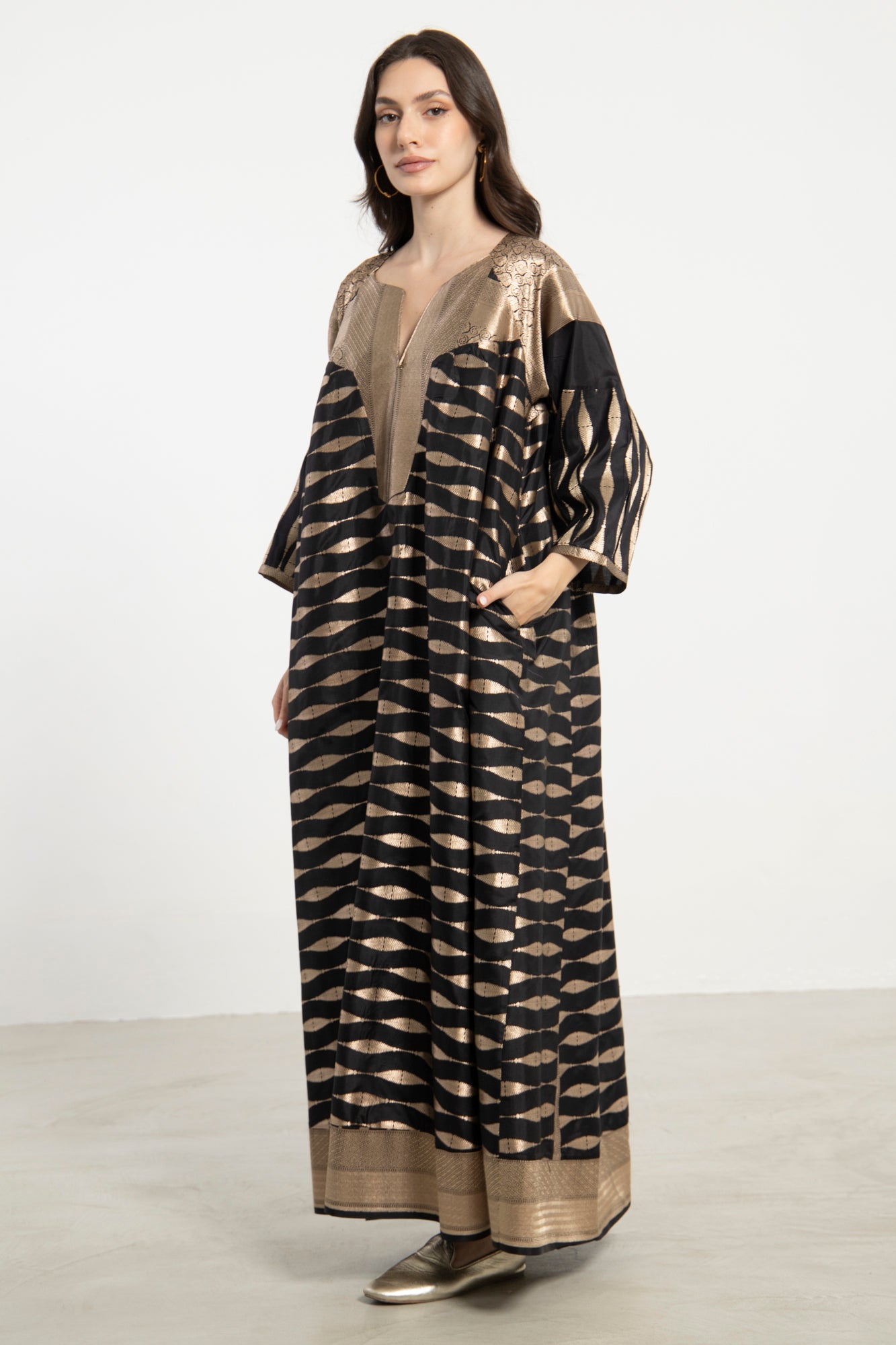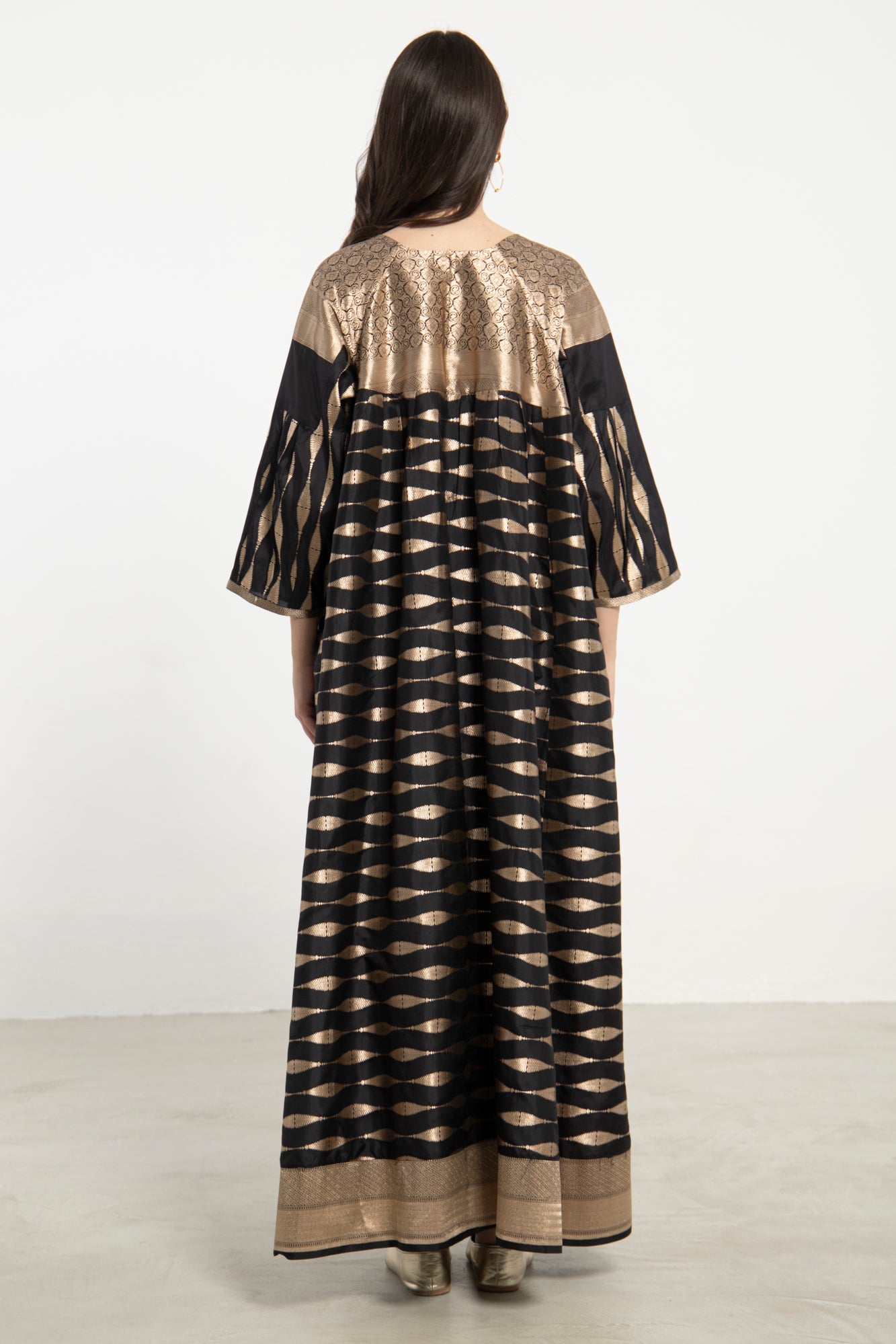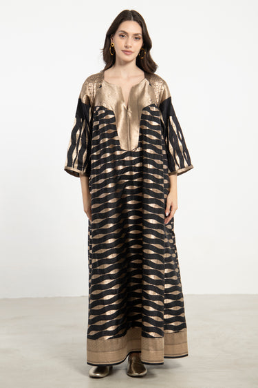 An exquisite one-of-a-kind piece crafted from handloom silk brocade. The Rania Dress features a structured neckline and flowing form, adorned with shimmering gold wave motifs on a deep black base.