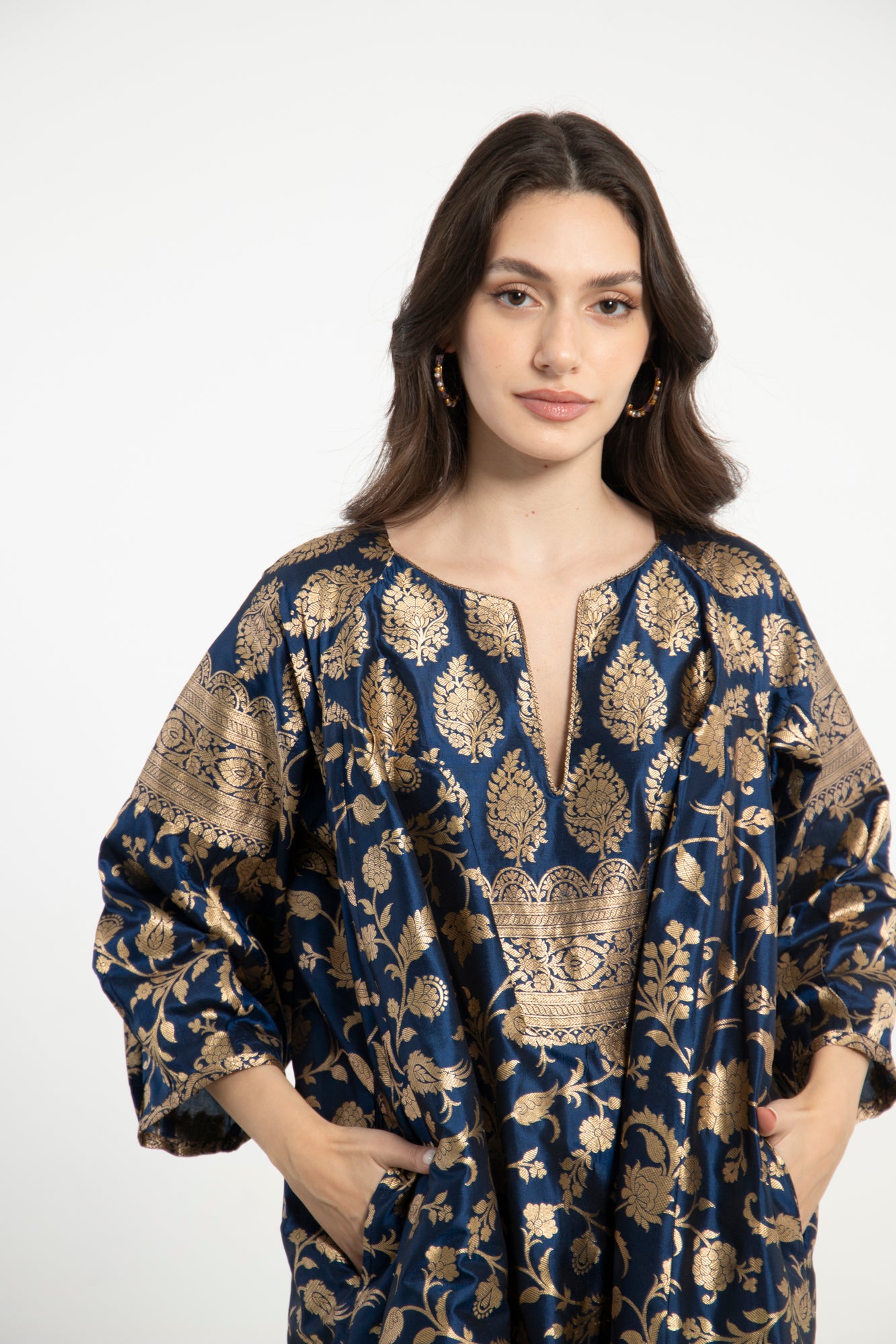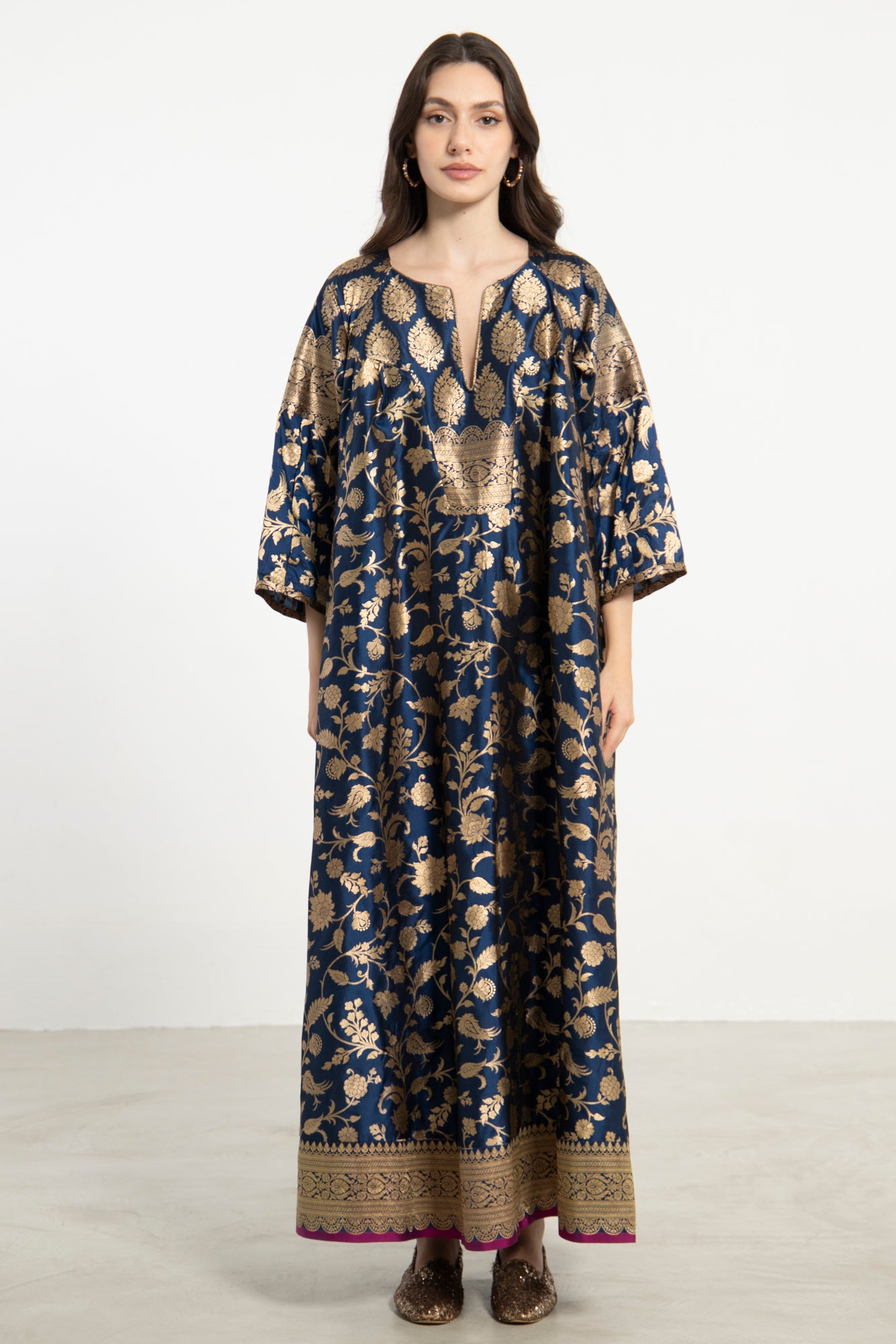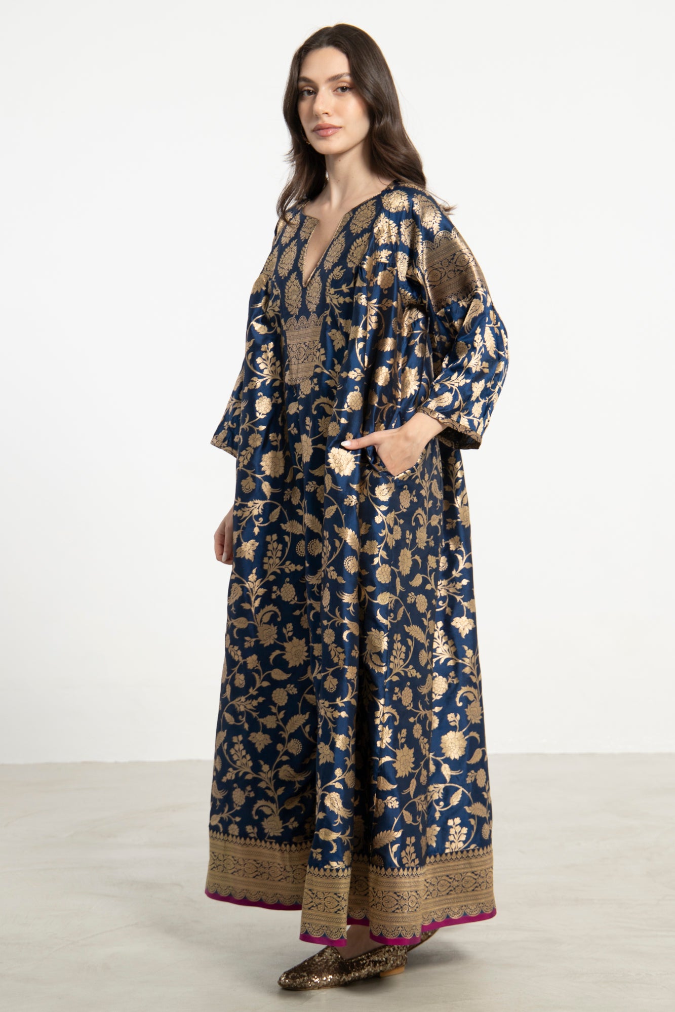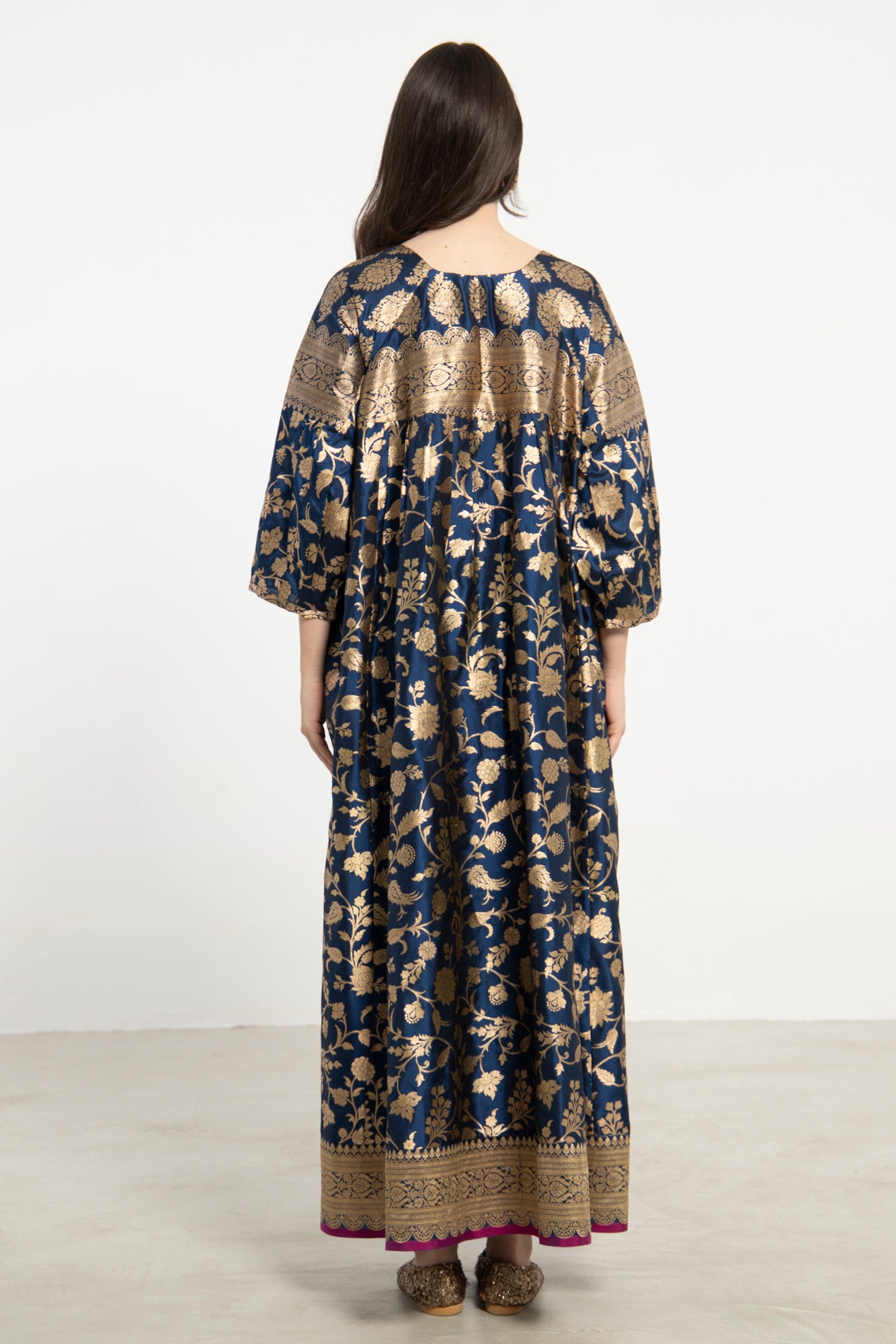 An exquisite one-of-a-kind piece crafted from handloom silk brocade. The Rania Dress features a structured neckline and flowing form, adorned with shimmering gold flower motifs on a deep blue base.
