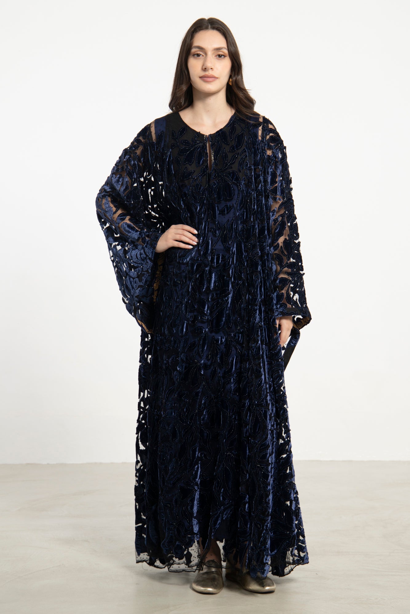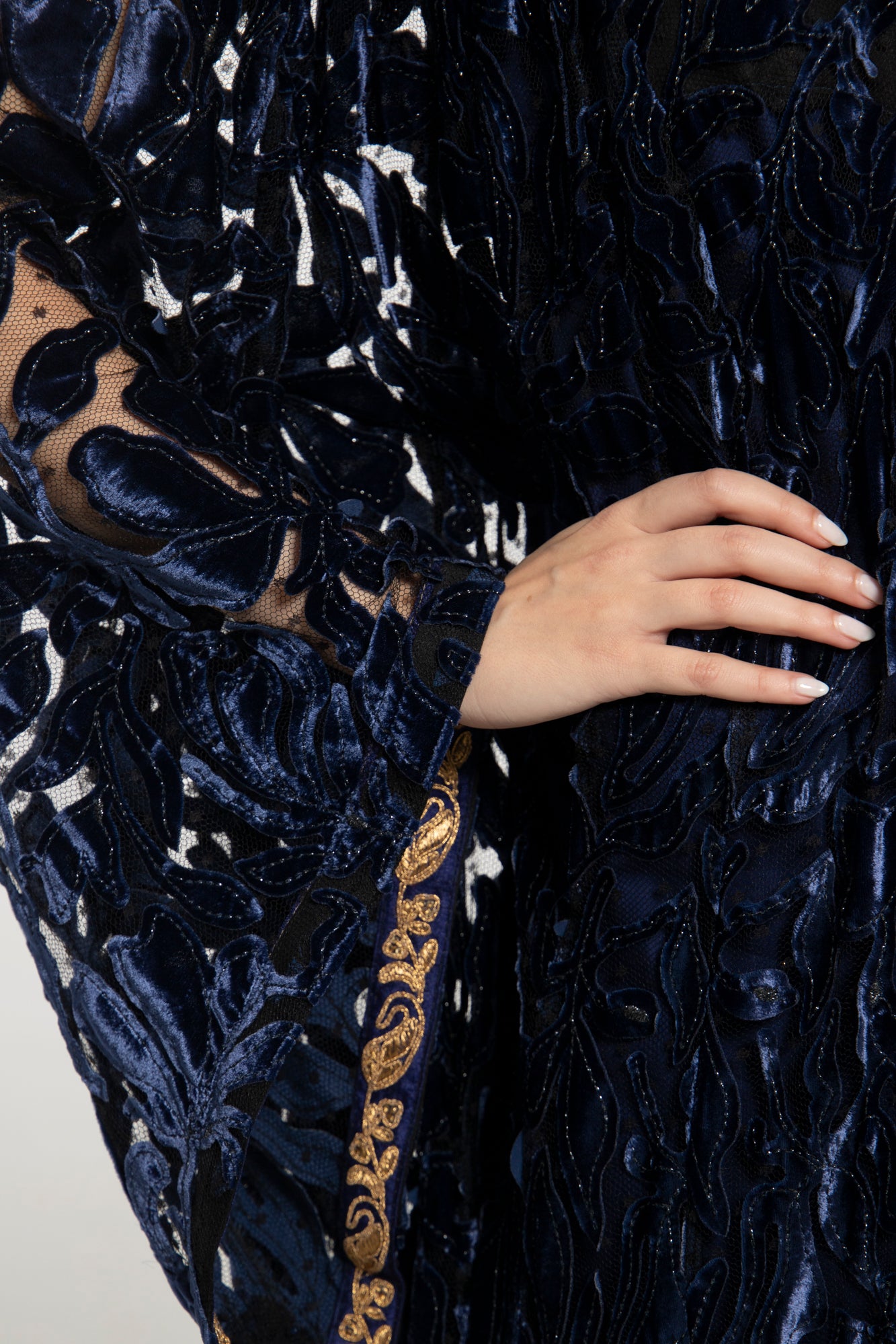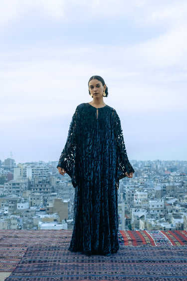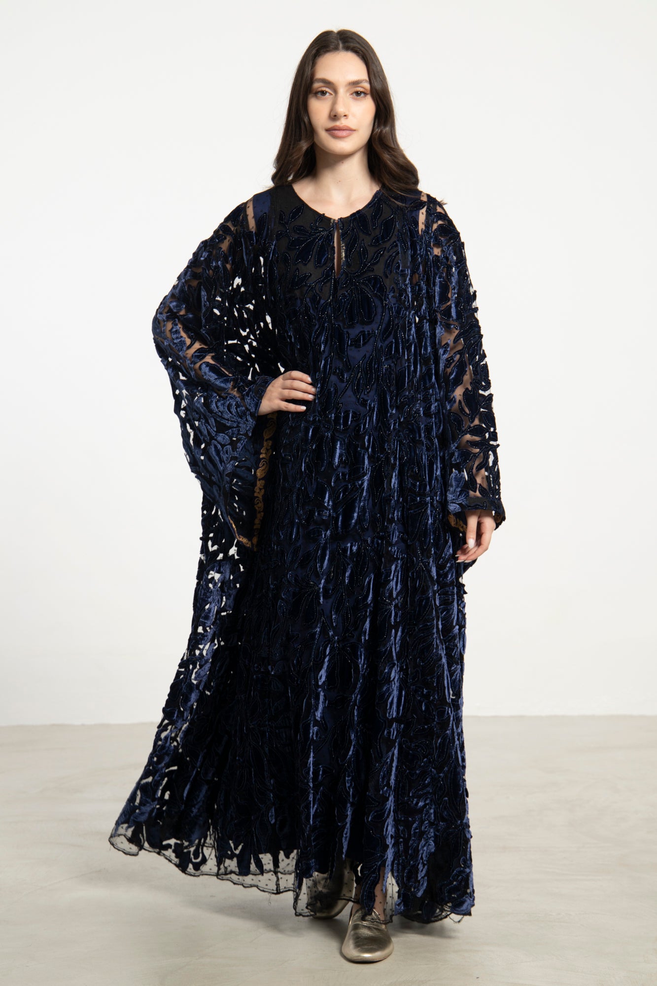 A statement evening piece, the Samara Dress is crafted from rich navy velvet devoré. Its fluid silhouette and intricate floral pattern create a dramatic interplay of opacity and sheer, while wide sleeves and a floor-length cut enhance its elegance.