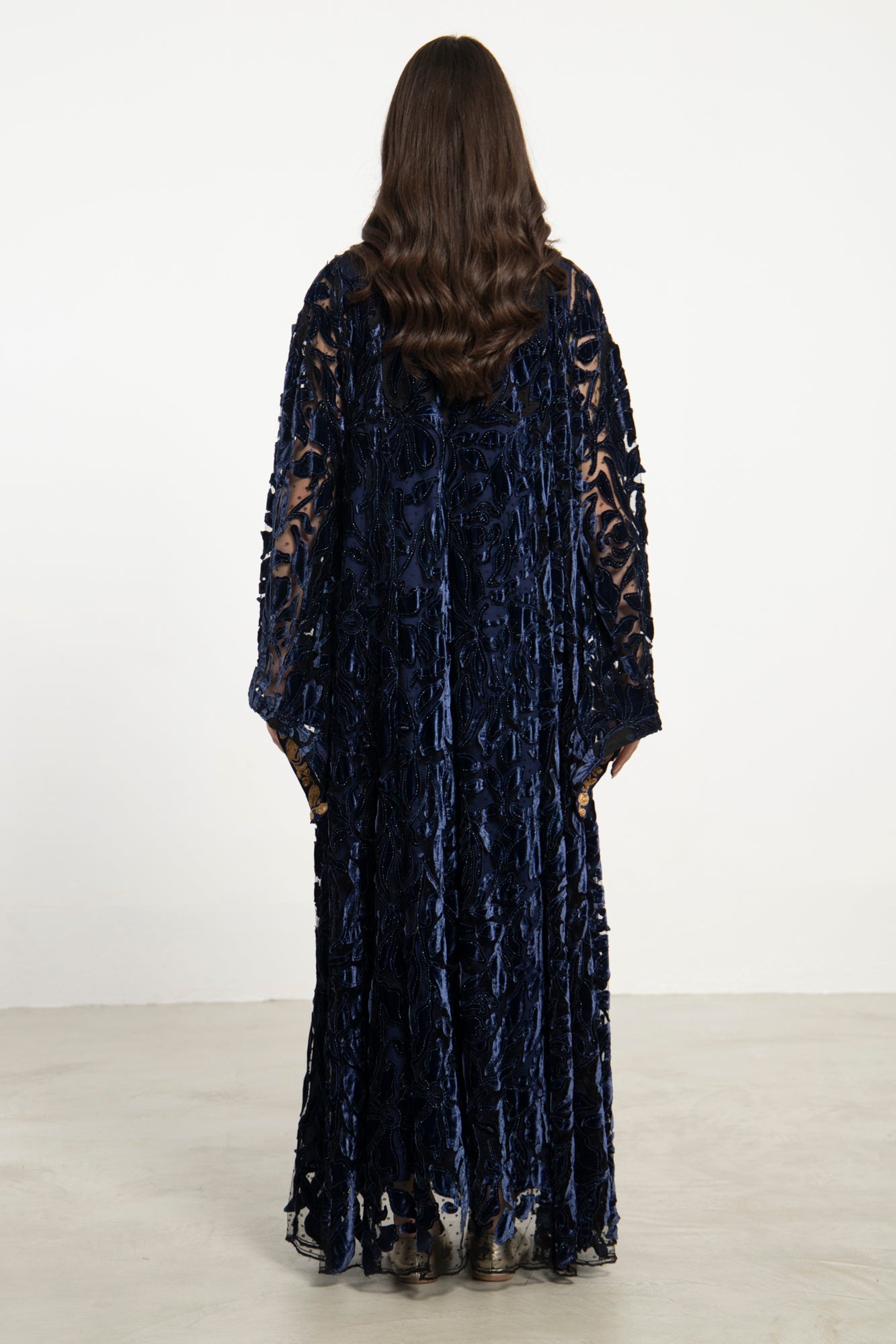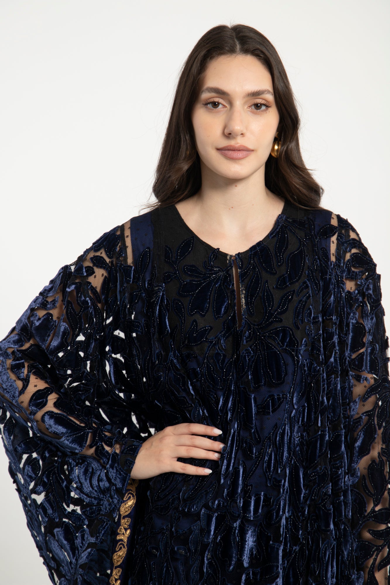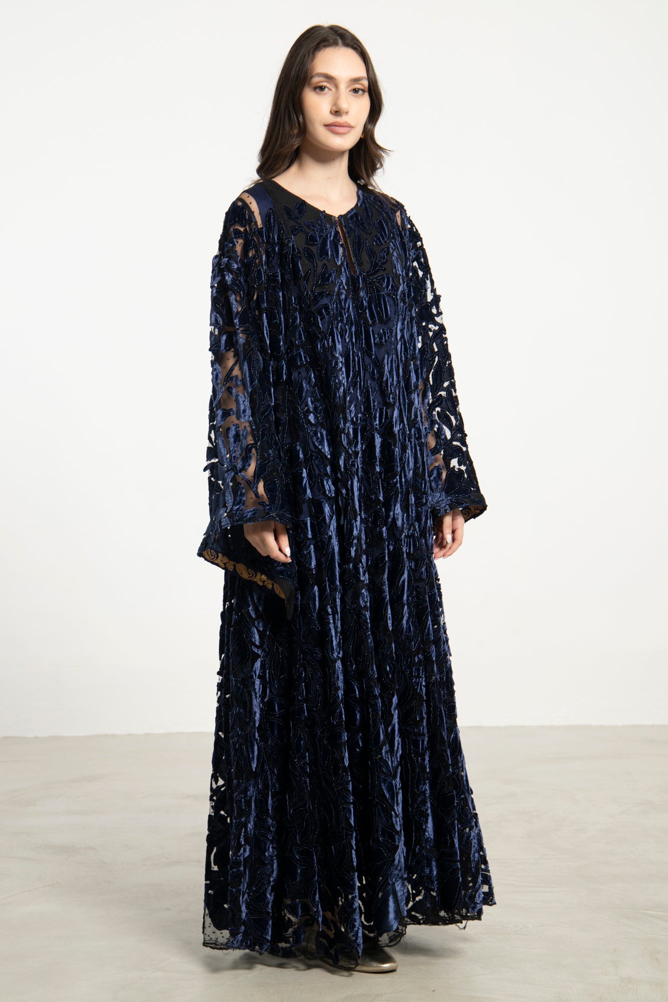 A statement evening piece, the Samara Dress is crafted from rich navy velvet devoré. Its fluid silhouette and intricate floral pattern create a dramatic interplay of opacity and sheer, while wide sleeves and a floor-length cut enhance its elegance.
