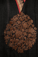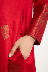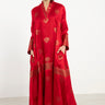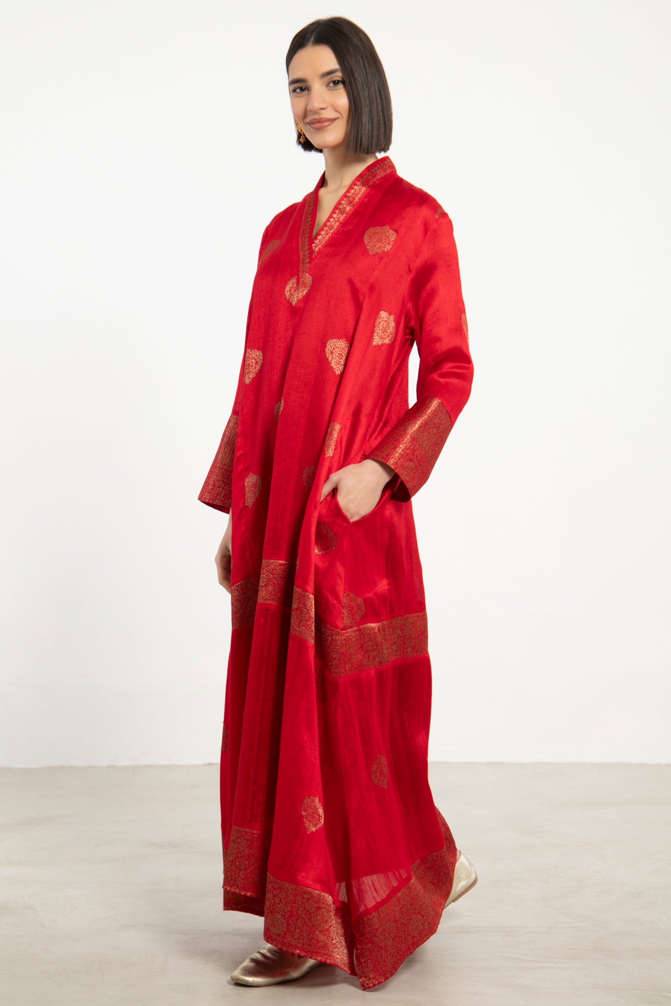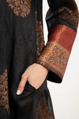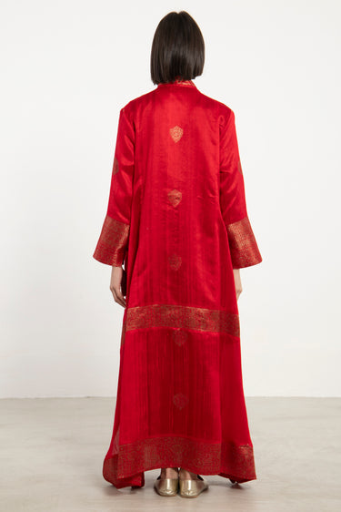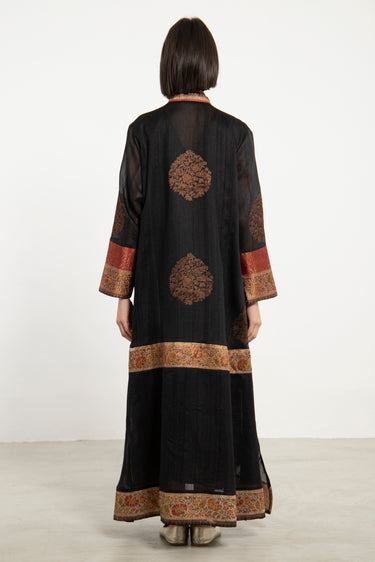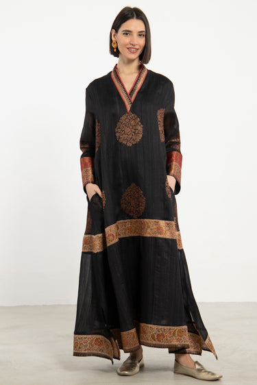 A striking one-of-a-kind piece, the Soula Dress is crafted from silk and adorned with intricate golden motifs and borders. This dress features a flowing cut, long sleeves, and an ornate front panel, offering timeless elegance.