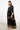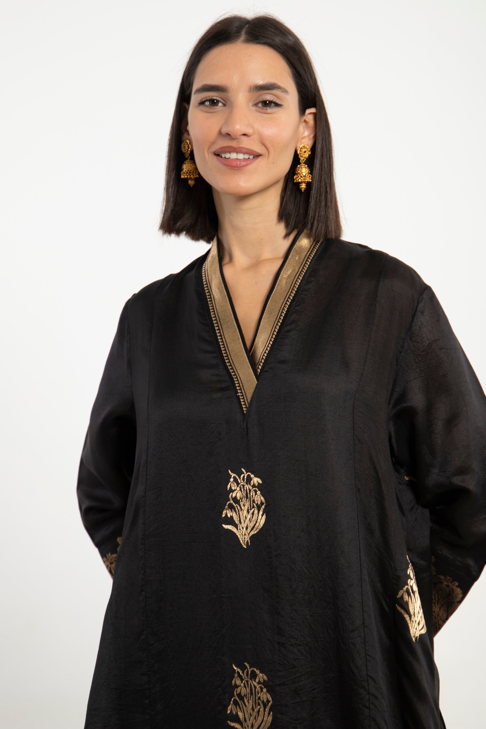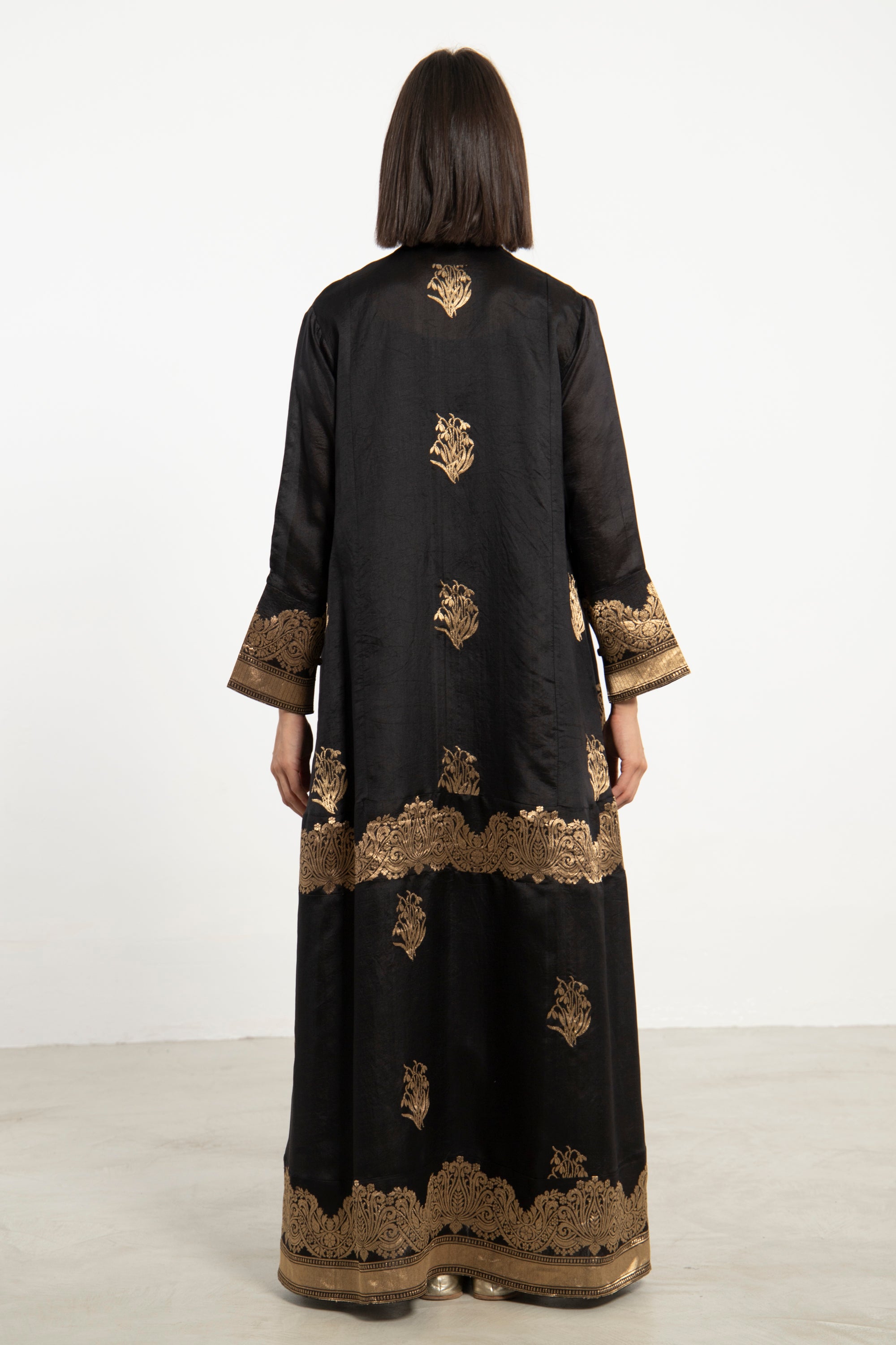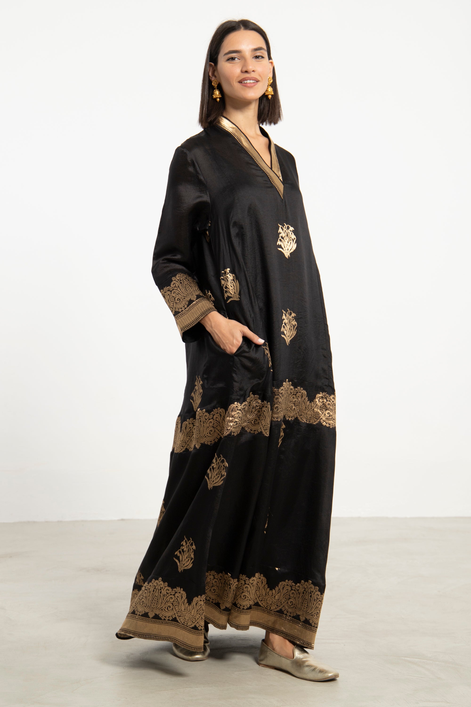 A striking one-of-a-kind piece, the Soula Dress is crafted from ink black silk and adorned with intricate golden motifs and borders. This dress features a flowing cut, long sleeves, and an ornate front panel, offering timeless elegance.