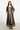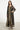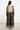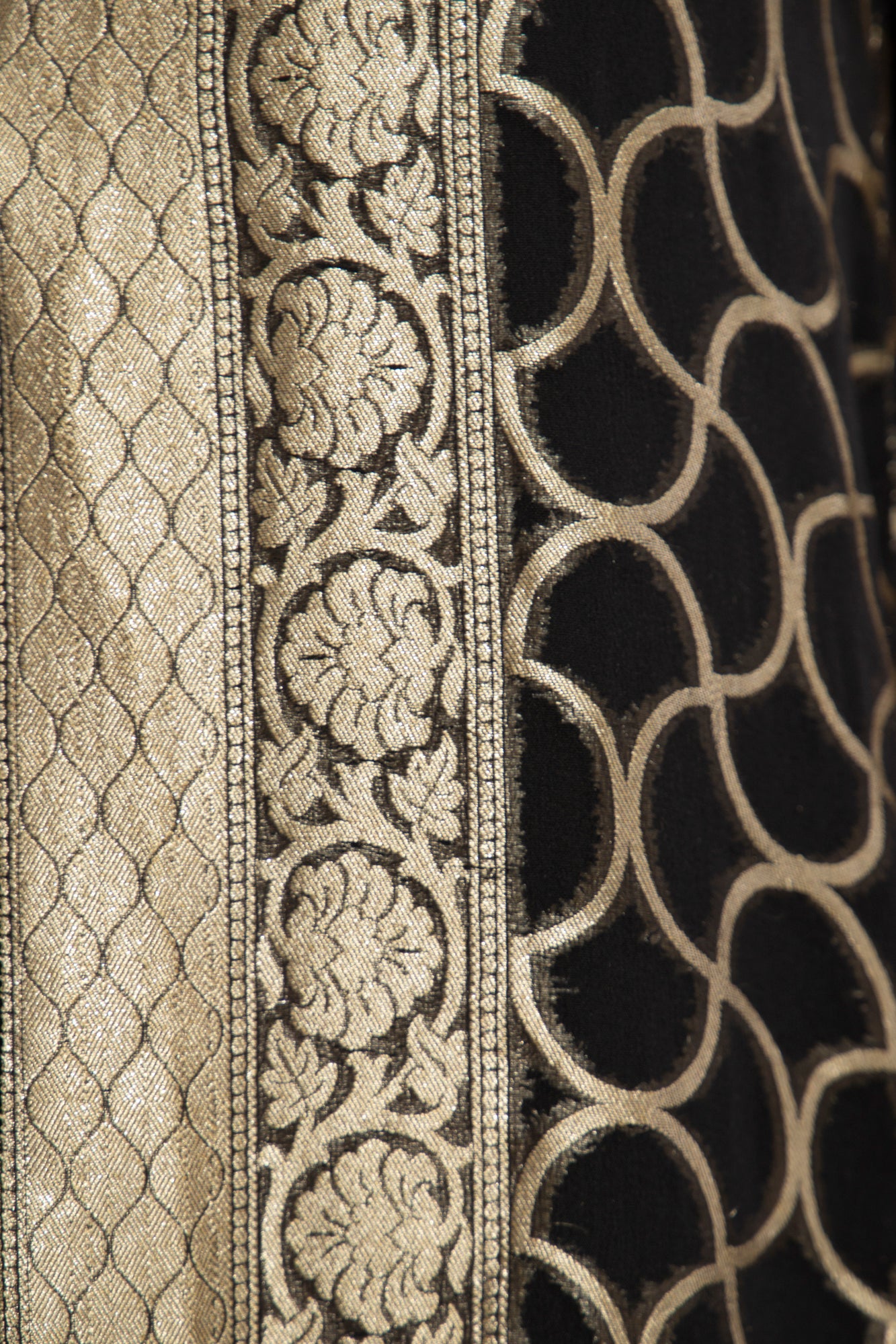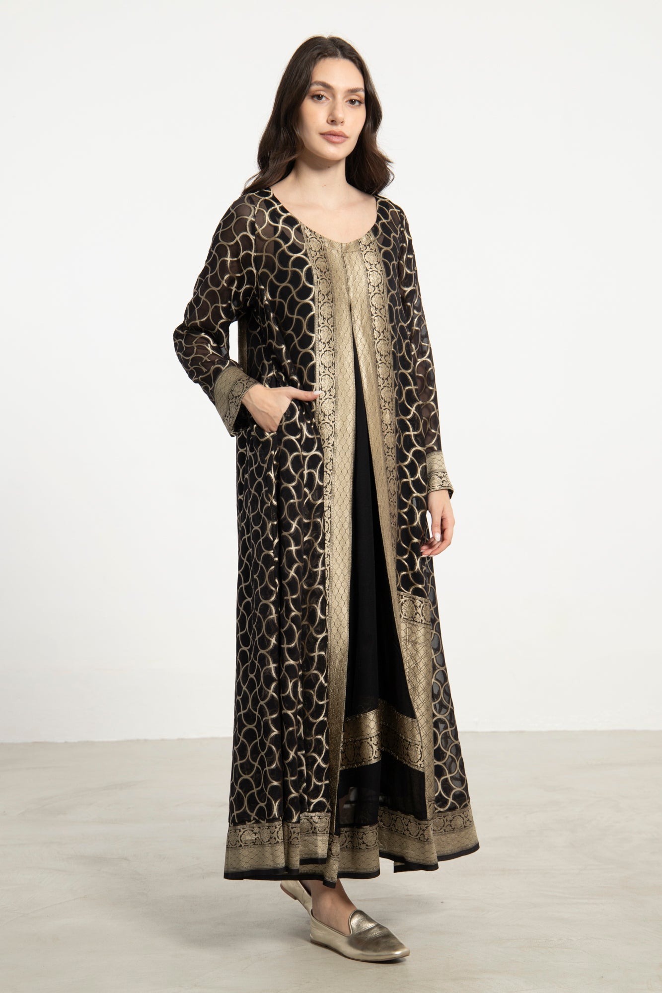 The Souraya Dress combines timeless elegance with intricate craftsmanship, featuring a circular gold motif on black sheer silk, richly trimmed with traditional handwoven silk panels.