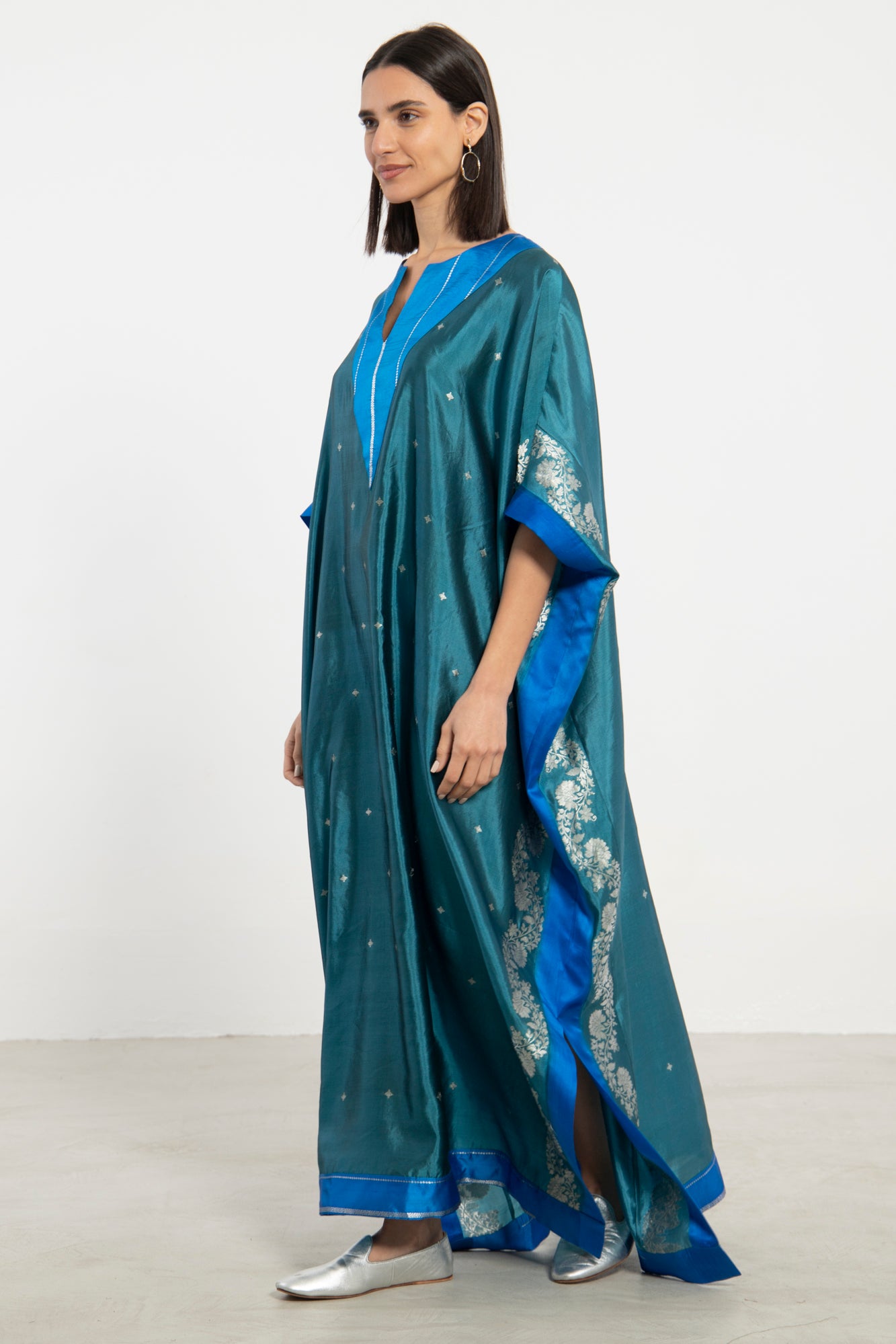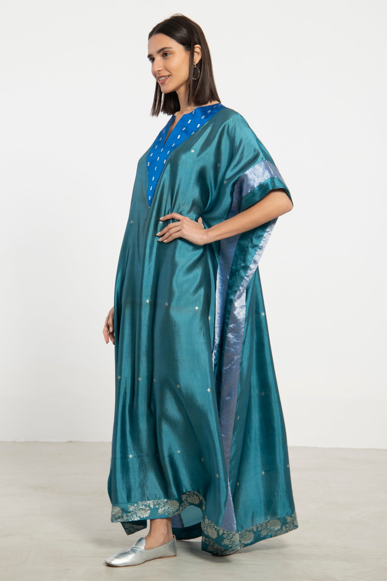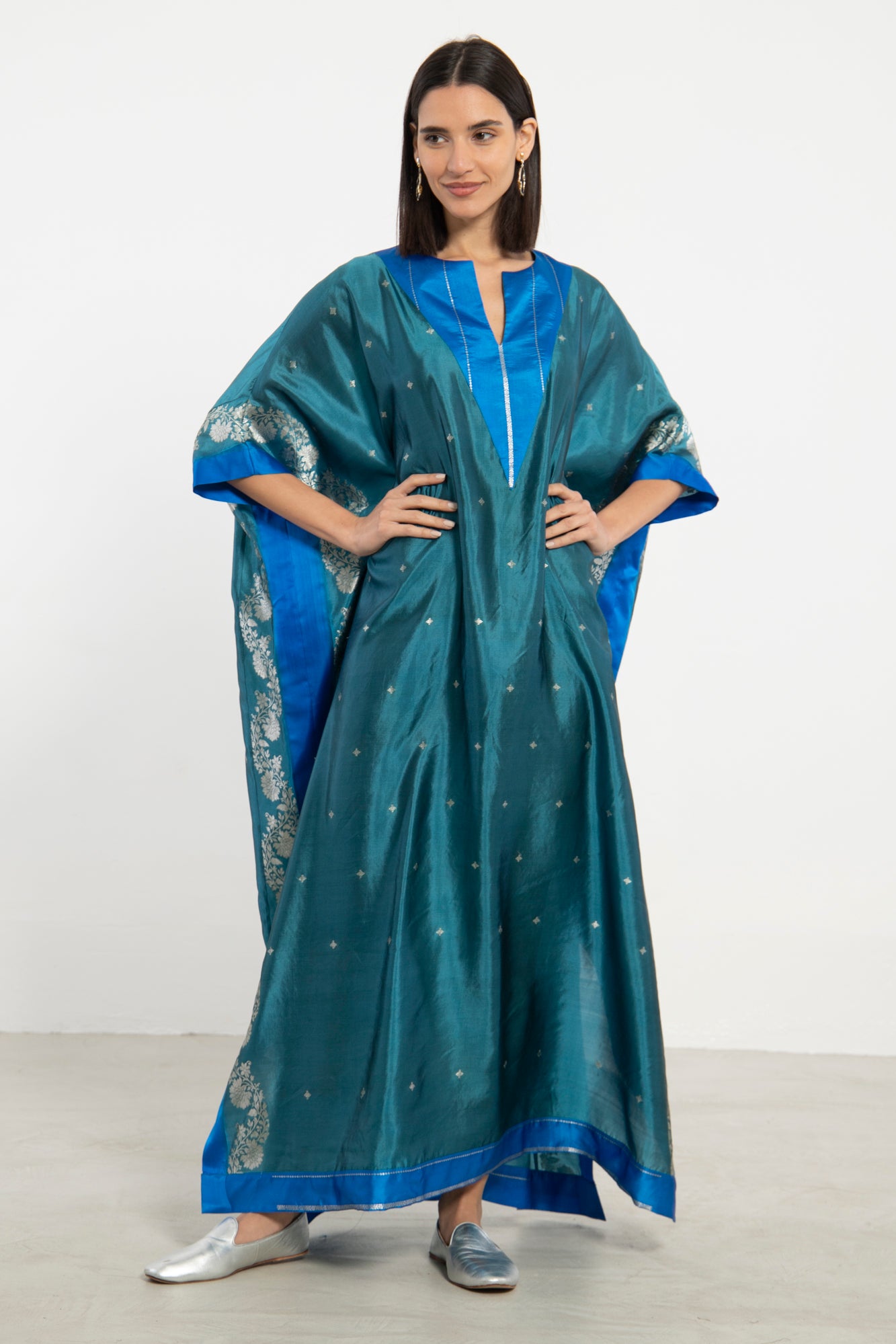 The Tamara Kaftan is crafted from lustrous silk in a rich teal hue, accented with cobalt blue panels and delicate silver embroidery. Its draped, relaxed silhouette is both elegant and comfortable.