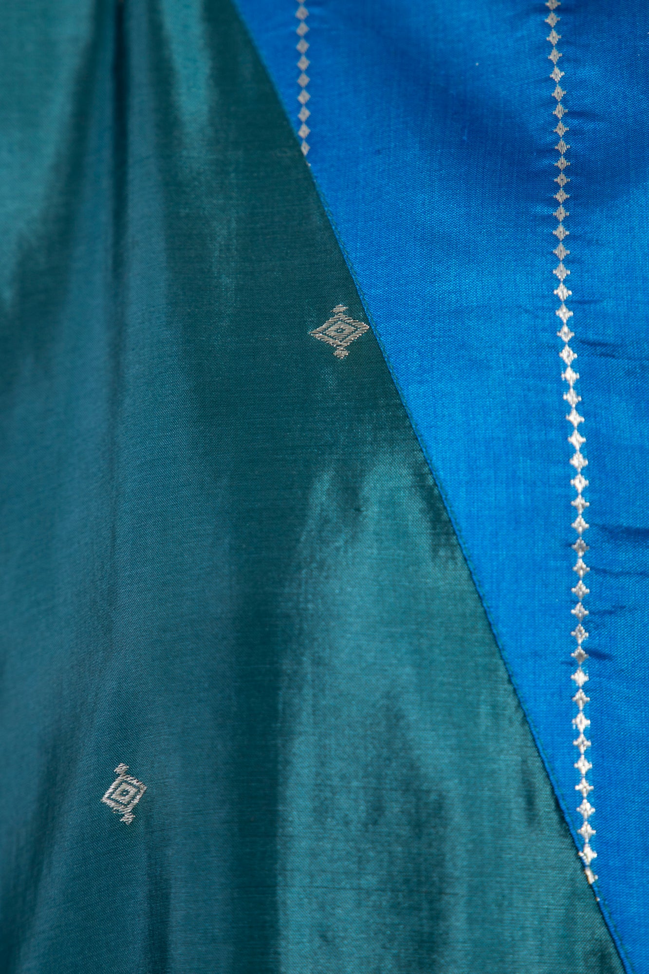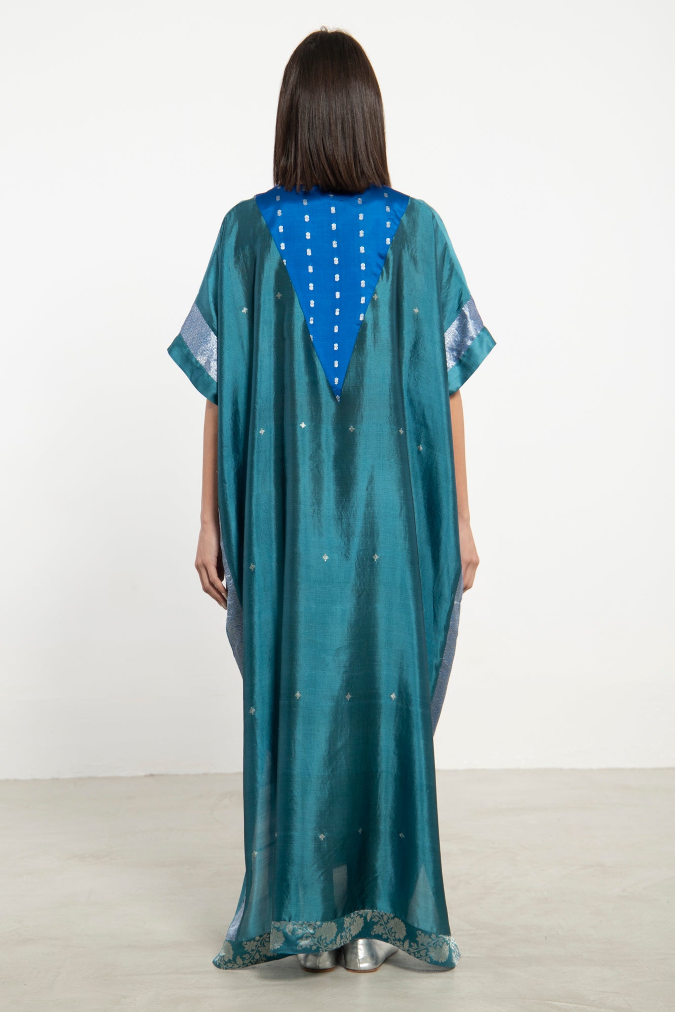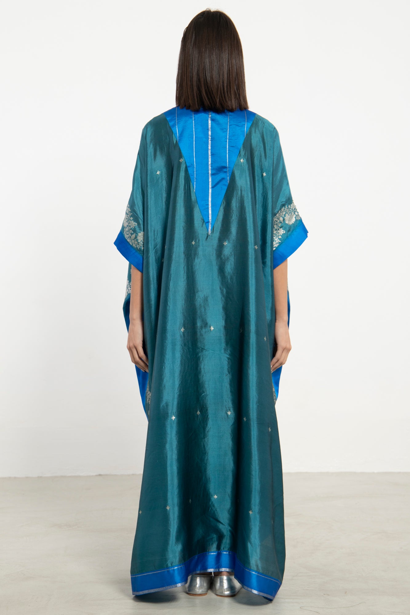 The Tamara Kaftan is crafted from lustrous silk in a rich teal hue, accented with cobalt blue panels and delicate silver embroidery. Its draped, relaxed silhouette is both elegant and comfortable.