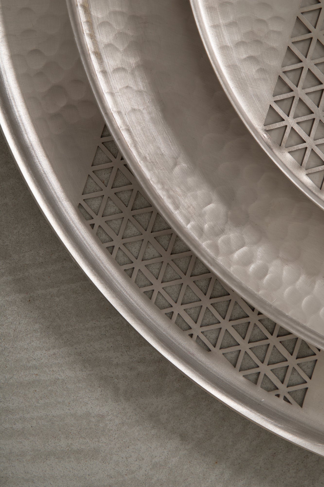 A refined trio of round trays featuring hand-hammered surfaces and a signature Arabesque cutout detail. Available in tinned or brushed brass, each piece is crafted to serve or display with timeless elegance.