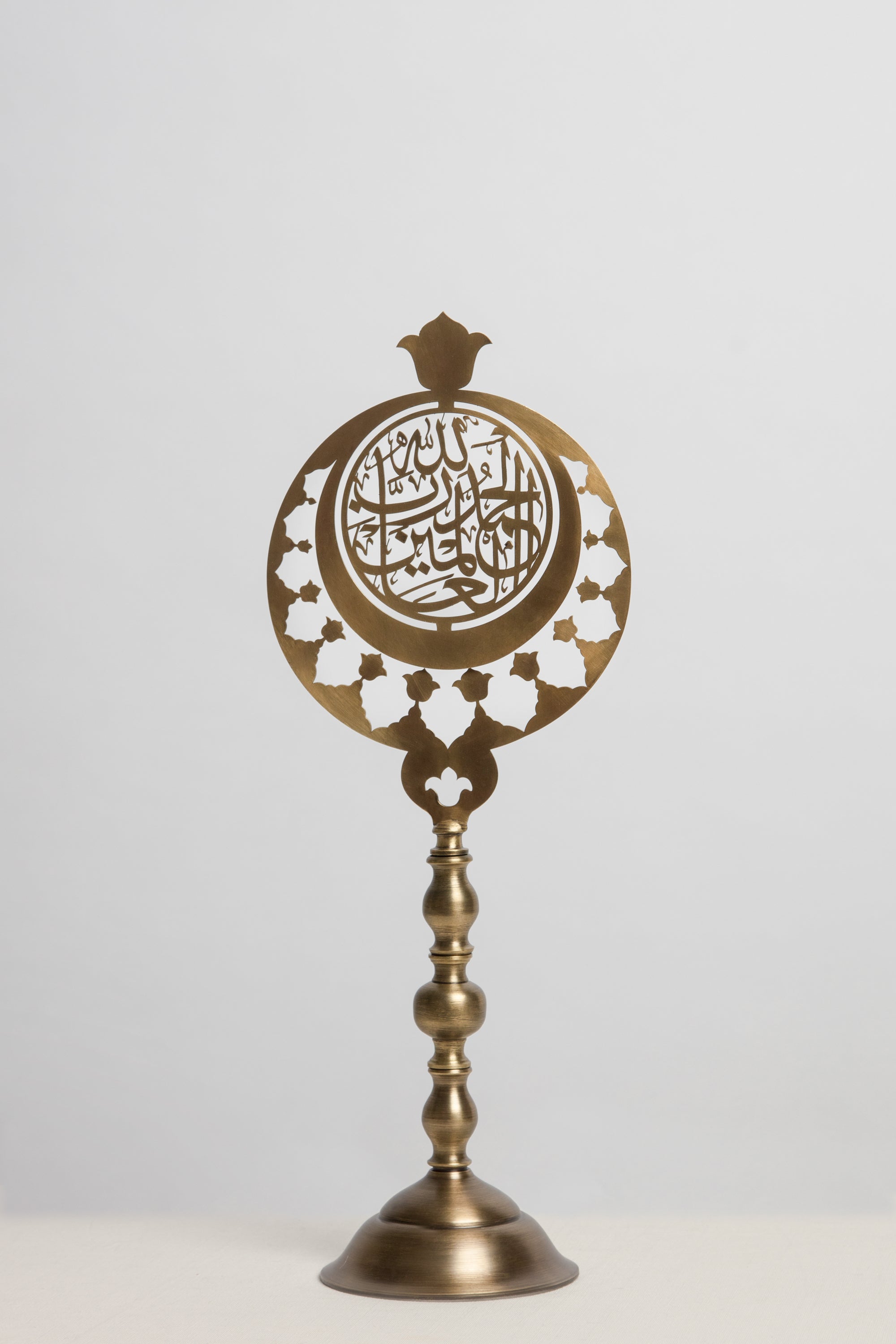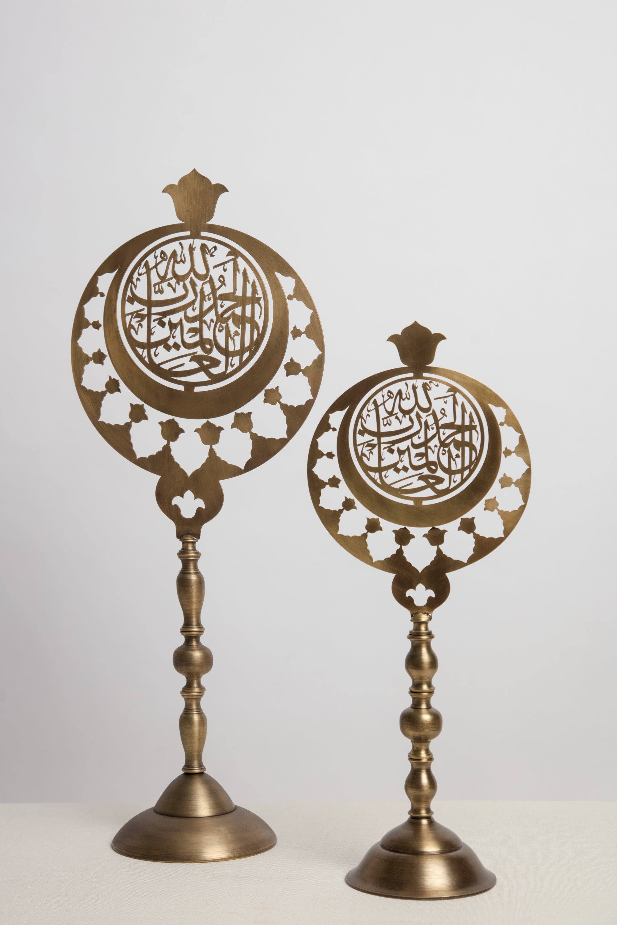 Originally crafted to ornate domes of mosques, these Alems have been revisited to embellish corners in homes. Combining blessings and an array of classical islamic ornaments, these Alems are made of cast and chiseled brass.