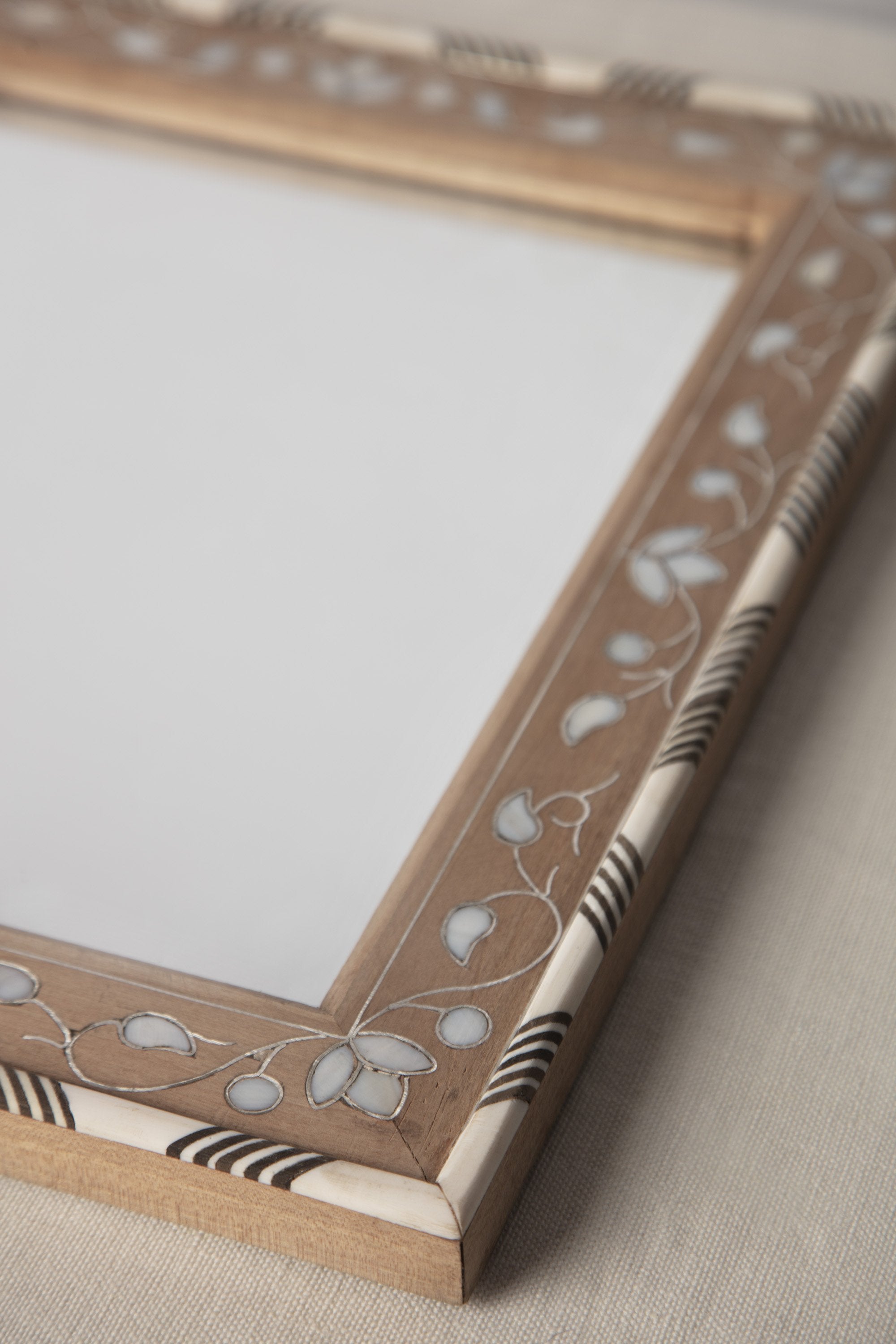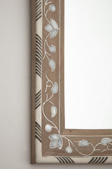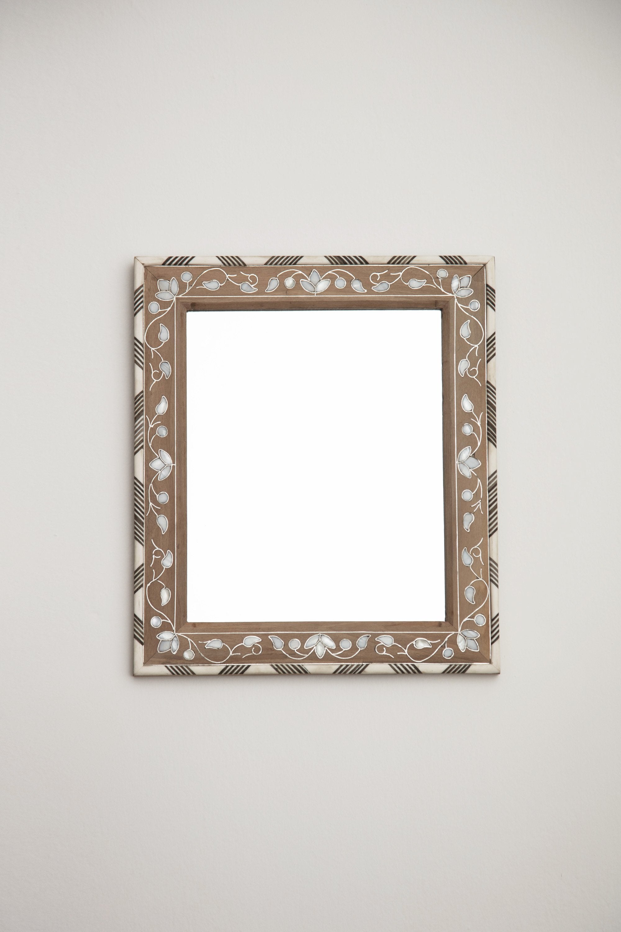 Handcrafted by skilled artisans with a mother of pearl intricate flower-like shapes inlay, this mirror is best hung in an hallway or in a bedroom.