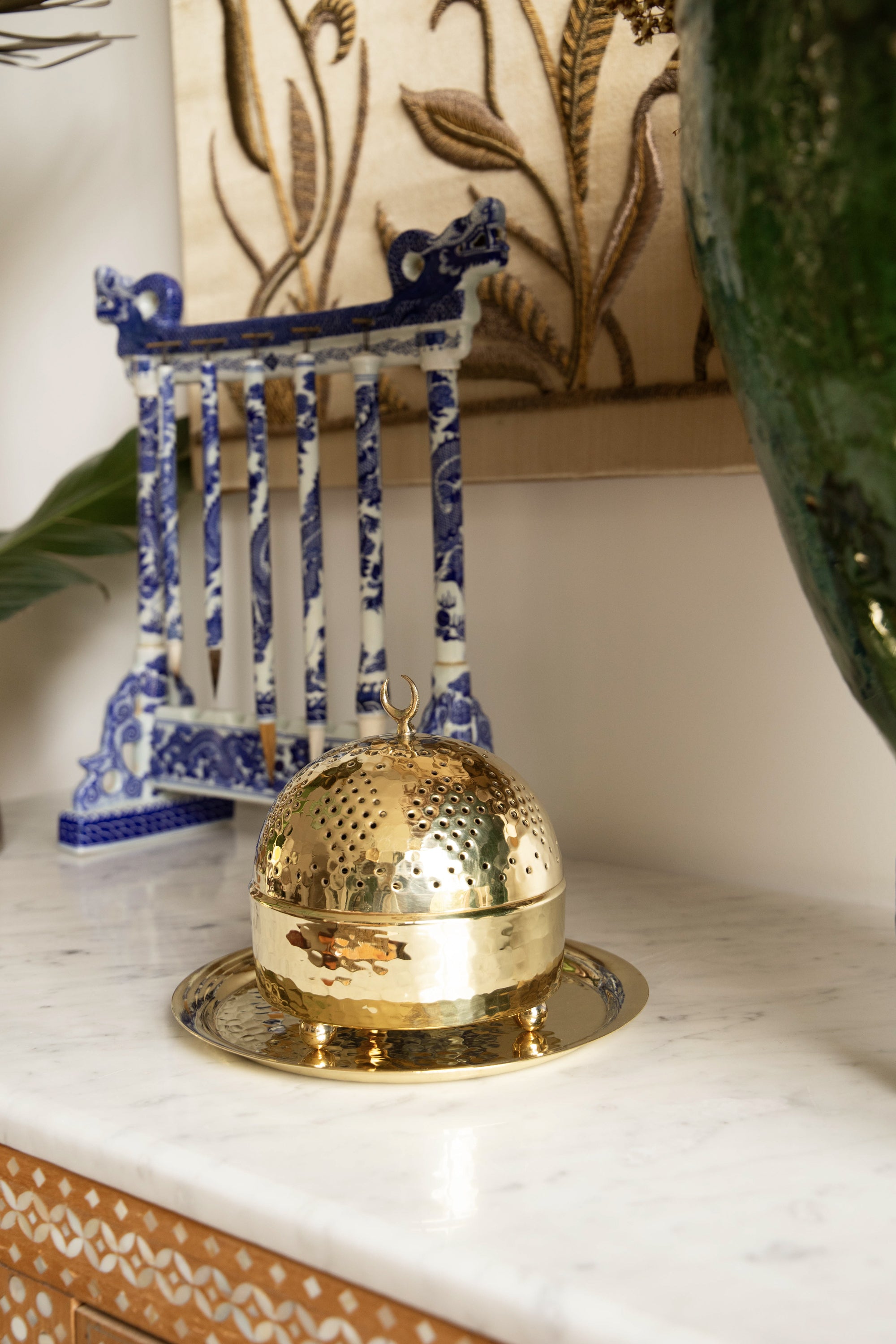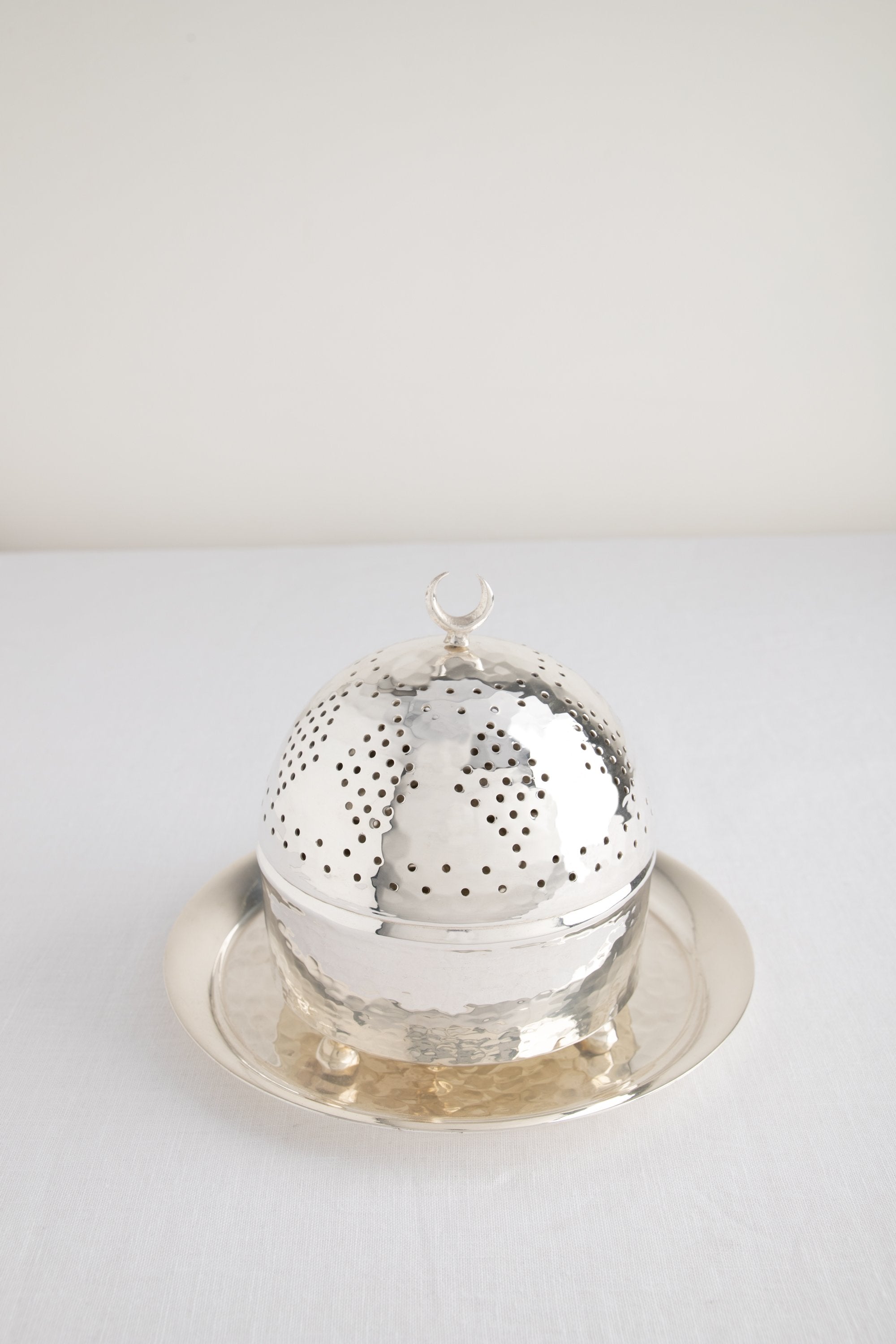 Scents drive memories and emotions, and they can be essential in setting the mood. To help you balance an atmosphere or creating a space of tranquillity in your everyday life, we have designed a timeless incense burner. The lower compartment is where the incense is placed, covered by a perforated disc with a handle for easy lifting and a perforated top cover with a decorative crescent on top. This incense burner comes with a tray for easy transportation when circulating in between rooms.