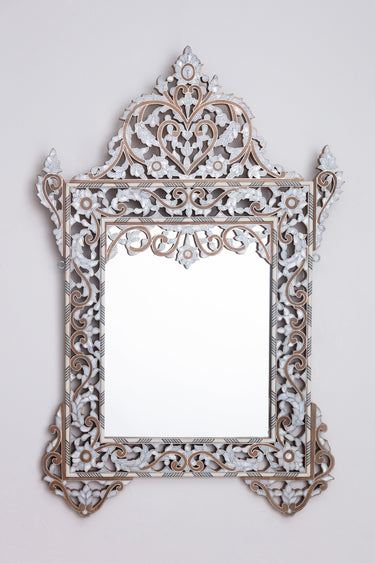 Timeless and romantic, this mother of pearl mirror mimics the classic Levant lacework design. Entirely handcrafted with mother of pearl inlay, our exclusive walnut wall mirror is an understated essential in the living room, above the mantel or in a bedroom.