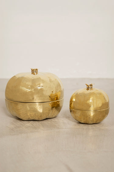 Inspired by the form of the pomegranate, this elegant set of two lidded boxes offers both decorative charm and practical use. Hand-hammered and crafted in either silver-plated or brushed brass finishes, they add a refined accent to any space.