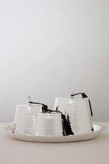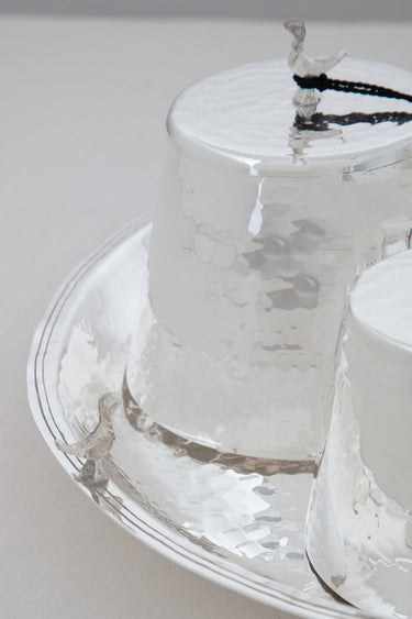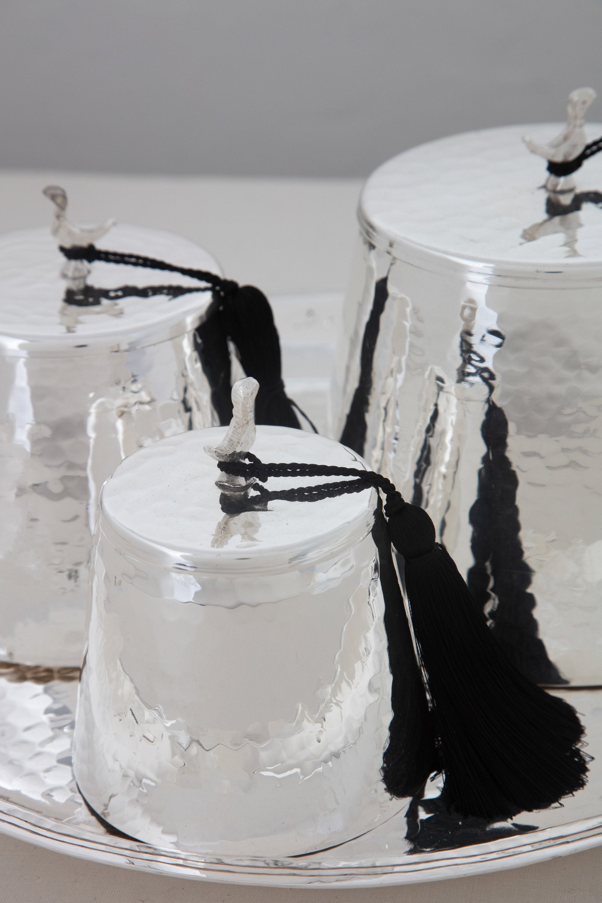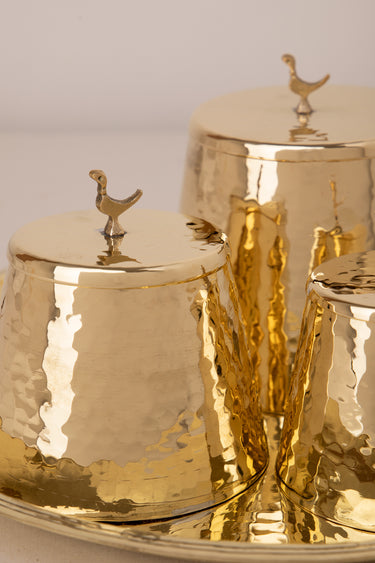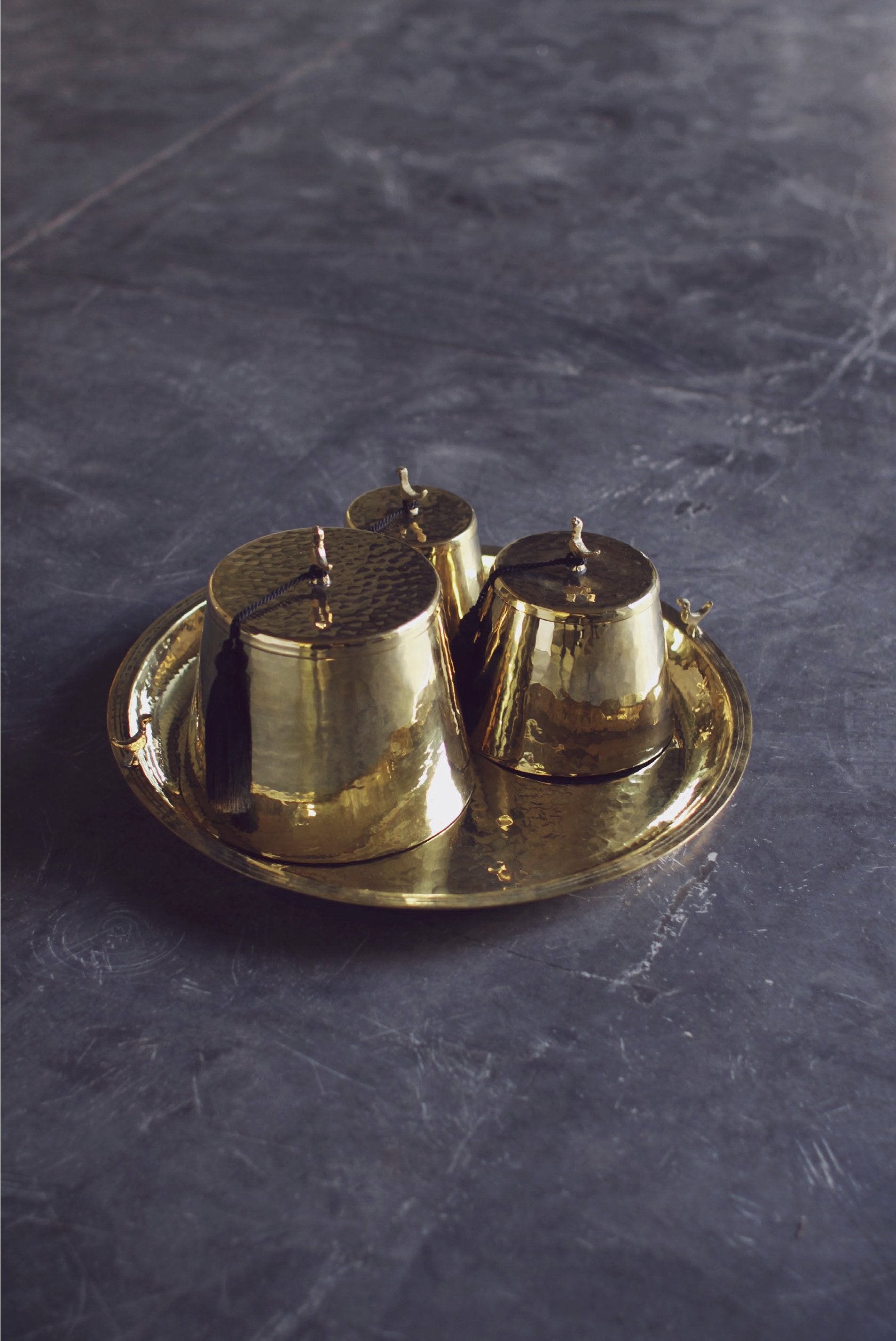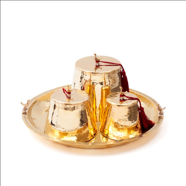 In a set of three, these tarbouch boxes are made in golden brushed brass or silver plated brass. They are accompanied by a tray. These make the perfect gift for a house warming.