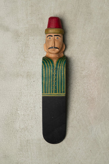 A charming hand-cut and hand-painted door-stopper featuring a Levantine man or woman in folkloric attire. Each piece is individually crafted and painted, making every figure a unique blend of artistry and function.