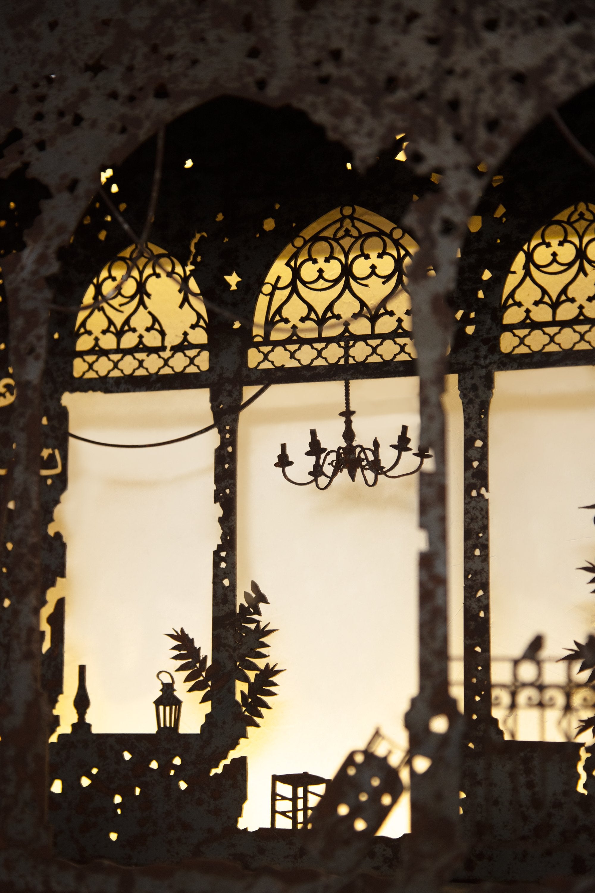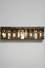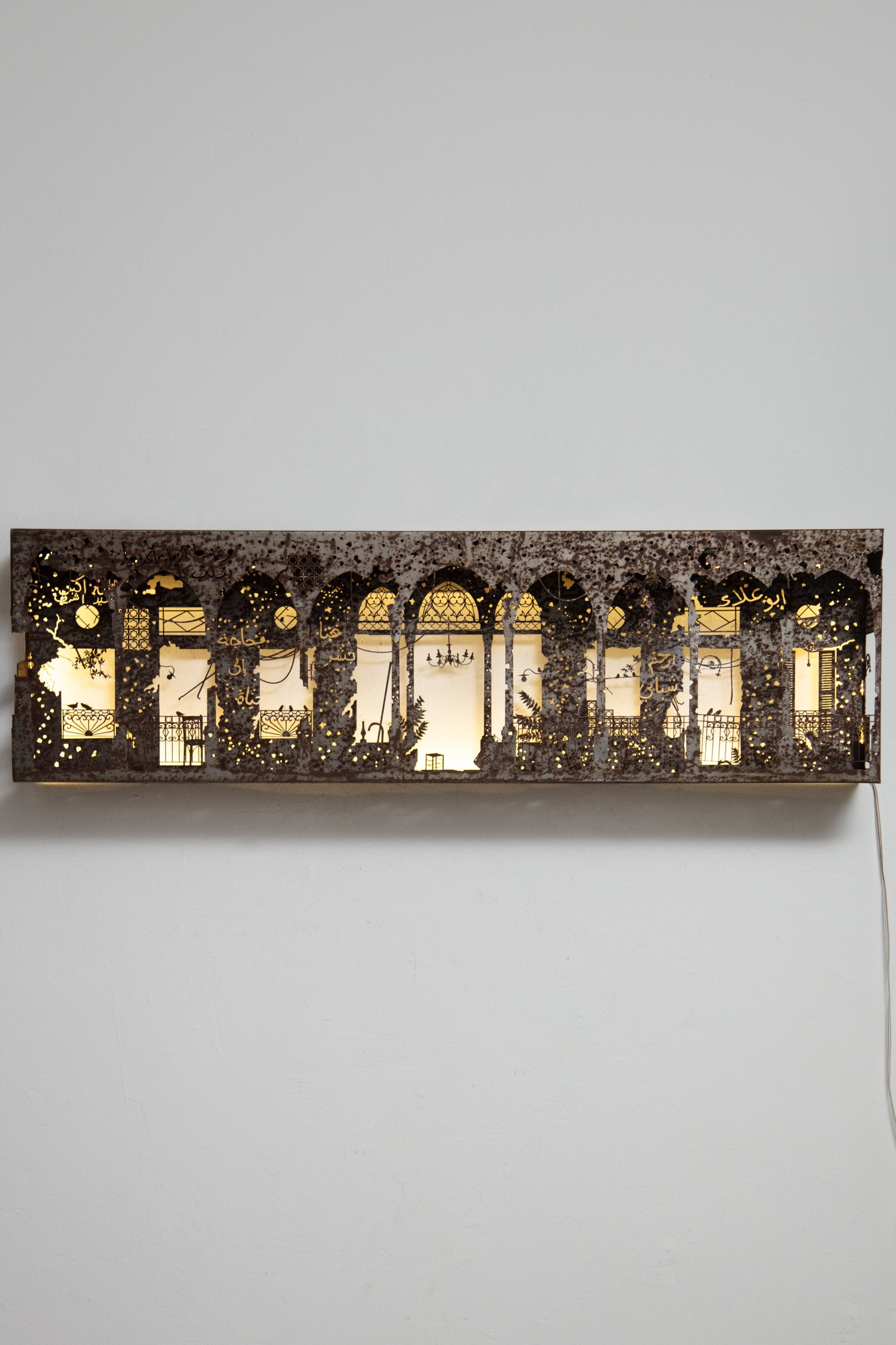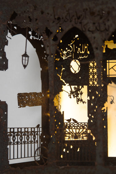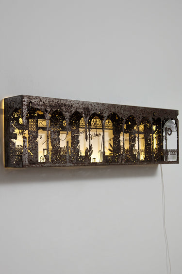 Part of a limited edition series, this sculptural mural pays tribute to a vanished Beirut residence once admired for its Art Deco lines and distinctive wrought iron façade. Crafted in oxidized steel and subtly illuminated with integrated LED lights, it evokes the architectural soul of a city in flux.