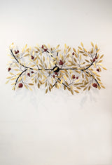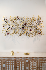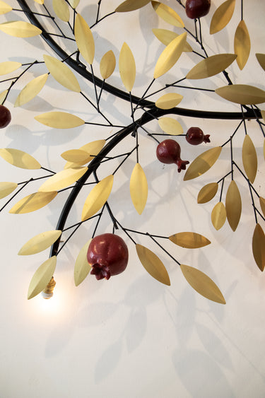 Like a beautiful sculpture crafted in an elegant nature-inspired piece, the brass leaves sit effortlessly on iron branches with meticulously handmade pomegranates in ceramic. Featuring soft beaming lightbulbs, this piece shines over a fireplace, sofa or a bed.