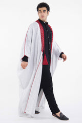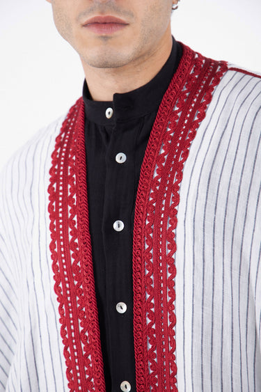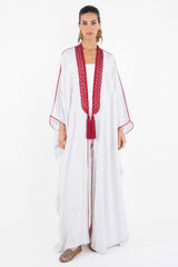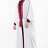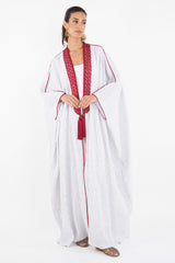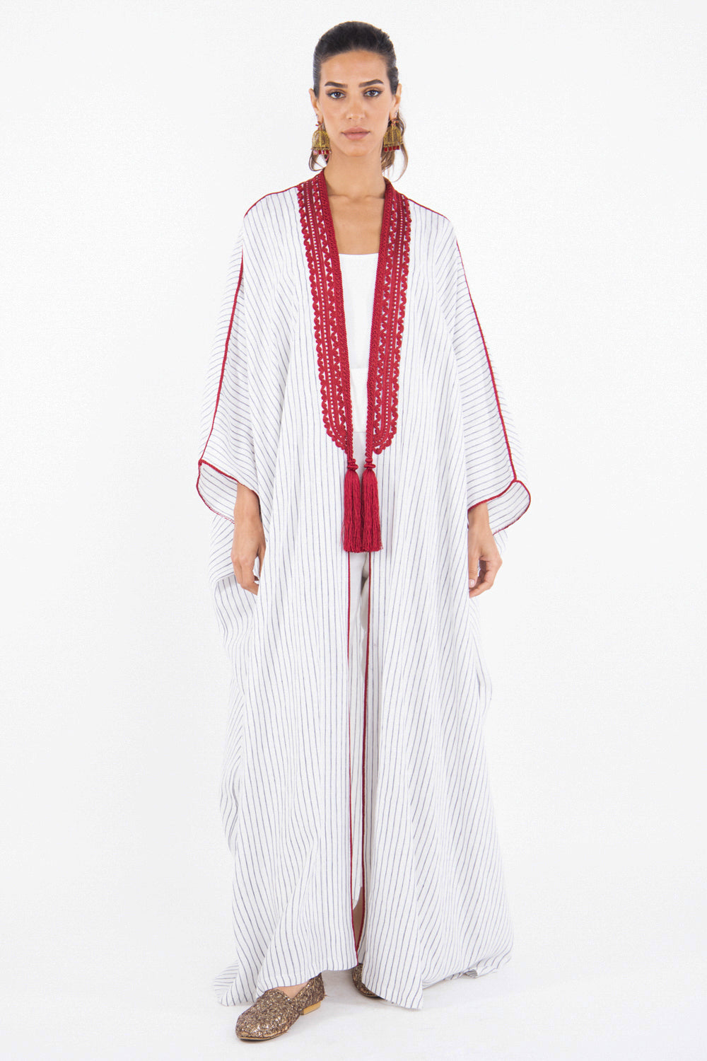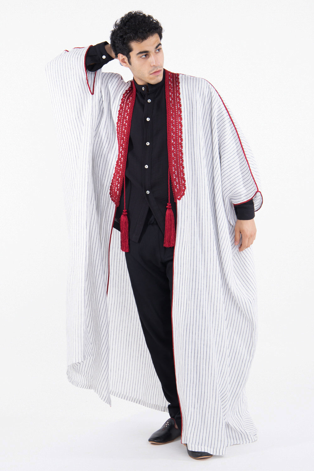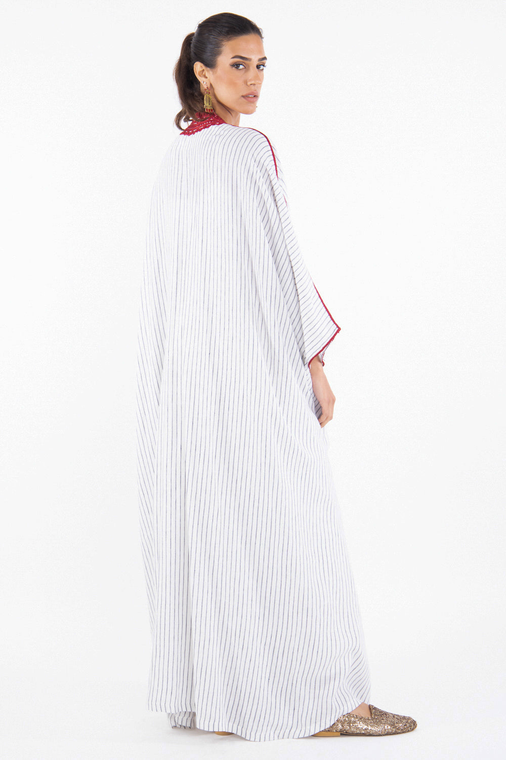 Experience the beauty and elegance of our linen abaya. Adorned with intricate red embroidery on a classic black and white striped linen, this abaya is the perfect blend of traditional and modern.