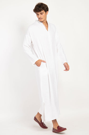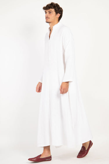 An instant classic, this jellaba is crafted from luxurious Belgian linen and adorned with exquisite embroidery. Fashioned for effortless elegance, it provides all-day (and all-night) comfort.