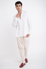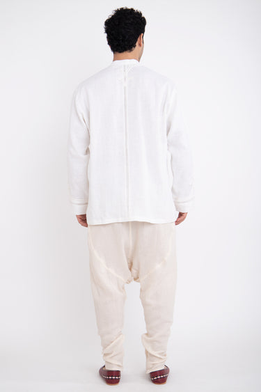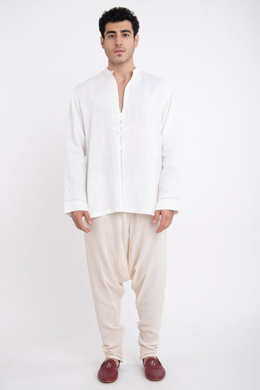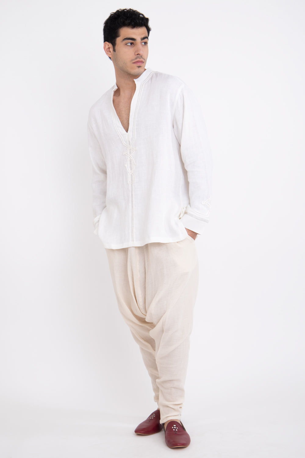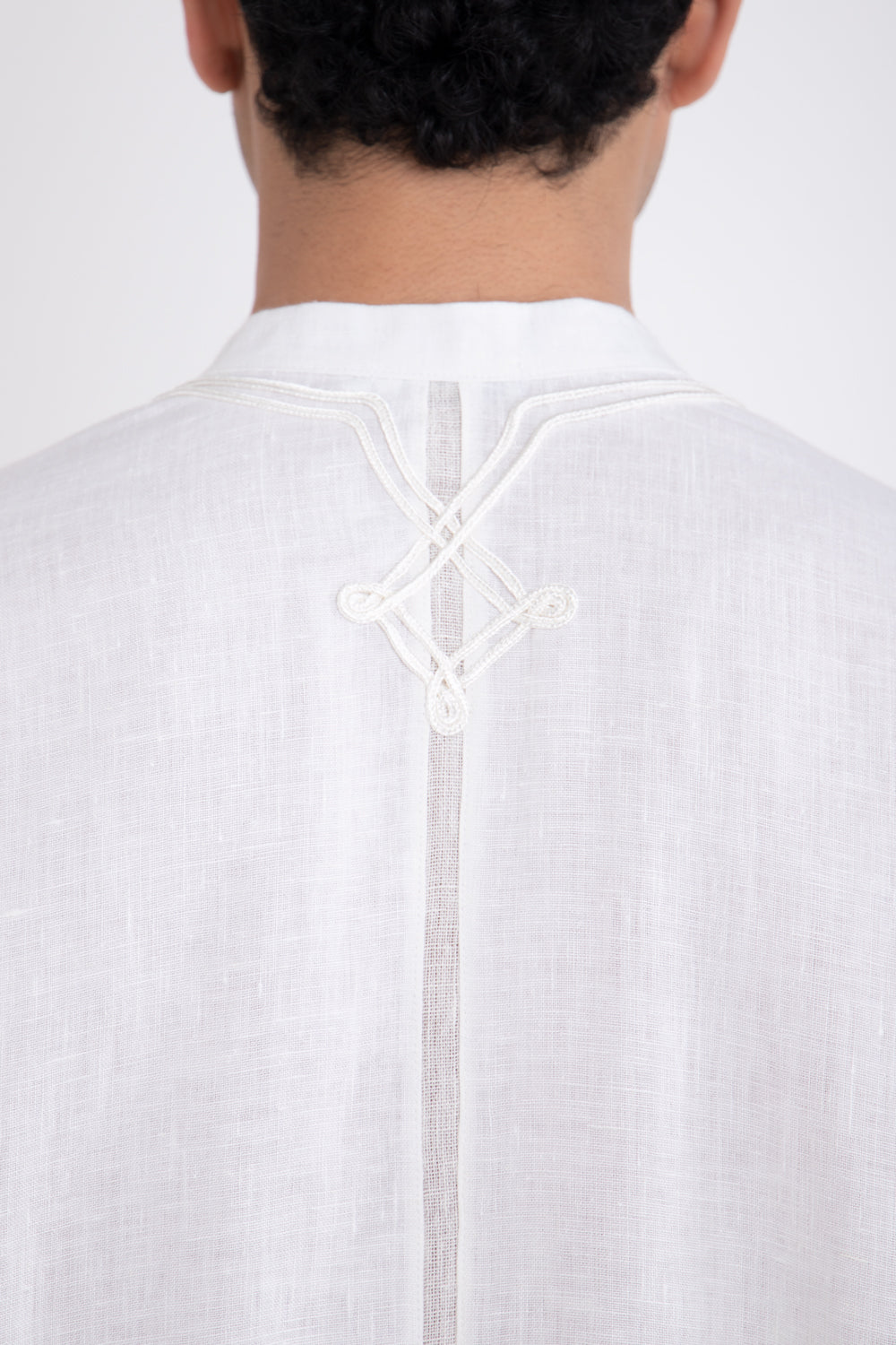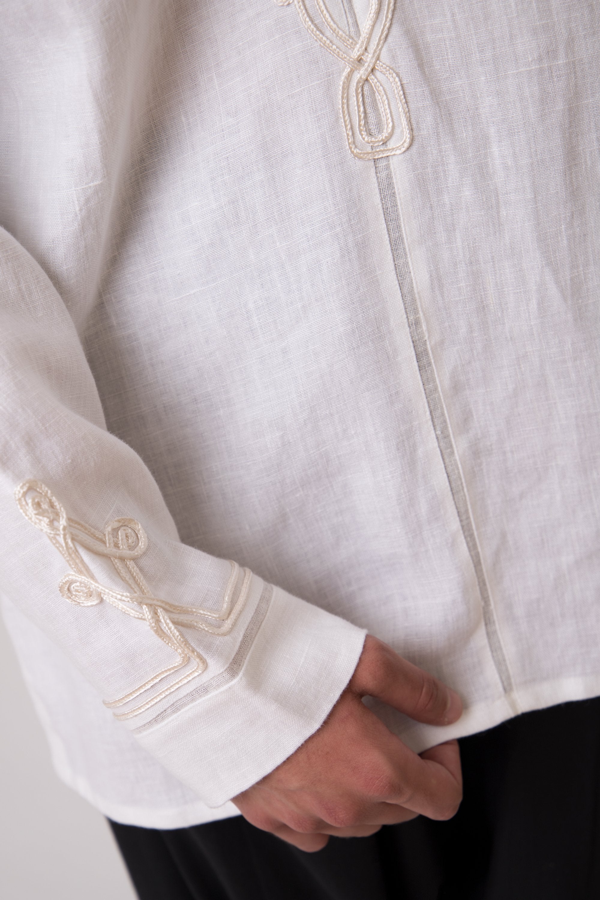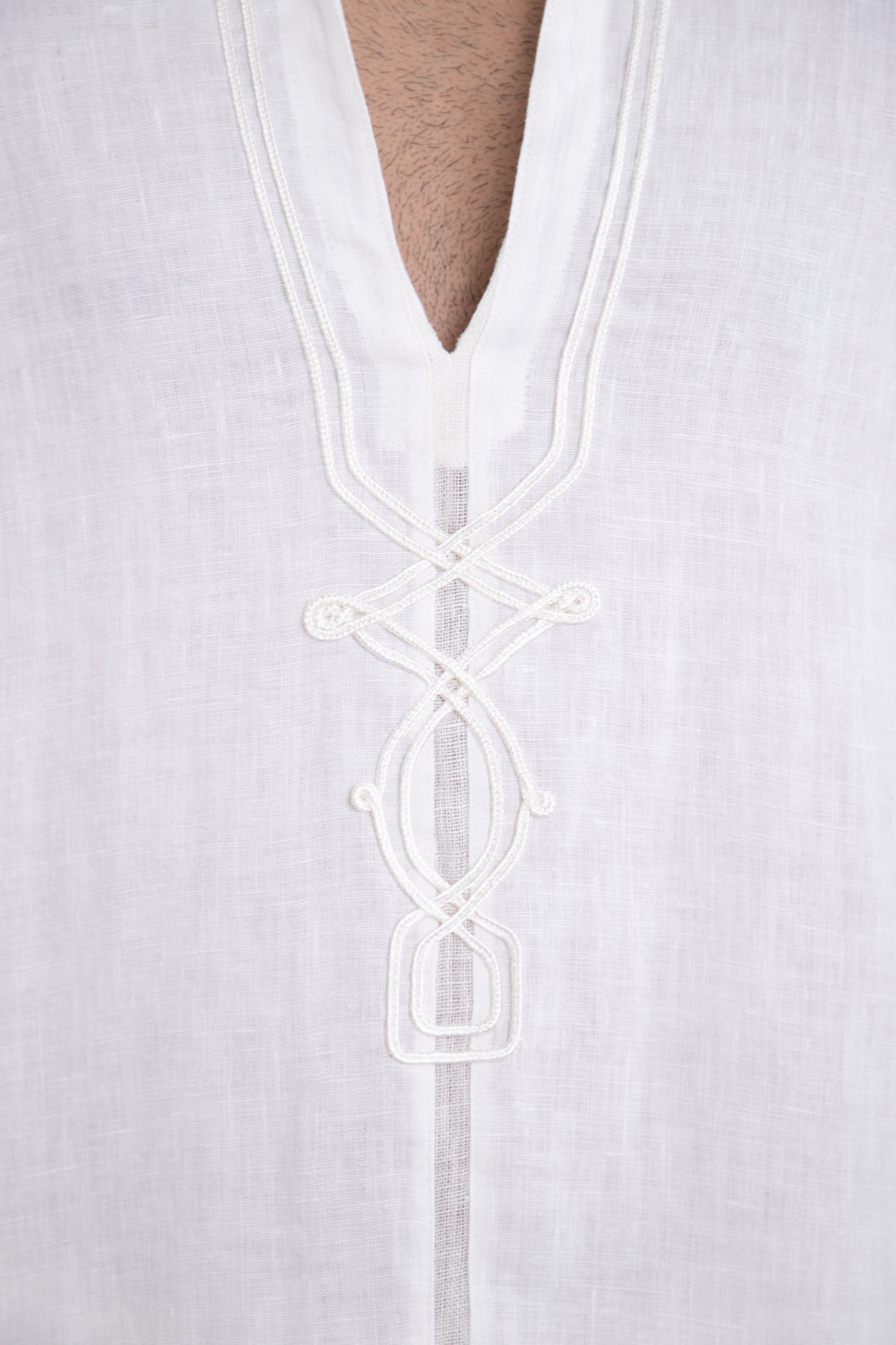 Crafted from Belgian linen, the "Jerusalem" shirt features embroideries with fine threads of silk and a deep V-neck.