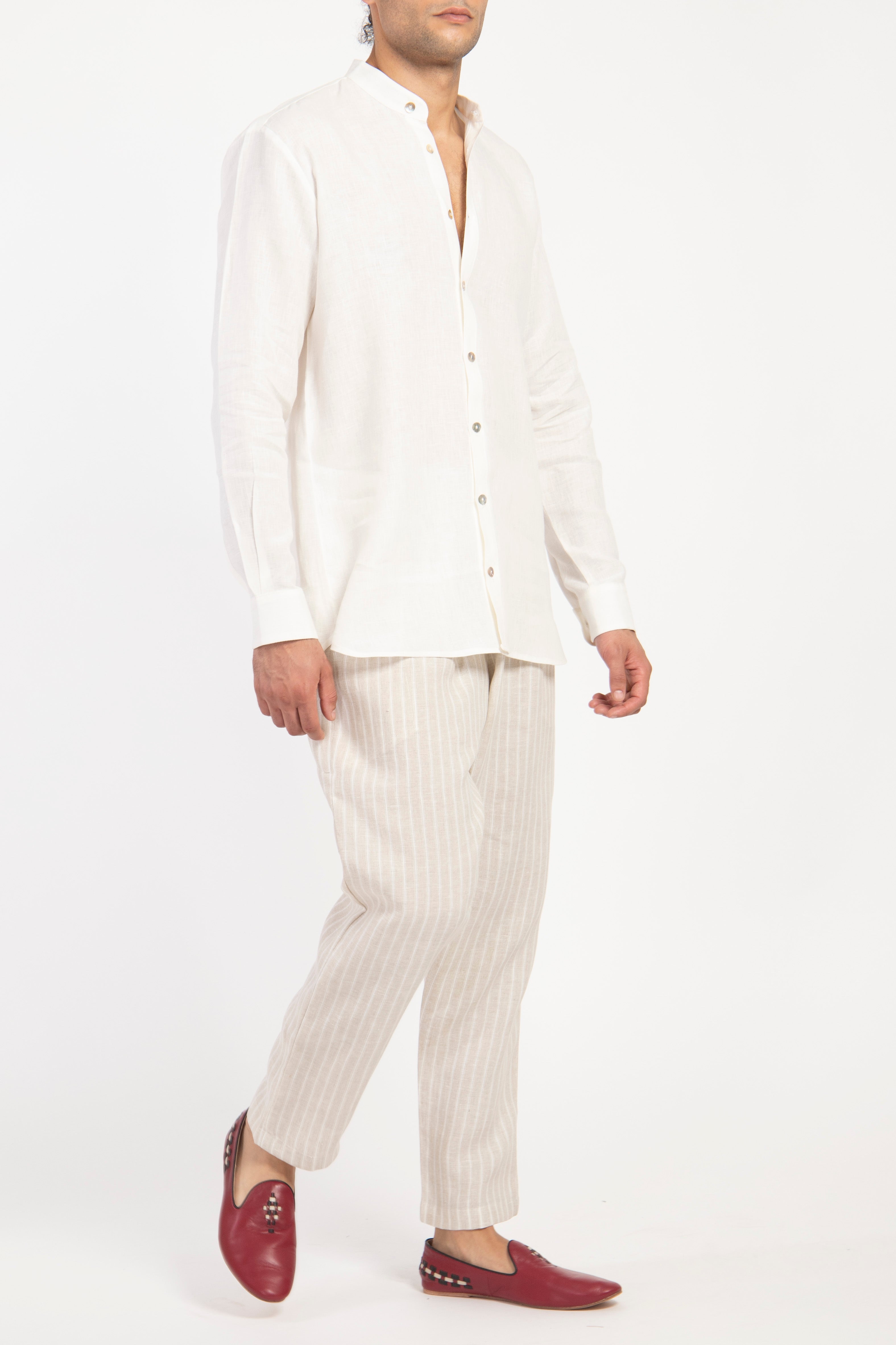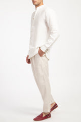 Effortlessly chic and supremely comfortable, these linen trousers are a wardrobe essential. Designed with a relaxed, slightly tapered fit, they feature a subtle pinstripe pattern that adds a touch of sophistication. The elastic waistband ensures a flexible and easy fit, making them perfect for all-day wear.